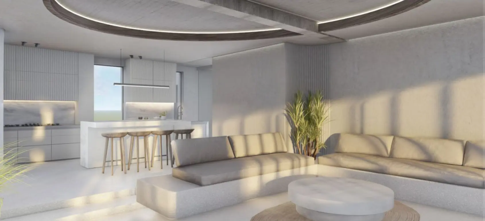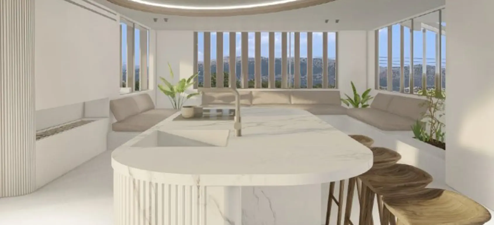 Indoor Lounge and dining area. - Build - in sofa with light gray fabric cousions - Oval Yuta carpet - Circular Marble table - Wall stripes covering decoration on the arched wall part - Celling lightning Delta Light - Elipse slice element divided with the concrete beam on the ceiling with the Led light on the edges. - Nickel Tap - Massive kitchen island from white Marble - Tractor stools- BASSAMFELLOWS