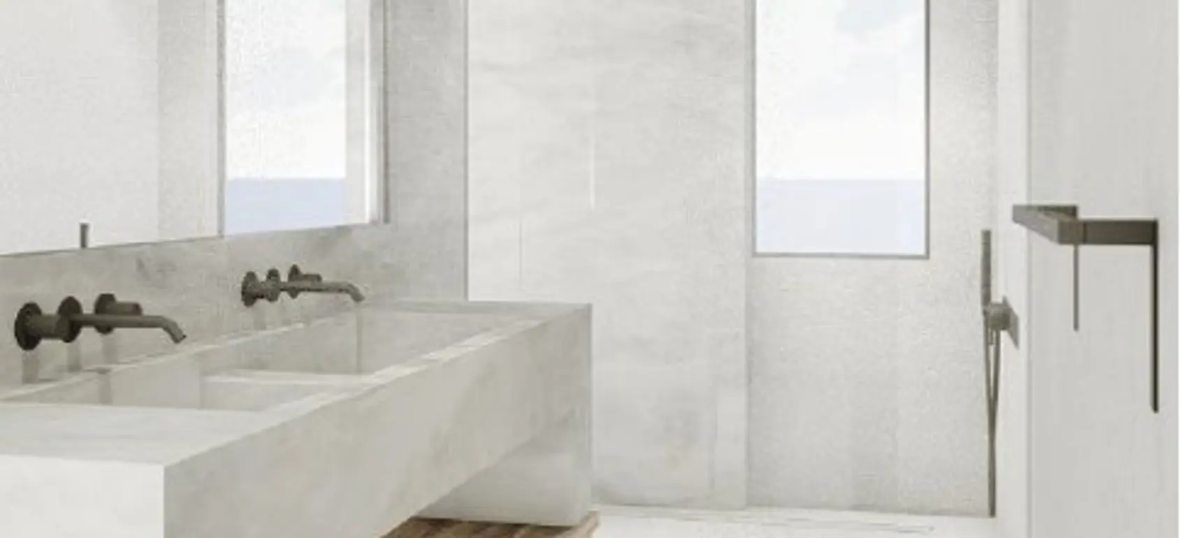 Bedroom / Bathroom - Build in bed pedestal covered with light gray terazzo - Celling ligh Rain, Design by Andrea Tosetto -Build in sitting area with fabric cousions - Wall dividing bedroom and bathroom area - Black faucets and accessories - Invisible shower drains - Celling lightning Delta Light
