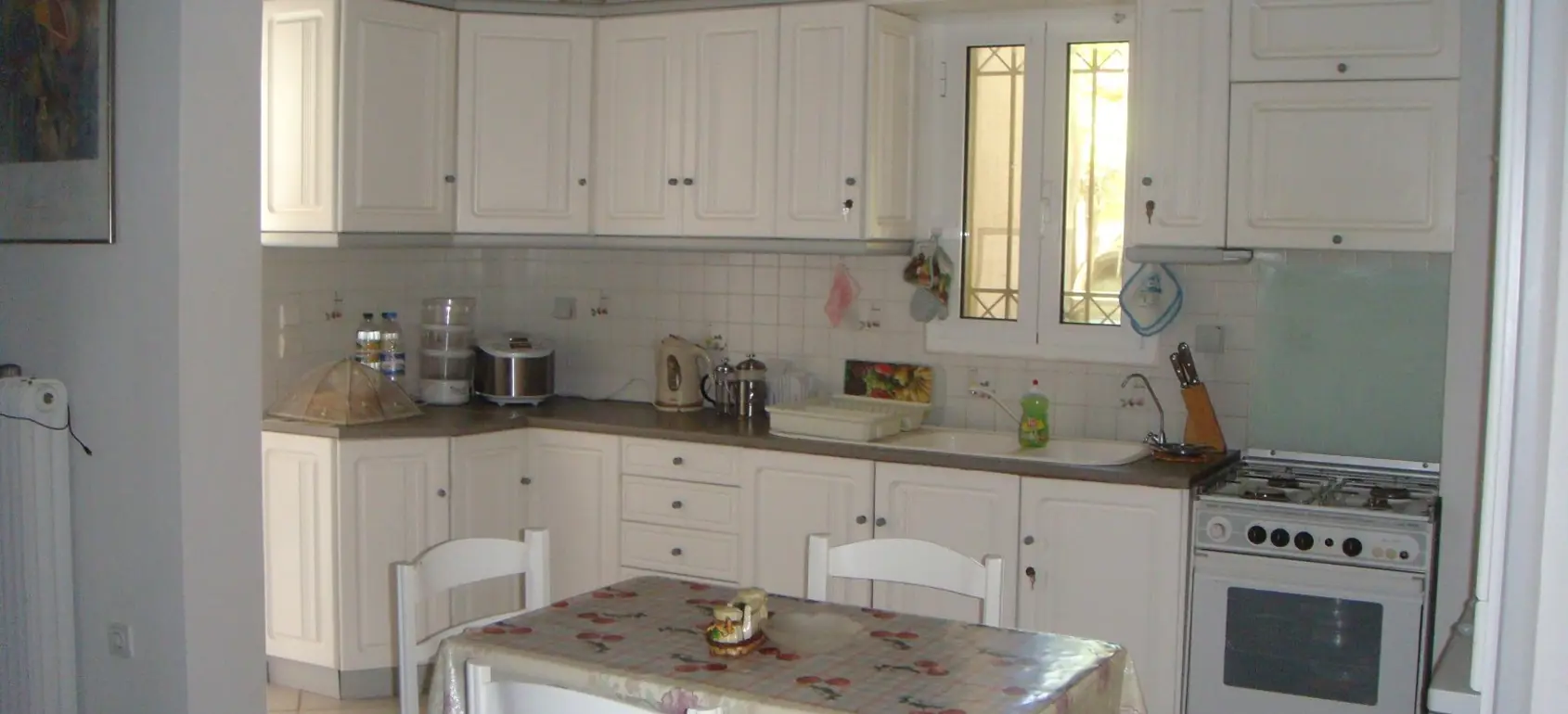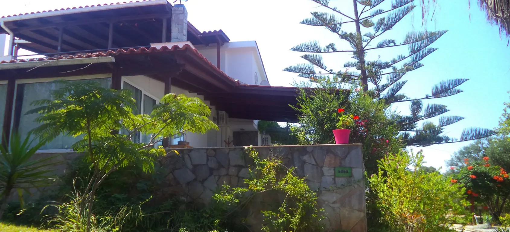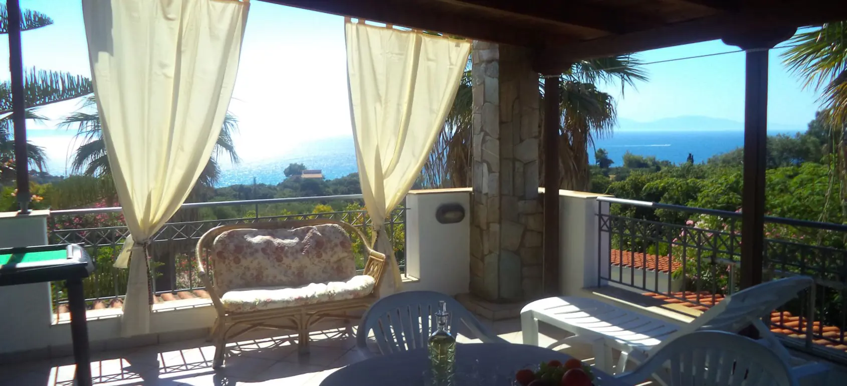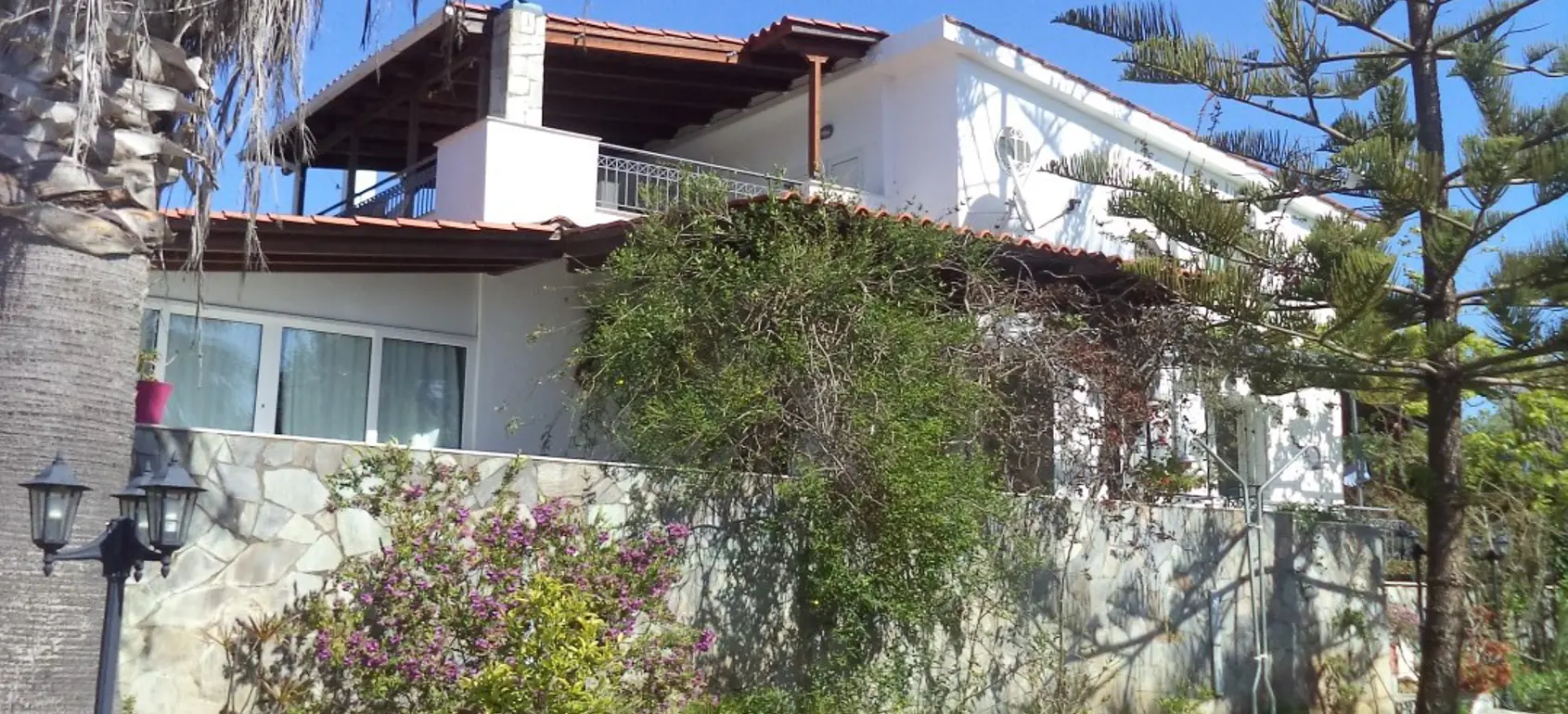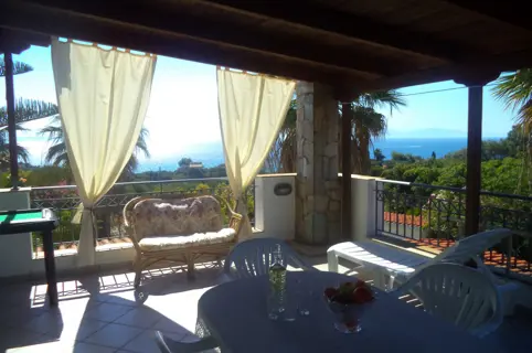 The villa is located 750 meters from the seashore (one of the cleanest seas in the world - there is a UNESCO flag). The villa is surrounded by olive trees (120 trees), huge palms, citrus trees (80 trees), lawns with flowers. Each floor of the villa is autonomous. The entire villa is surrounded by large terraces where you can enjoy breakfast, lunch, and dinner. There is also a barbecue area. 1st floor - living room with fireplace, kitchen-studio, 2 bedrooms (1 large with double bed, 2nd - 2 separate beds). Large bathroom with bathtub. 2nd floor - 2 bedrooms (1 large with a double bed, 2nd - 2 separate beds) with a small kitchen and a large terrace overlooking the sea. Bathroom with shower. All rooms in the house have independent exits. The house is equipped with modern appliances (plasma TVs (2) with satellite antenna, internet, telephone, air conditioners (3), washer and dryer, electric ovens, refrigerators, microwave ovens, dishwasher machine). It is connected to the public water supply. There is a fireplace, boiler, gas tank (volume 1 ton). 3-phase power supply. 2 storage rooms (internal). There is lighting around the perimeter. There is also a big volleyball square. The villa is located between the port of Kyllini (from where ferries go to Kefalonia and Zakynthos) and the town of Castro (where there is a fortress built by the Franks in the 13th century - a historical monument). Nearby are Ancient Olympia, Sparta, Mycenae, and other historical sites. Nearby there are thermal springs (with healing mud), 4 km from the house. Araxos Airport is 30 km away from the villa. Flights are carried out from Germany, Switzerland, France, Russia, UK, Czech Republic, Poland, and other countries. The city of Patras is located 70 km.