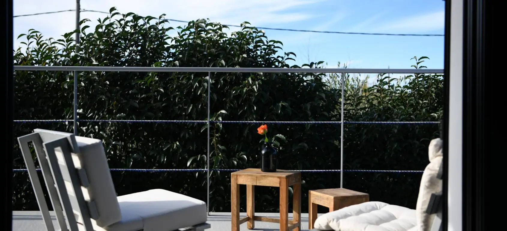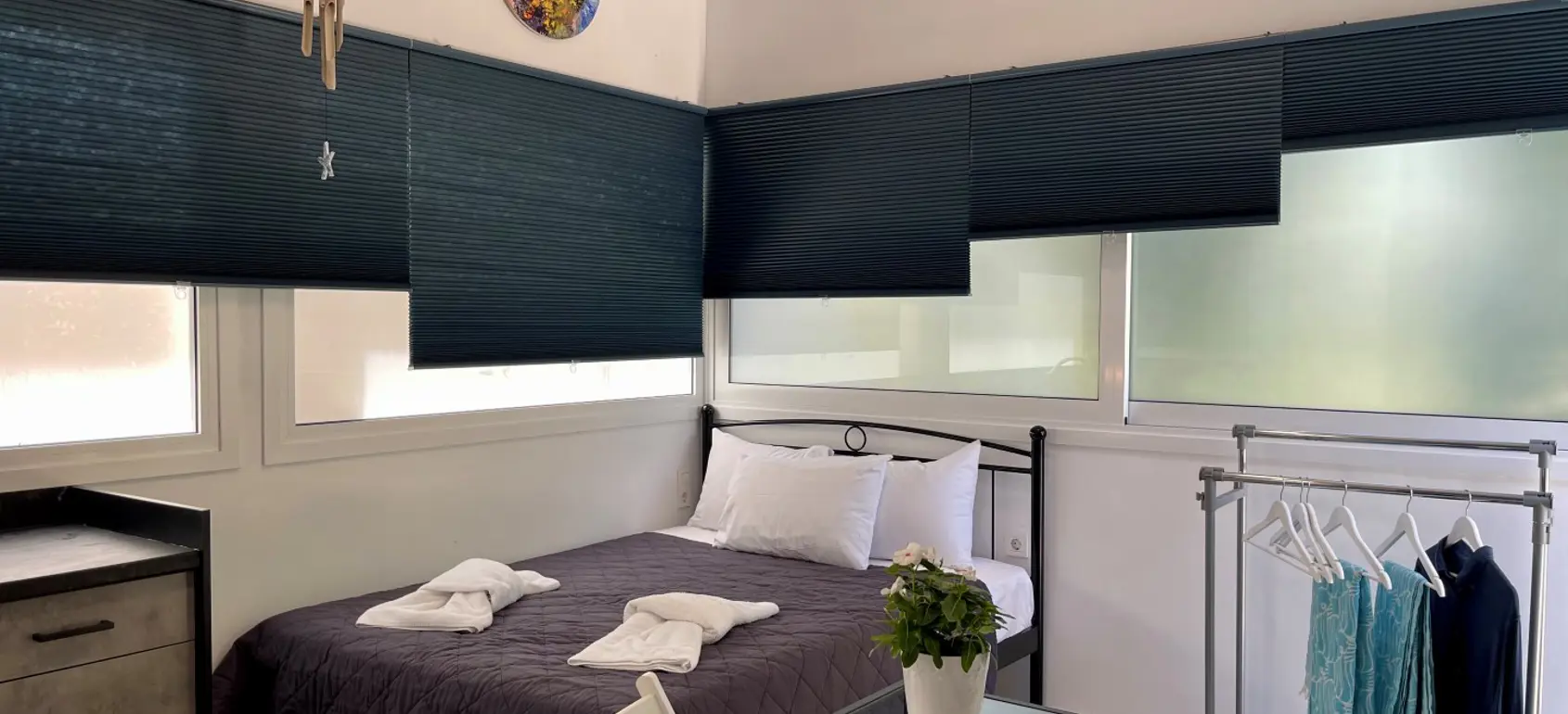 This beachfront property can be compared to a modern loft of two levels, which will impress you with all the small details and facilities it has to offer. On the ground floor there is an open space living room with a fully equipped kitchen and queen size bed which can be used for an evening power nap or an additional bedroom area. At the same level there is a fully equipped bathroom with a shower, including a washing and a clothing dryer machine. However, on the ground floor there is, also, an independent room with double bed, a small kitchenette and its own backyard. As there is a different private entrance for this room it can, potentially, accommodate the house personnel.