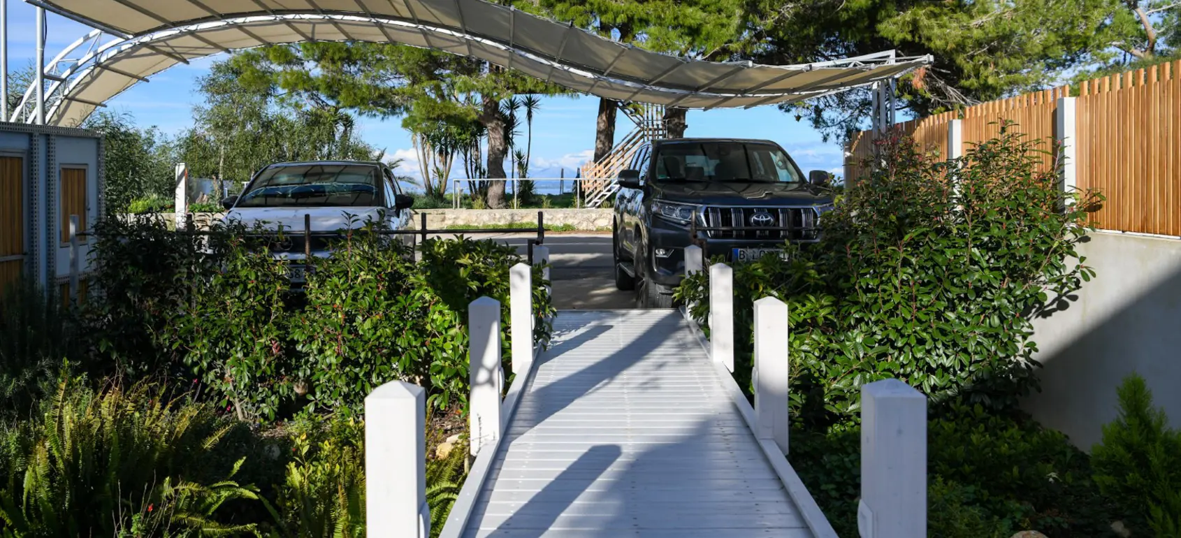 The outside area consists of a lovely green garden and a big fully furnished patio with a dining area. The space of the dining area is protected through a glass pergola and includes a heating system, so it can be used all year around. From the main entrance of the garden there is a small path that will get you to the independent double bedroom of the ground floor. In the front, there is parking space for 3 cars.