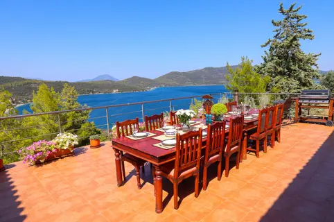 The villa itself is approximately 350sqm with tiled balcony areas of approximately 150 sqm. It has been designed for all year round living and has full central heating which can be powered by either a 110kw wood boiler or an 85kw oil fired boiler. Both devices can also heat the swimming pool if required. The temperature on each floor can be independently controlled. Air-conditioning featuring heating/cooling is available in every room. There are 5 large solar panels which heat 600 liters of domestic water. Externally the property has its own fresh water storage for 25,000 liters and 2500 liters of heating oil storage. There is also covered wood storage for approximately 50 tons. The villa has large open plan lounge featuring a stone fireplace which can either be open or enclosed behind a glass door. It has an electrical vented chimney for additional heat recovery. Floor to ceiling windows feature throughout the property to maximize the stunning views. A large 72 sqm terrace with outside dining area which can accommodate up to 20 people in comfort. This sunny terrace includes BBQ is immediately outside the lounge windows with panoramic views all round. The kitchen area is raised wrap around island within the large lounge/dining area. There are potentially 5 bedrooms or 3 bedrooms and an office and home cinema depending on desired usage. All bedrooms are ensuite.