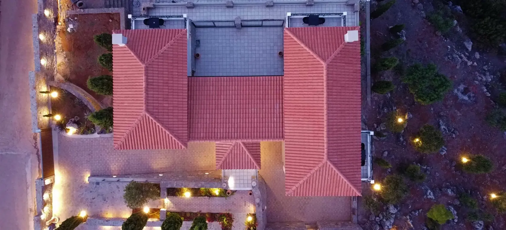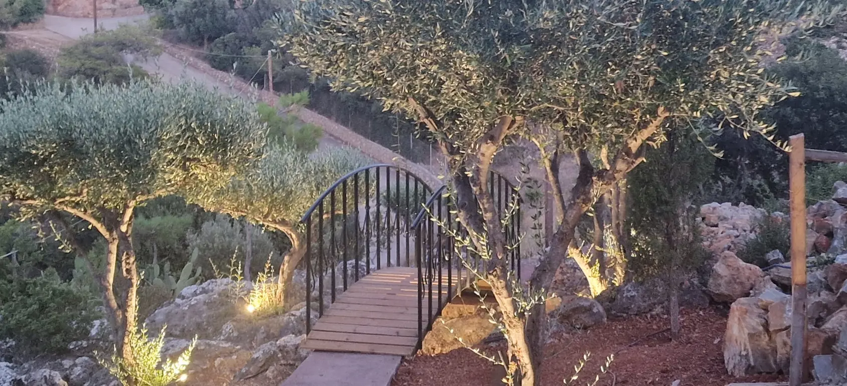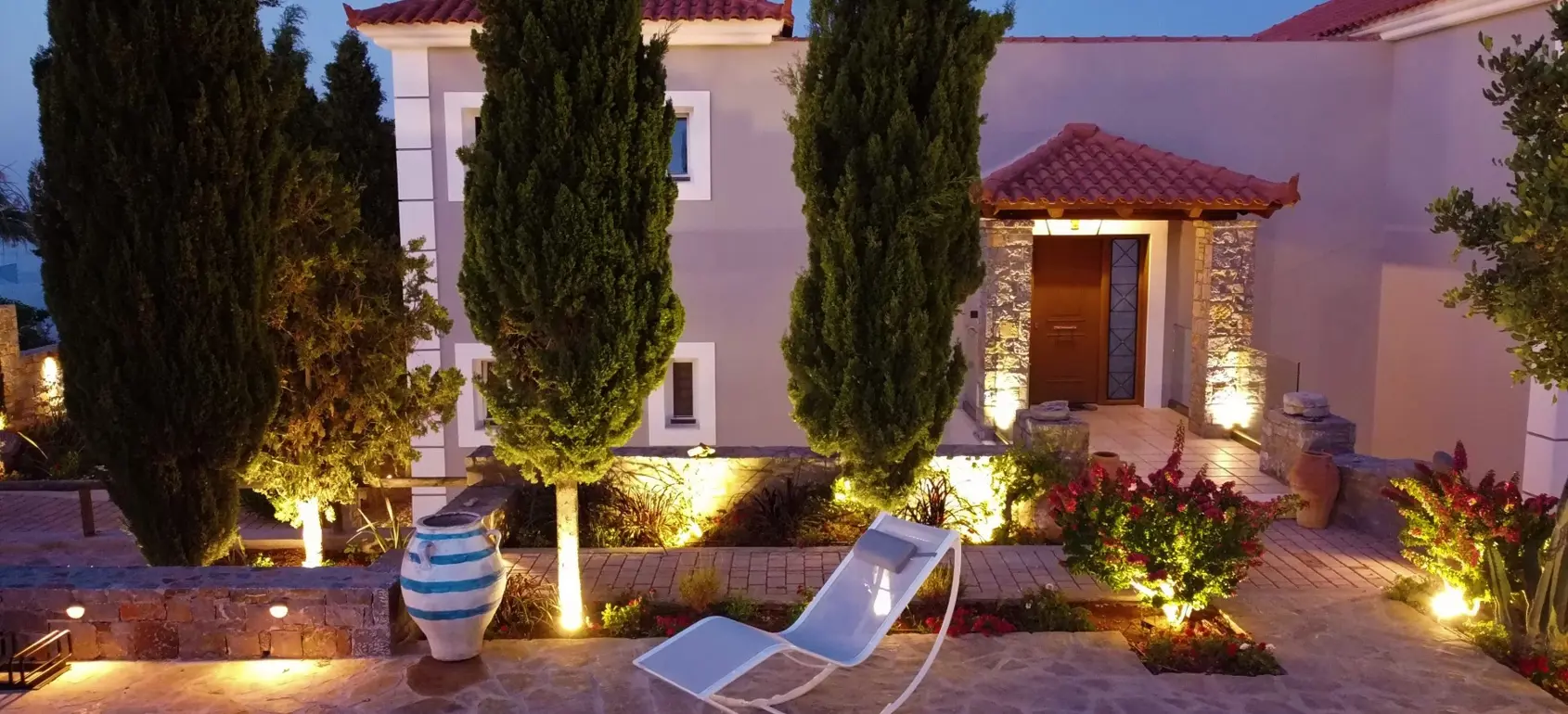 The meticulously landscaped garden features a variety of indigenous Cretan trees and plants, complemented by a charming bridge, stone walls, well-designed pathways, and atmospheric lighting, creating a serene outdoor oasis.