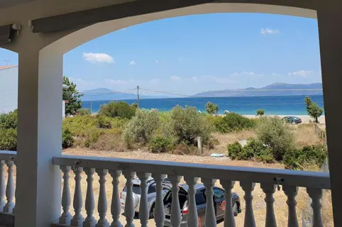 The first floor of 118.48 sq.m. consisting of three bedrooms, two bathrooms (one ensuite) and a large open space (living room/dining room and kitchen) with a fireplace, as well as the ground floor residence of 69.85 sq.m. which has a kitchen, a bathroom and a storage area of 10 sq.m. The property has spacious balconies overlooking the sea, has central heating (boiler room), garage and barbecue area. It is fully furnished with modern built-in electrical appliances.