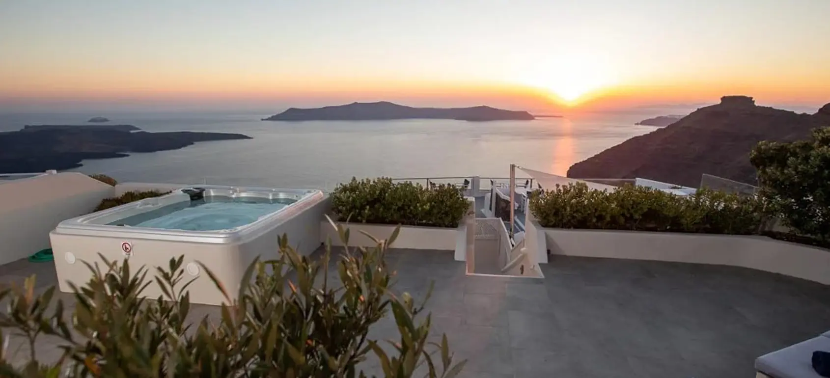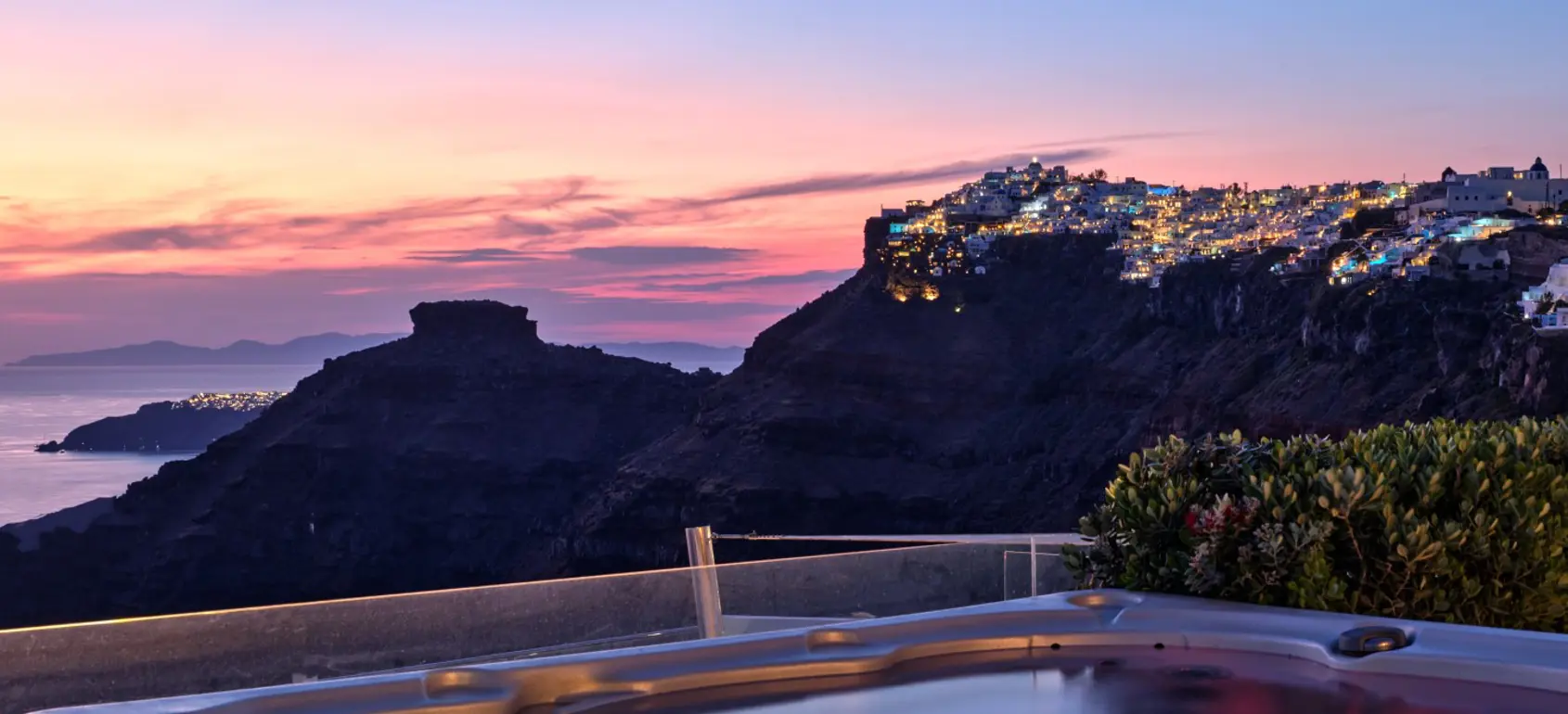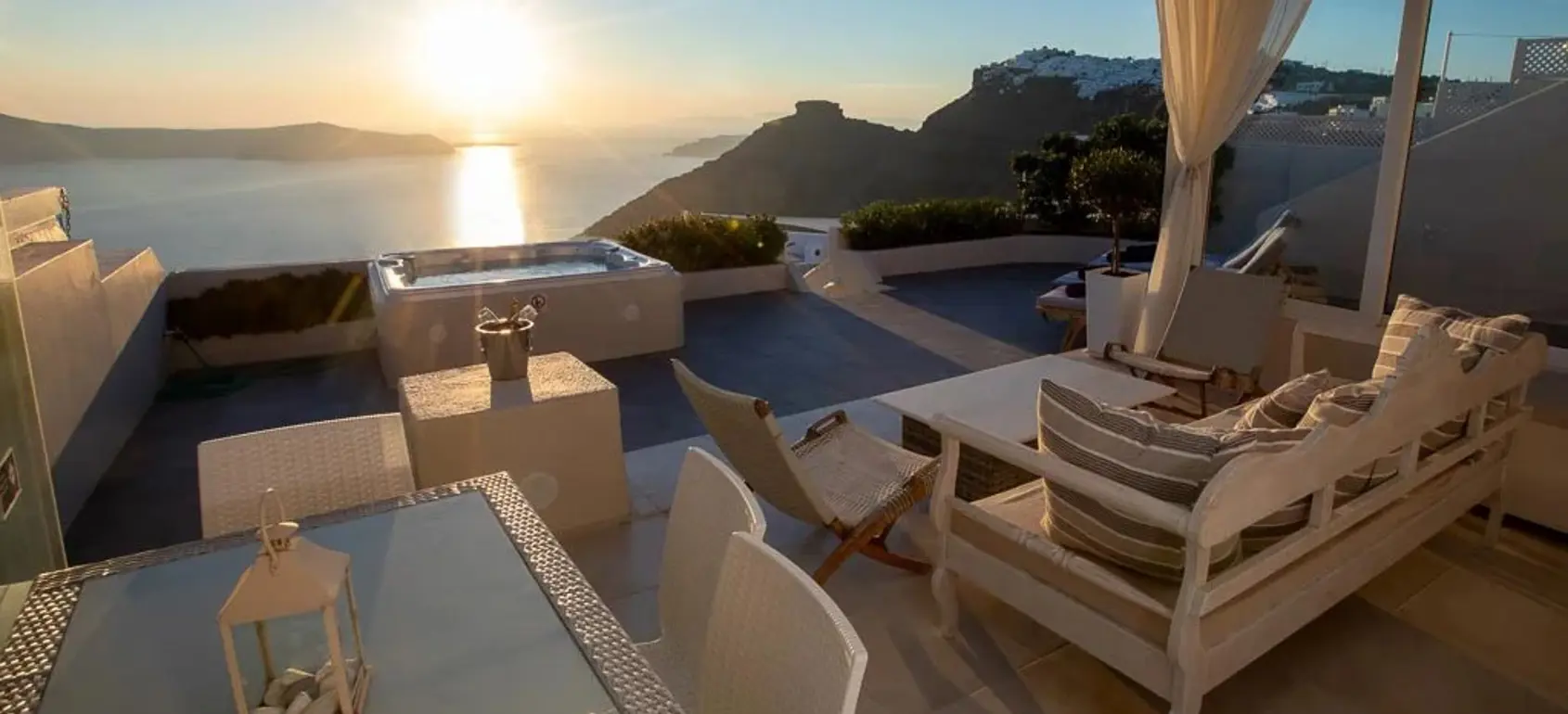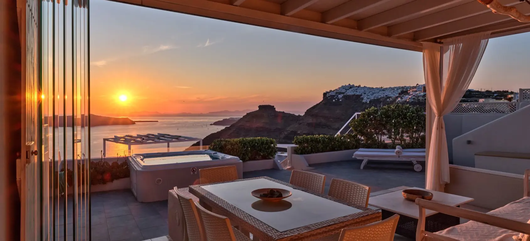Panoramic views properties of the azure Aegean Sea and the world-famous Santorini sunset