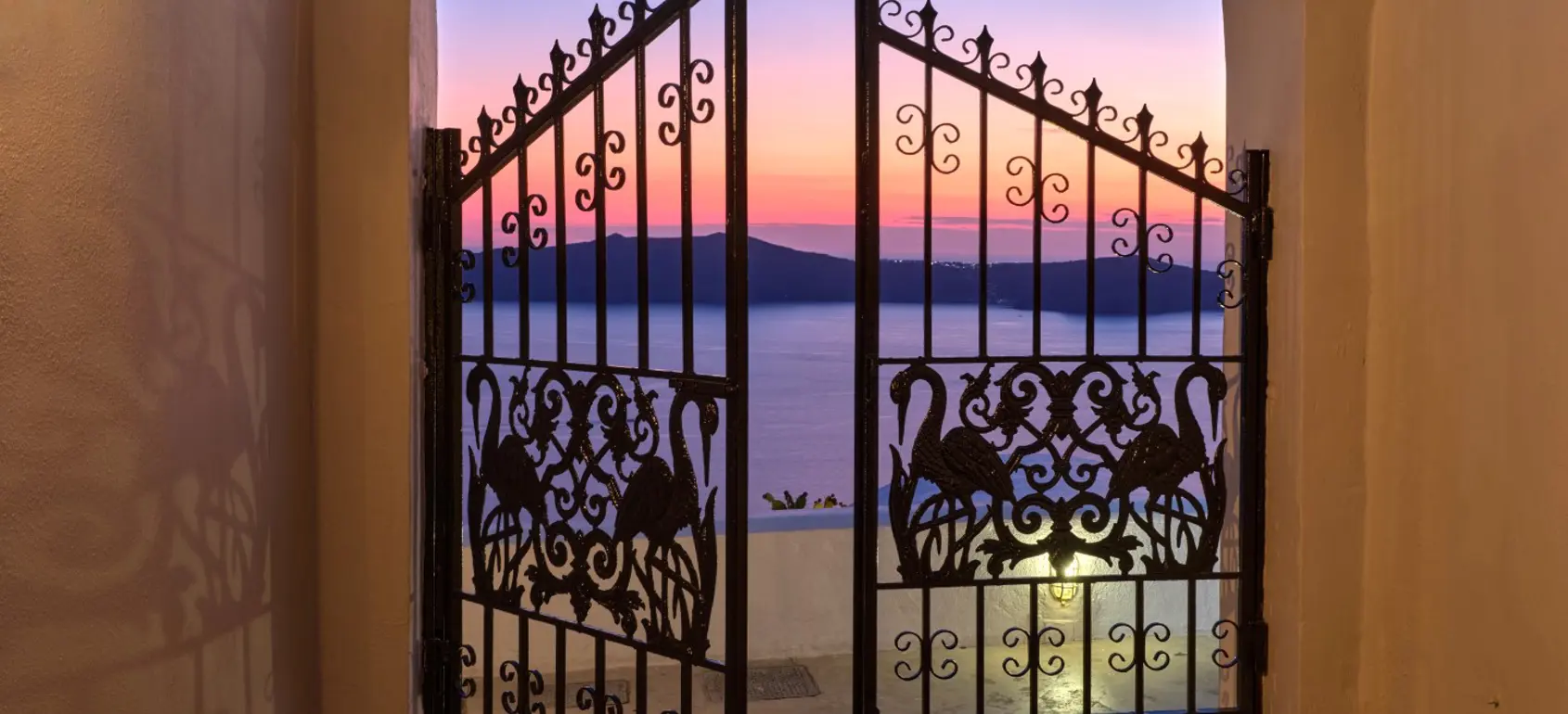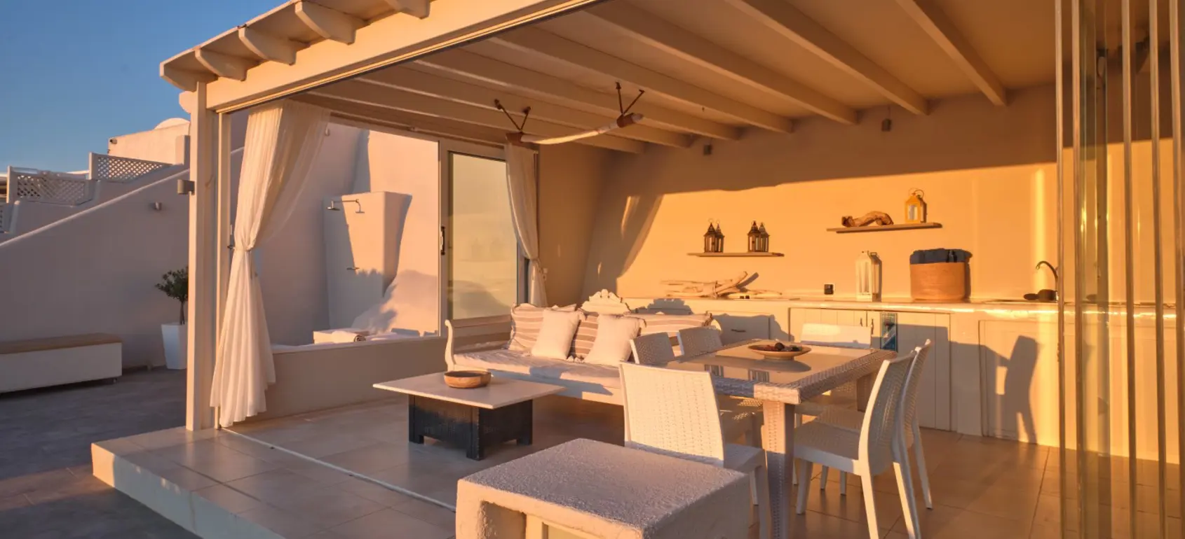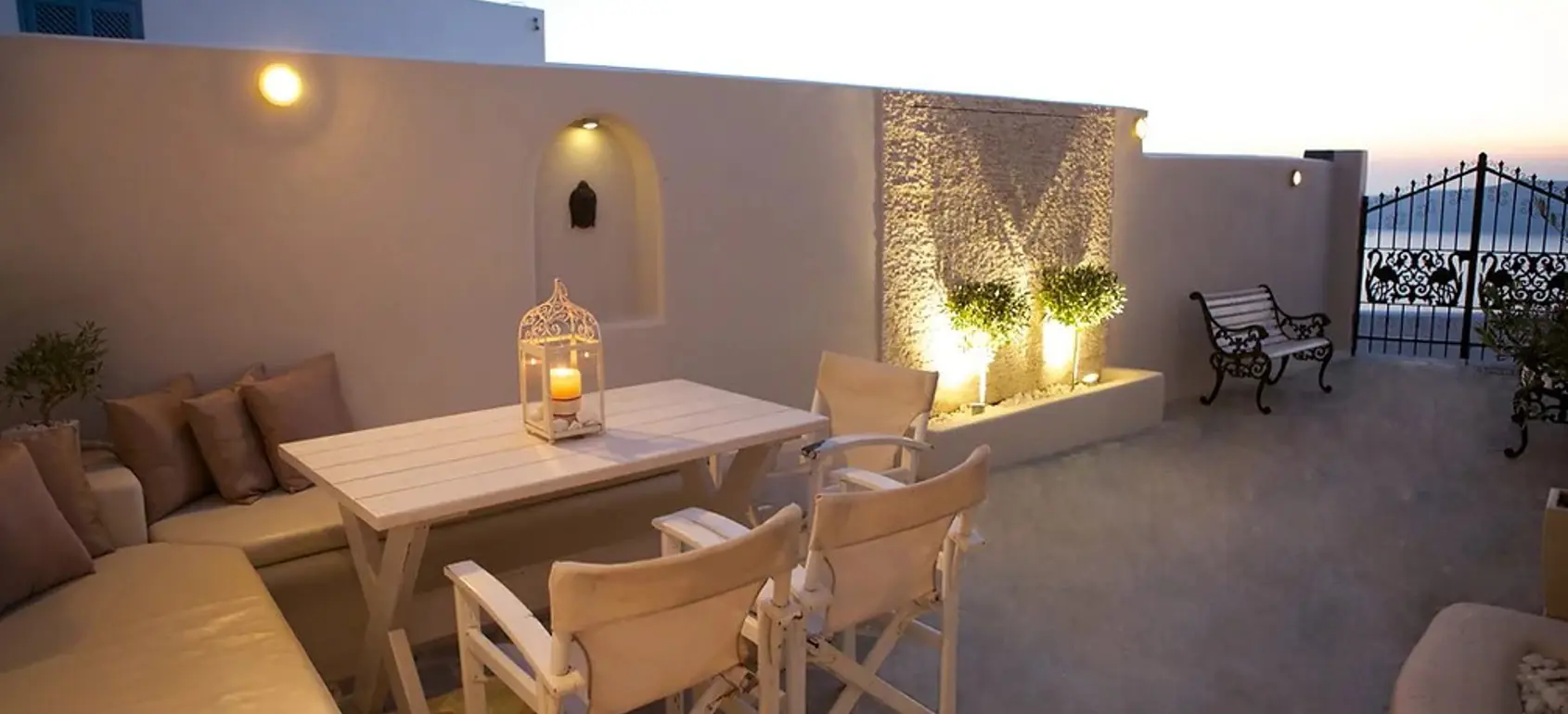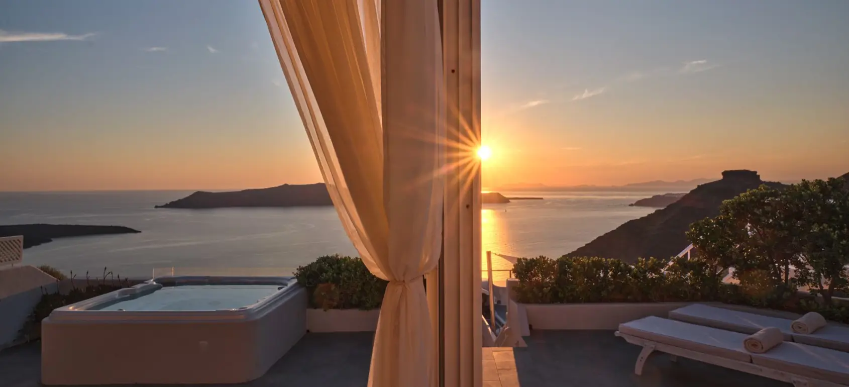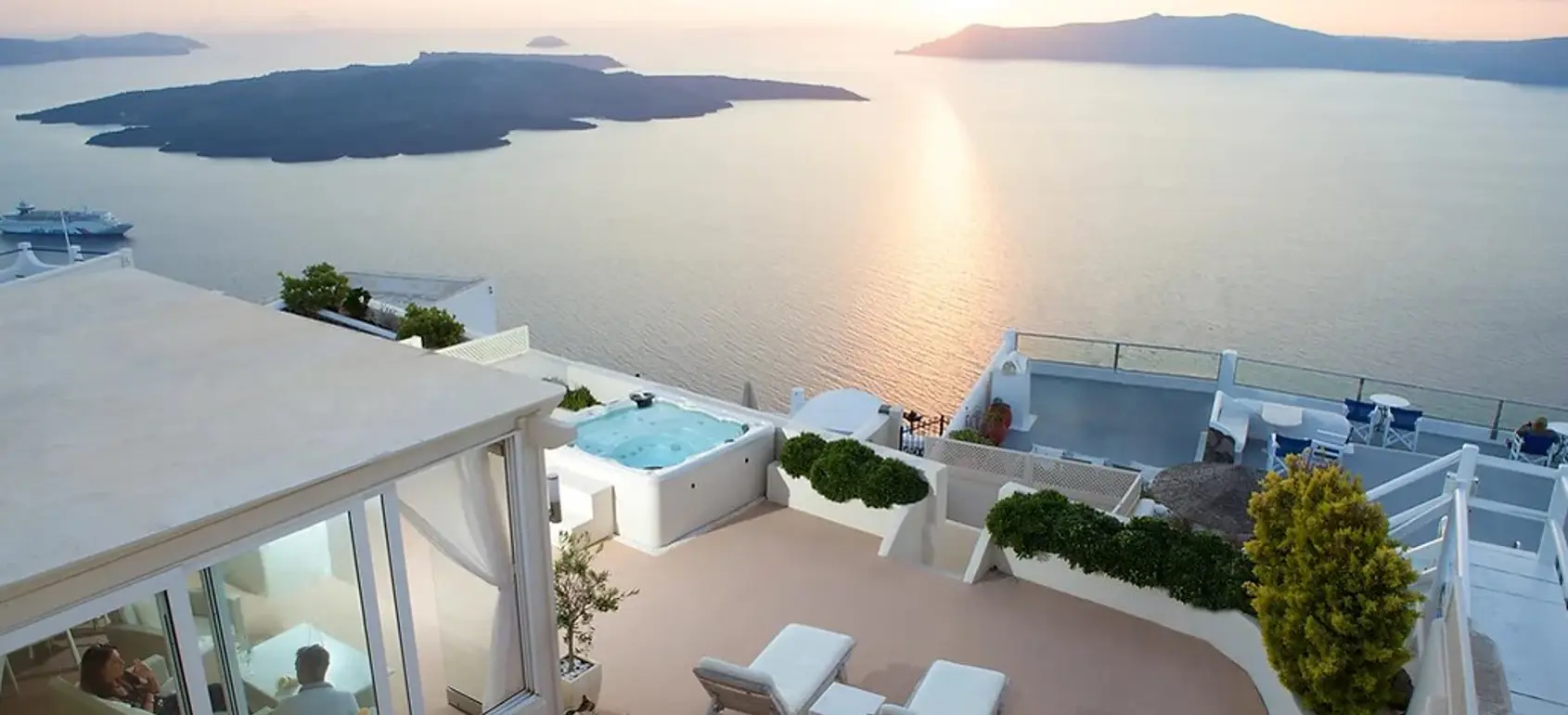 Panoramic views properties of the azure Aegean Sea and the world-famous Santorini sunset