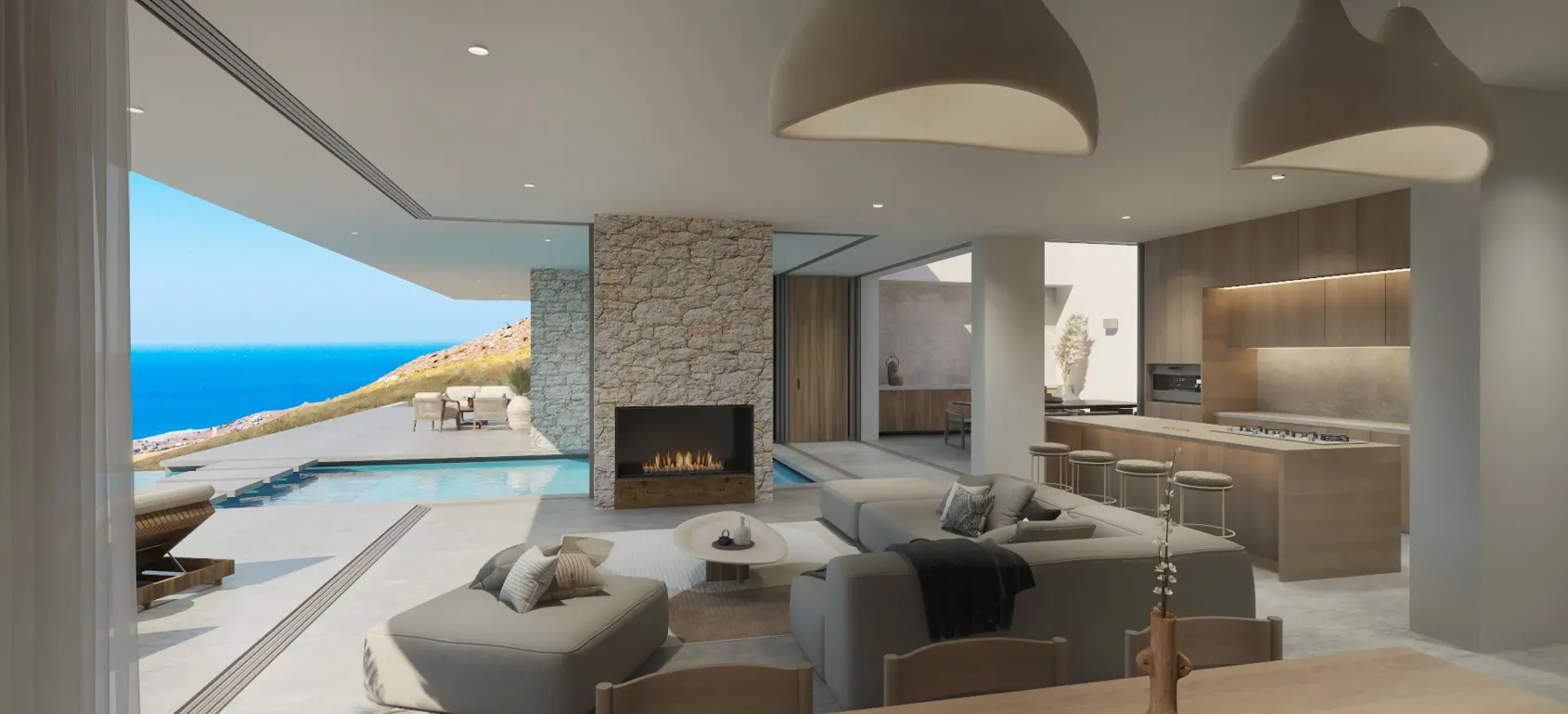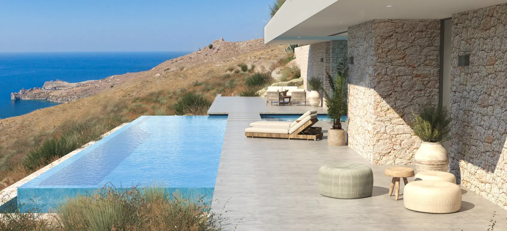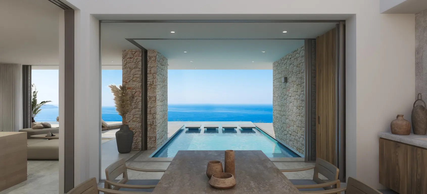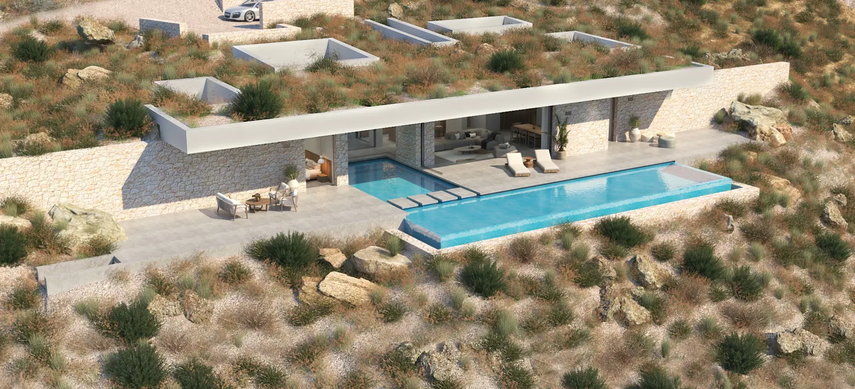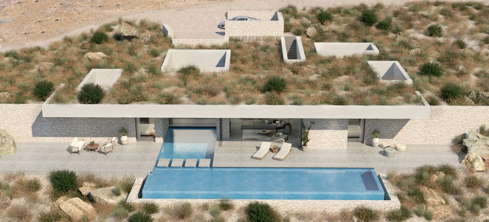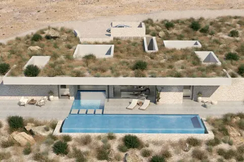This exclusive sub-terrain style villa located in the area of Agios Pavlos, South Crete are designed using natural materials of stone, concrete and select wood, which boost the natural beauty of the surrounding environment and allow fluid transitions of both indoor and outdoor spaces.