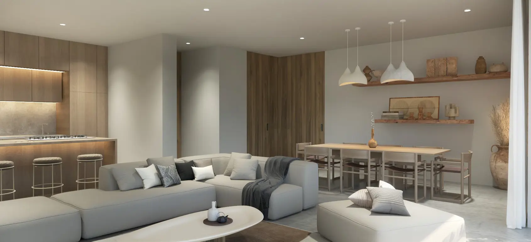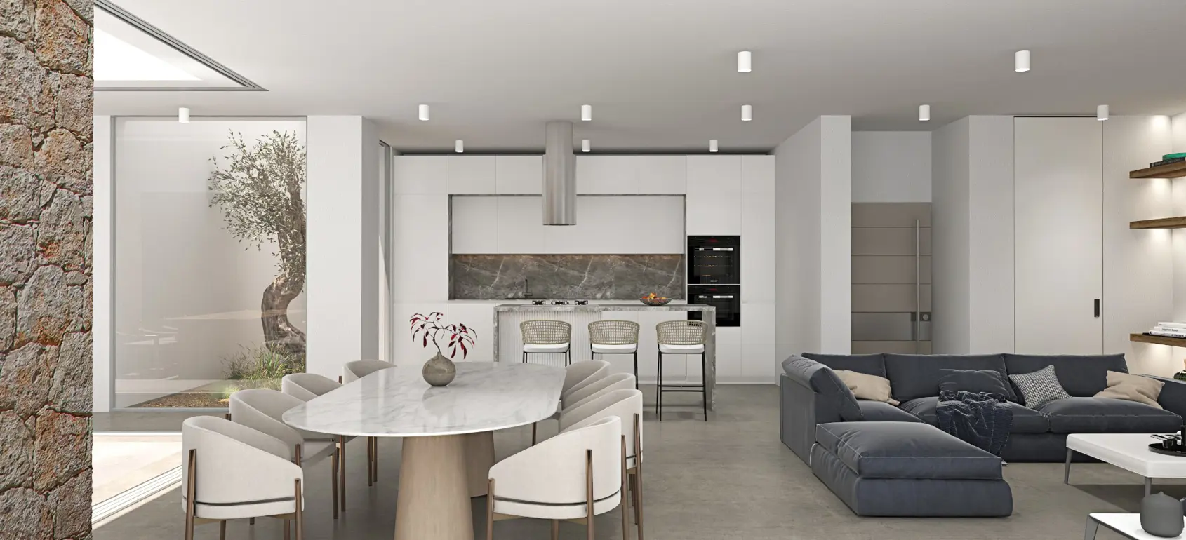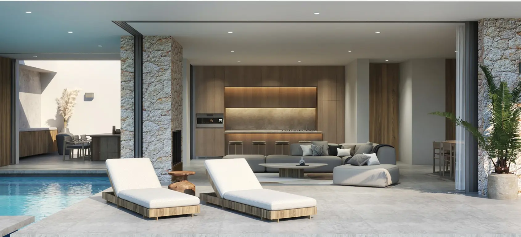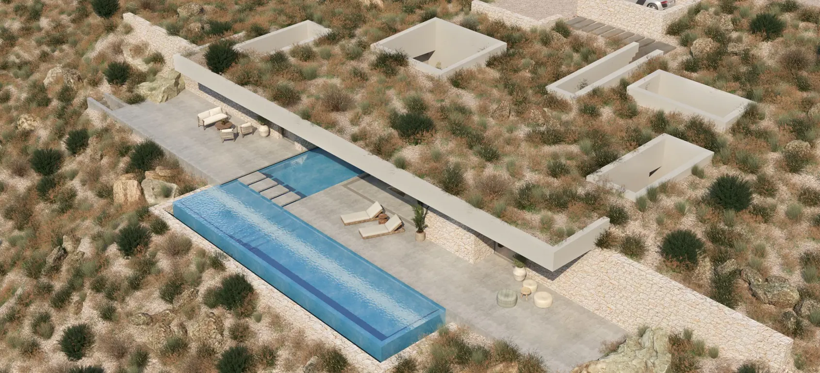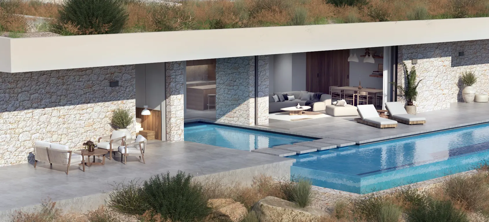 This exclusive sub-terrain style villa located in the area of Agios Pavlos, South Crete are designed using natural materials of stone, concrete and select wood, which boost the natural beauty of the surrounding environment and allow fluid transitions of both indoor and outdoor spaces.