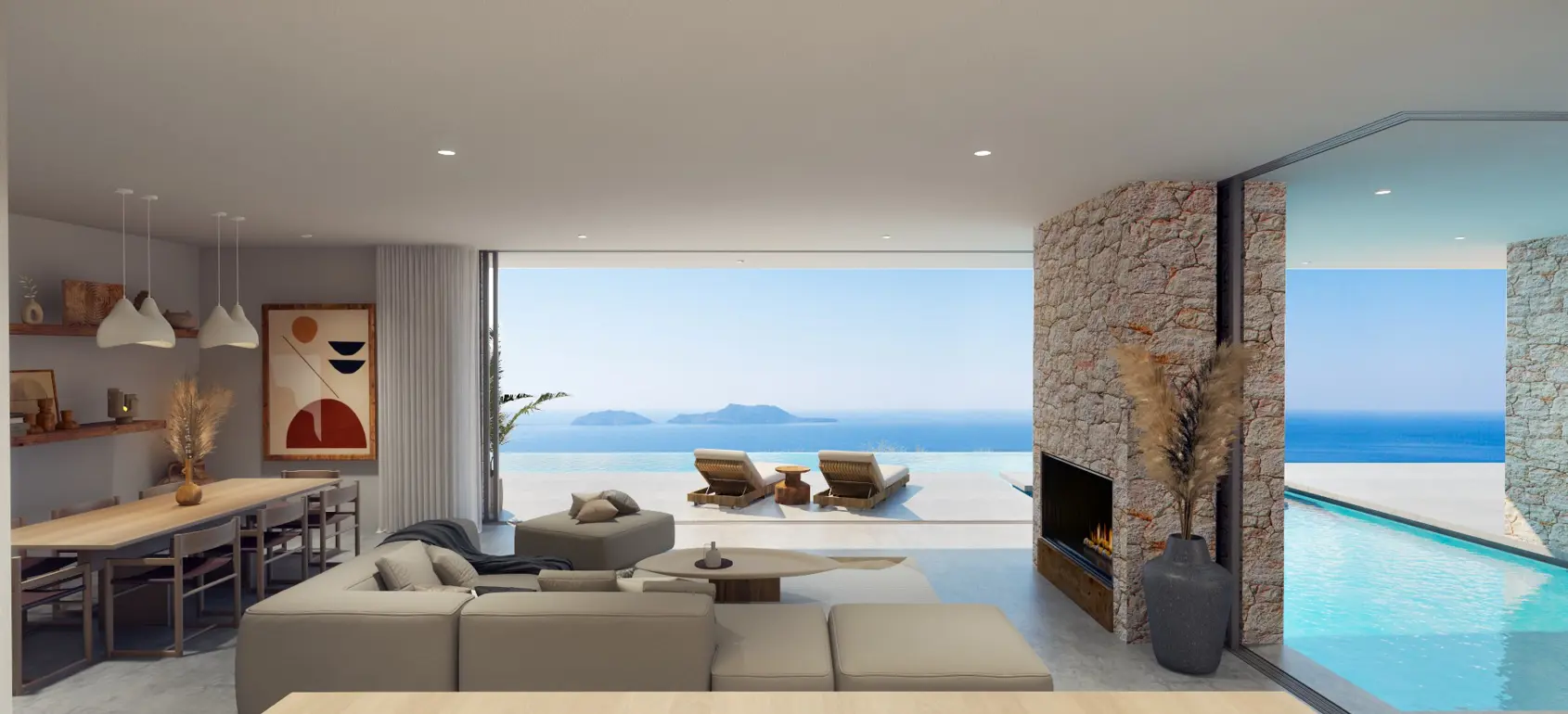 The large open-plan kitchen/living/indoor dining area has fantastic sea views with direct access to the ceramic tiled pool patio which boasts a unique, partially covered, 100,32sqm “L-shaped” infinity pool with an outdoor shower. The villa is designed under the standards of the Hellenic Touristic Organization (EOT) and are suitable for holiday rental.