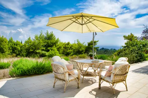 The house is located at the southeast part of the island, a 20-minute drive from the town of Zakynthos on the Doretta hills of Vassilikos. It is not overlooked by other properties and is detached built in a 4,019 sq.m. plot on a leafy hill behind which the sun sets and is ideal for hosting big groups of people and families. Situated 5–10-minutes’ drive from the most beautiful beaches of Zakynthos, namely Porto Zoro, Banana, St Nicholas, Porto Roma and Gerakas (renowned for the caretta-caretta turtle). All the nearby beaches are sandy, organized with good amenities such as sunbeds, water-sports, restaurants and beach bars, and very child-friendly, thus offering a unique family holiday experience.