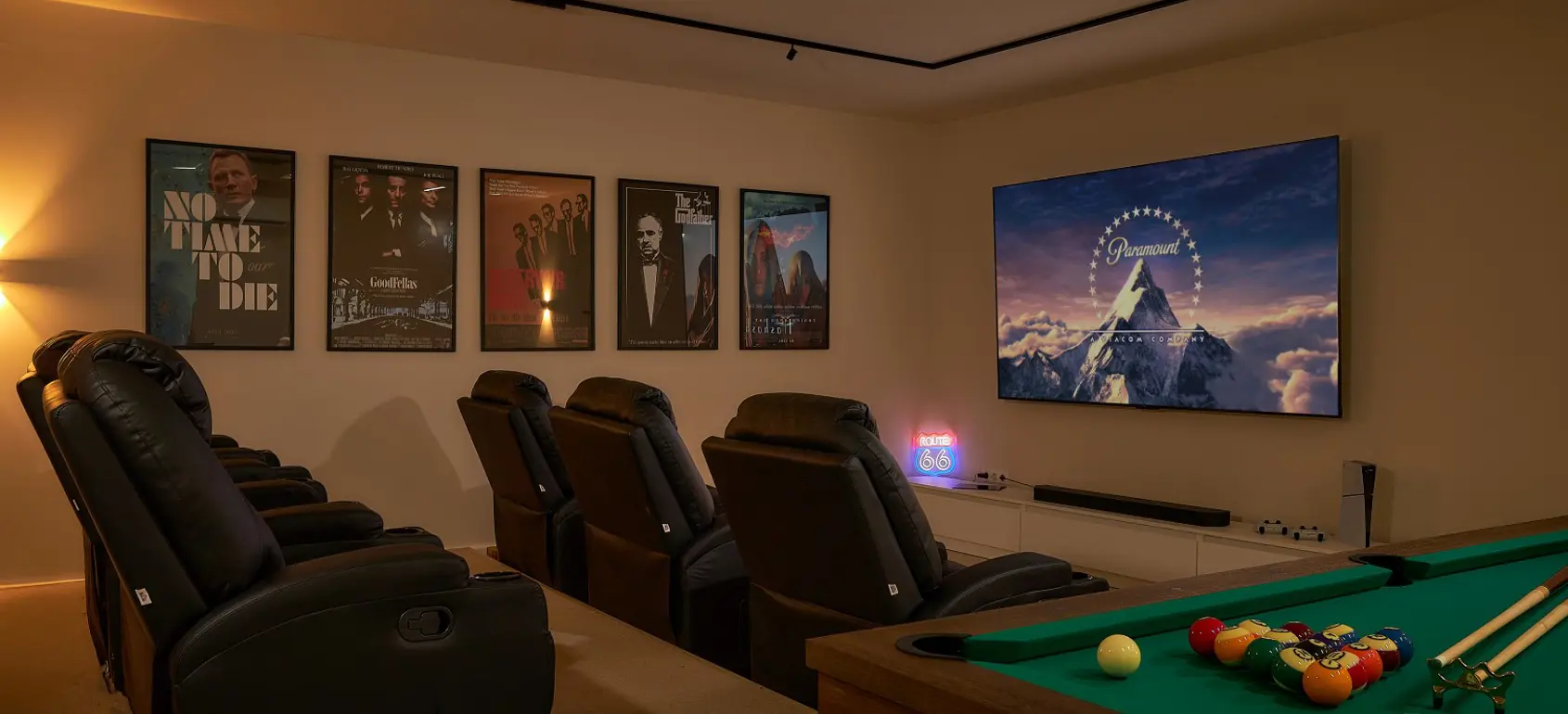 The Playroom: Including a minibar area and a brand-new billiard table especially designed for enthusiasts! Enjoy a 98-inch monster screen with a collection of 6 ergonomic cinema chairs to immerse yourself in an unforgettable movie night or play PlayStation with an 11.1 surround sound system.