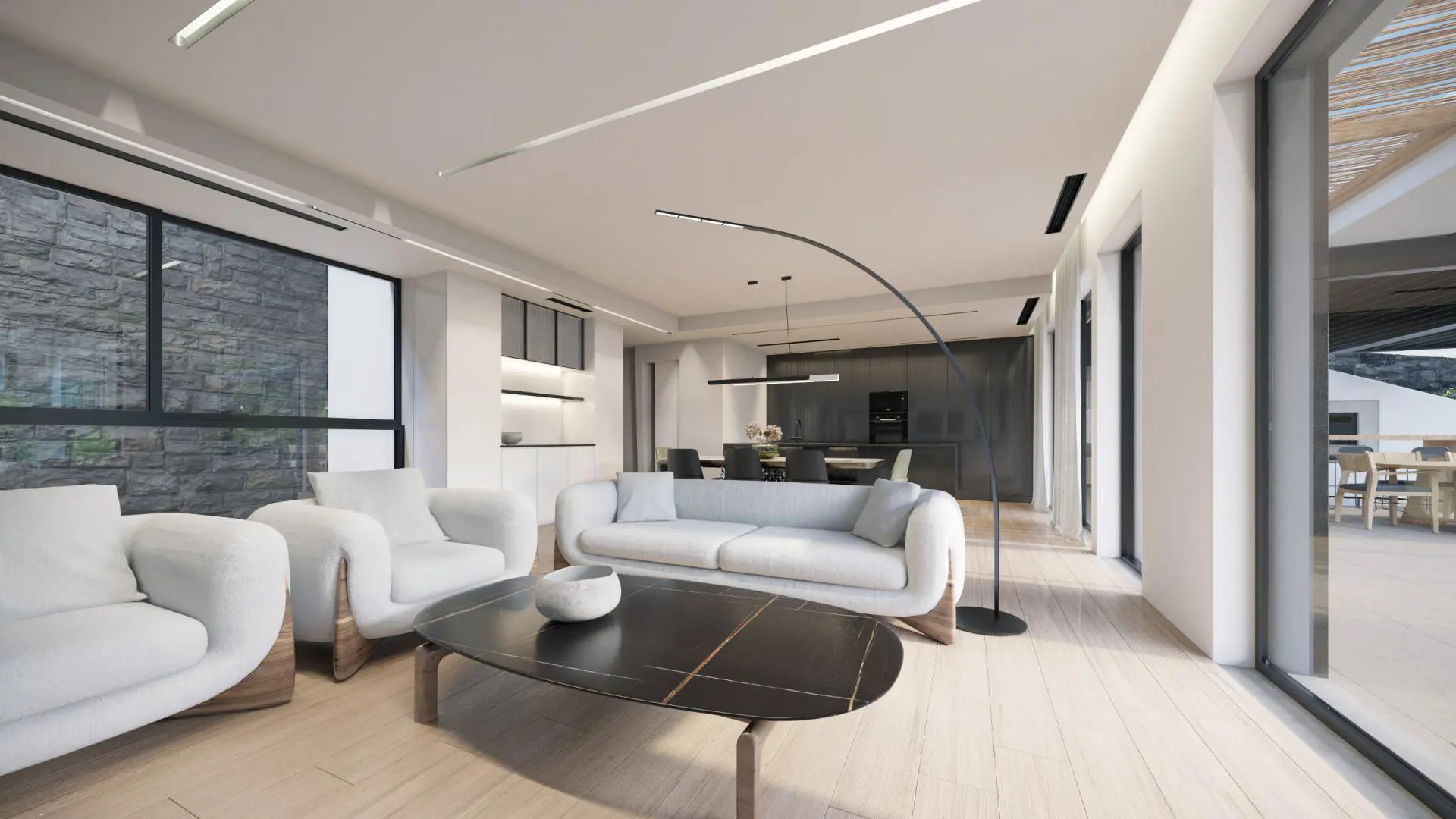 First floor: Similar to the previous floor, it has a spacious living room, an open-plan kitchen, and access to the heated pool with jacuzzi and the barbecue area.