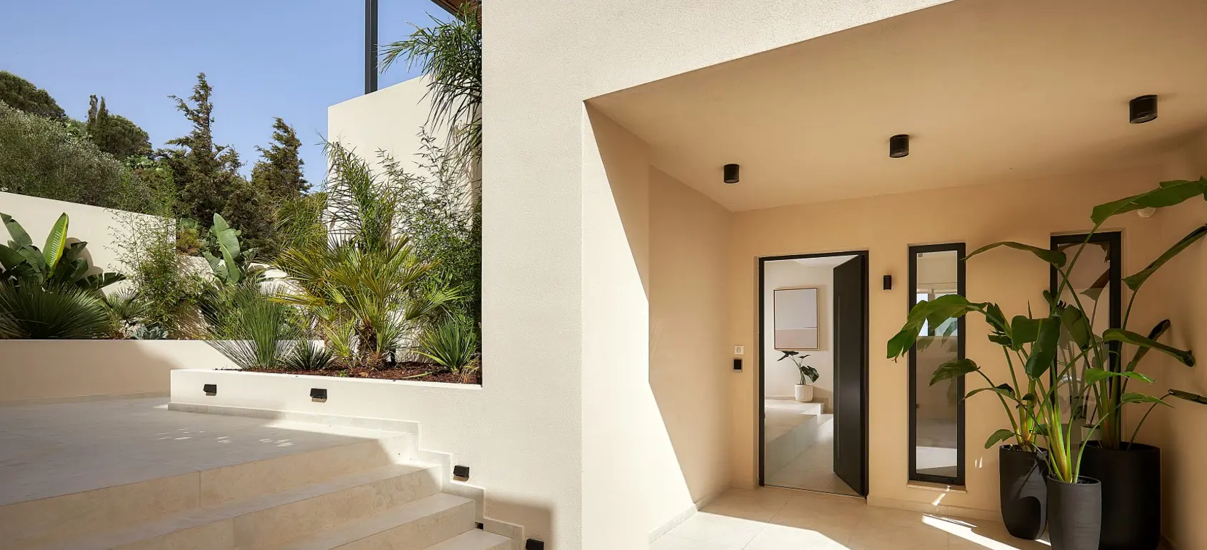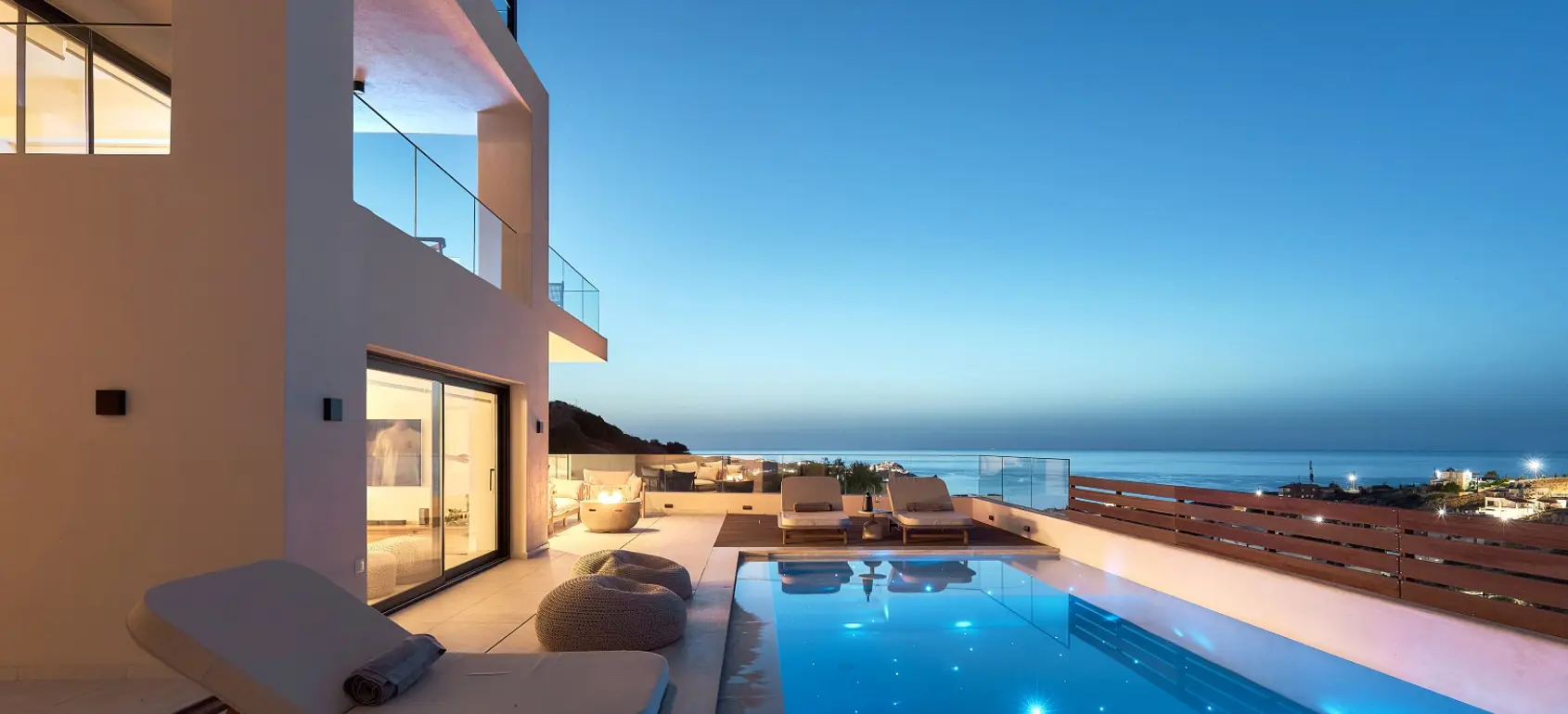 The Pool Area: It's equipped with sunbeds, pool poufs, and a redefined outdoor living space perfectly paired with a comfortable sofa, two armchairs, and a gas fireplace – ideal for relaxation and enjoying magical summer nights. The pool has a water control system to achieve and maintain the perfect temperature all year long.