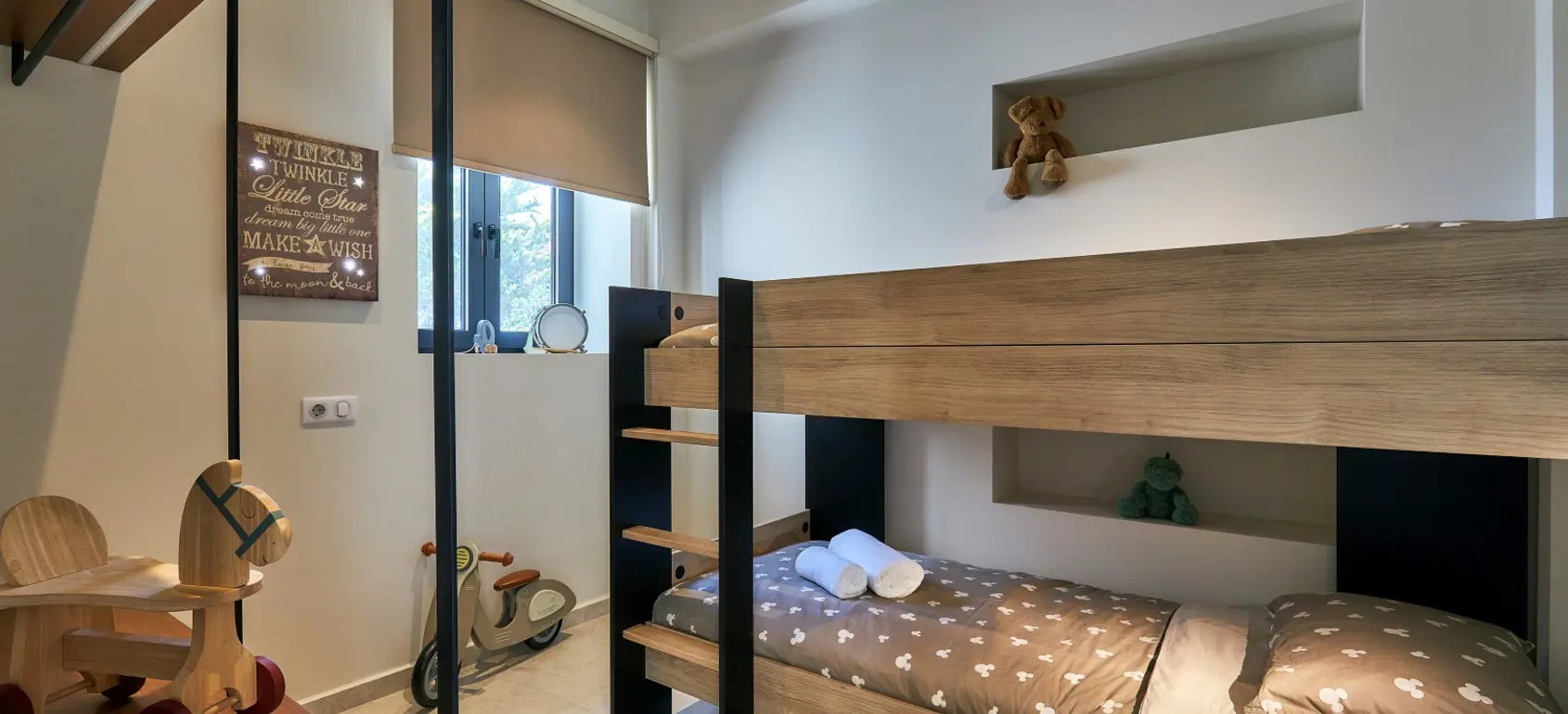 Second floor: Here you will find the kids' room with a bunk bed, a double-bed bedroom, and a master bedroom with an en suite bathroom. It also has a shared bathroom with a built-in shower and two terraces, ideal for relaxing while the kids sleep.