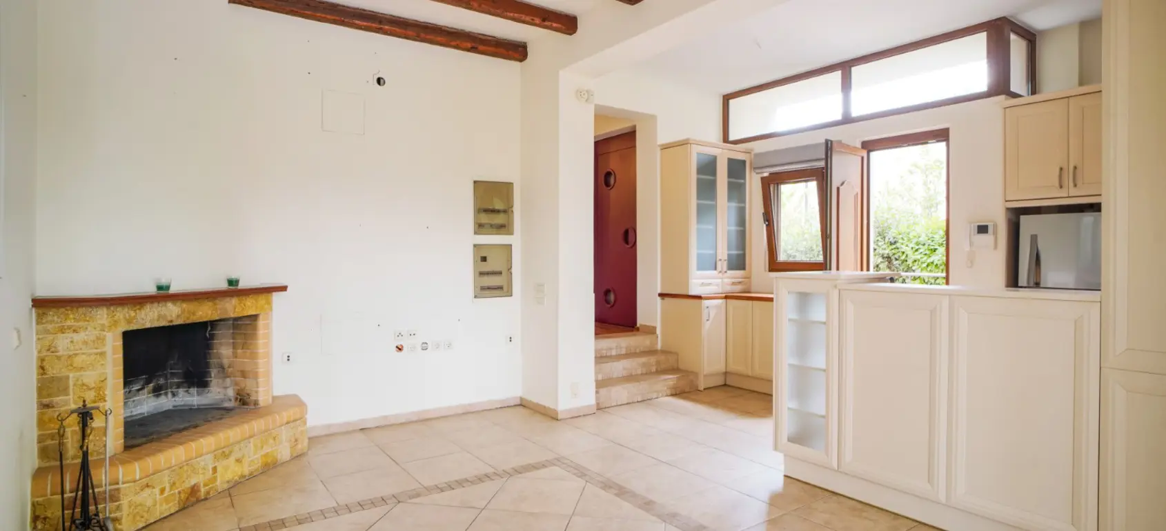 The main entrance leads to a wonderful open living and dining area with a fireplace. In that level there is also a wc and access to the elevator. Two steps down are the open plan kitchen with a fireplace and enough space for a large dining table for daily use with access to covered balcony with garden and swimming pool views.