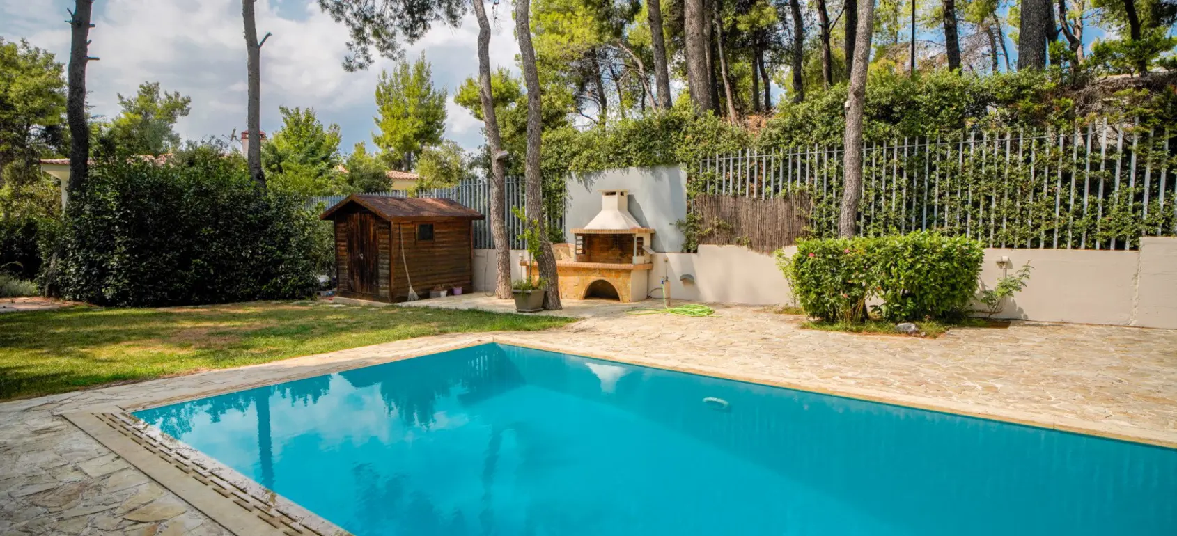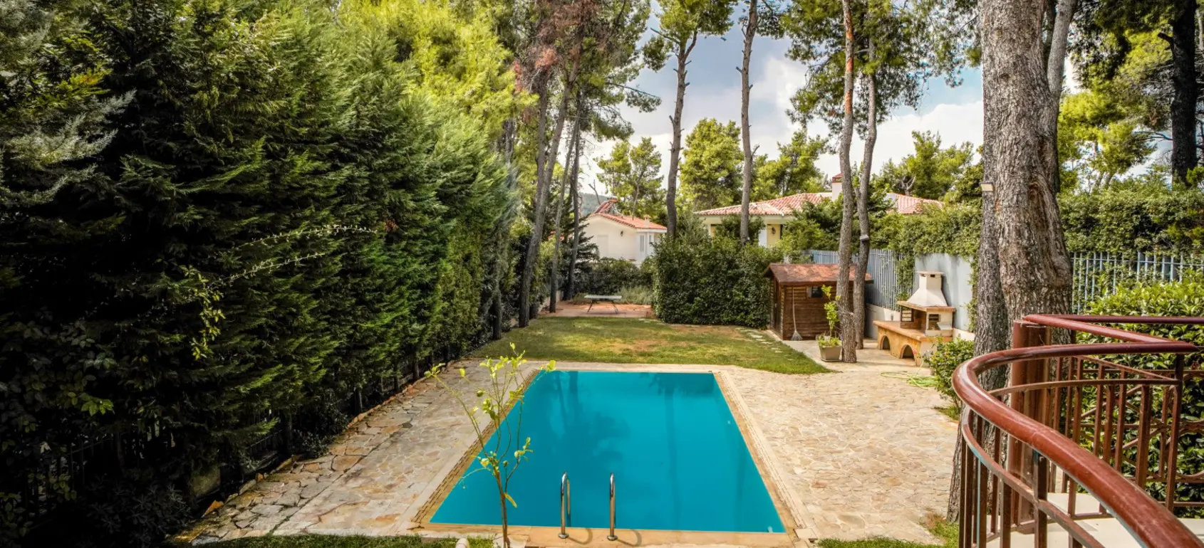 From the first floor, a staircase leads to a 12 sqm open Attic with its own wardrobe and veranda, ideal for office space. The semi basement floor has direct access to the swimming pool and the beautifully landscaped garden. On this level there are two rooms (one can be used as staff room and the other as playroom), a bathroom, a storage that can be a Hamam or a Sauna as there are ready all the necessary connections. In the same level are a two cars parking, an extra storage space and the machinery room.