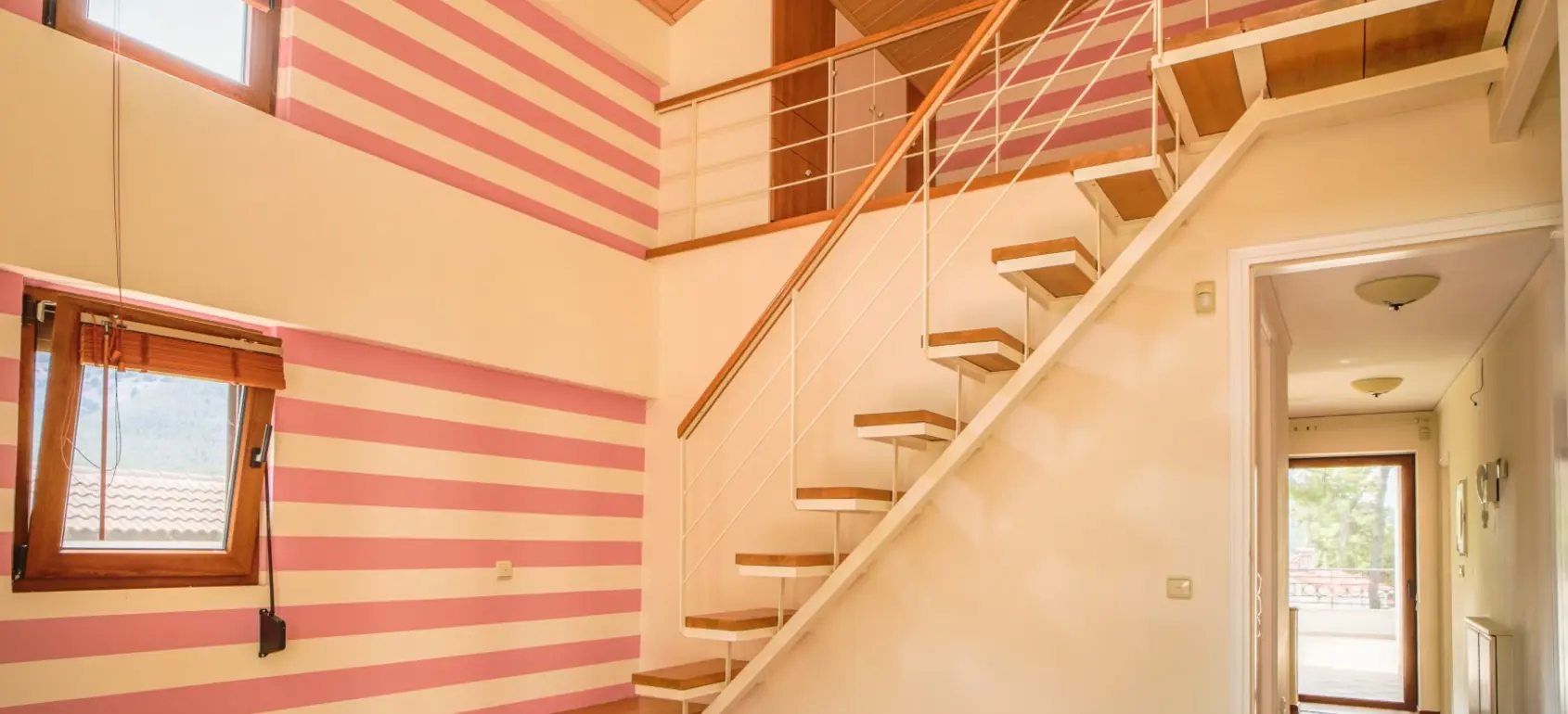 The 1st floor consists of a «master bedroom» with its own bathroom and a large wardrobe. In addition, two bedrooms with attic that share a bathroom. A door in a common corridor, lead out to a large terrace with a covered area for outdoor uses but it also can become an extra room. The covered space can be built as it remains a building coefficient of 65 sqm.
