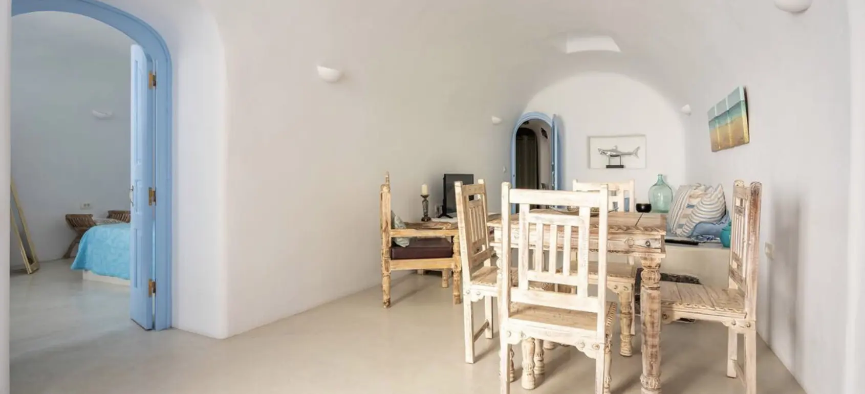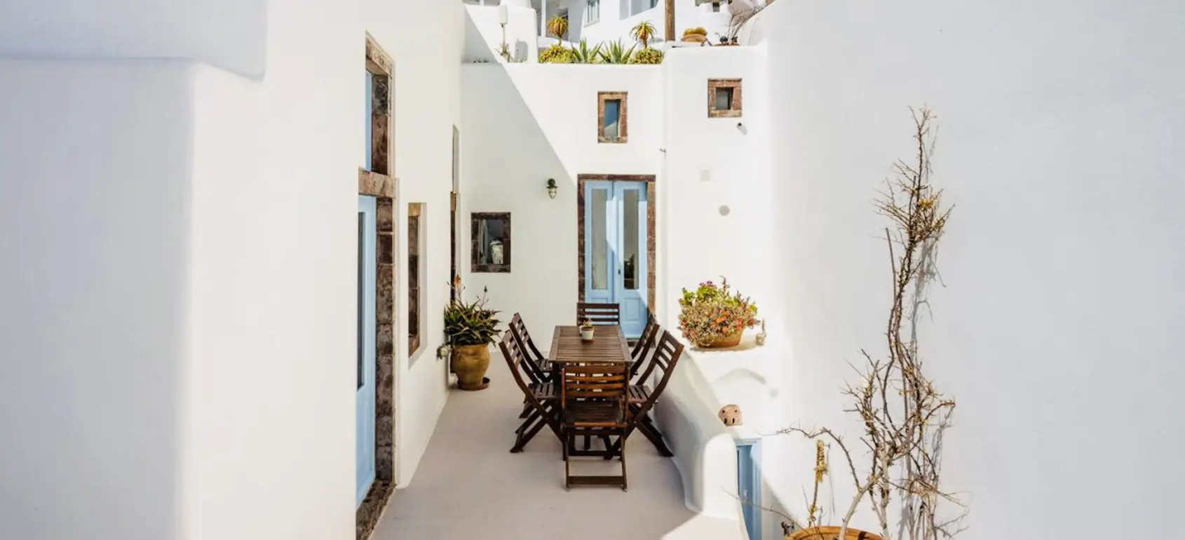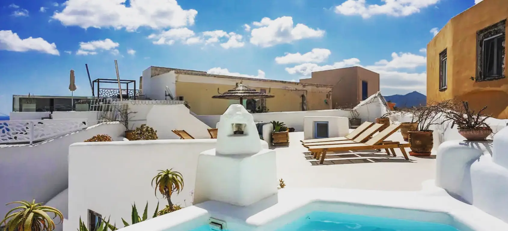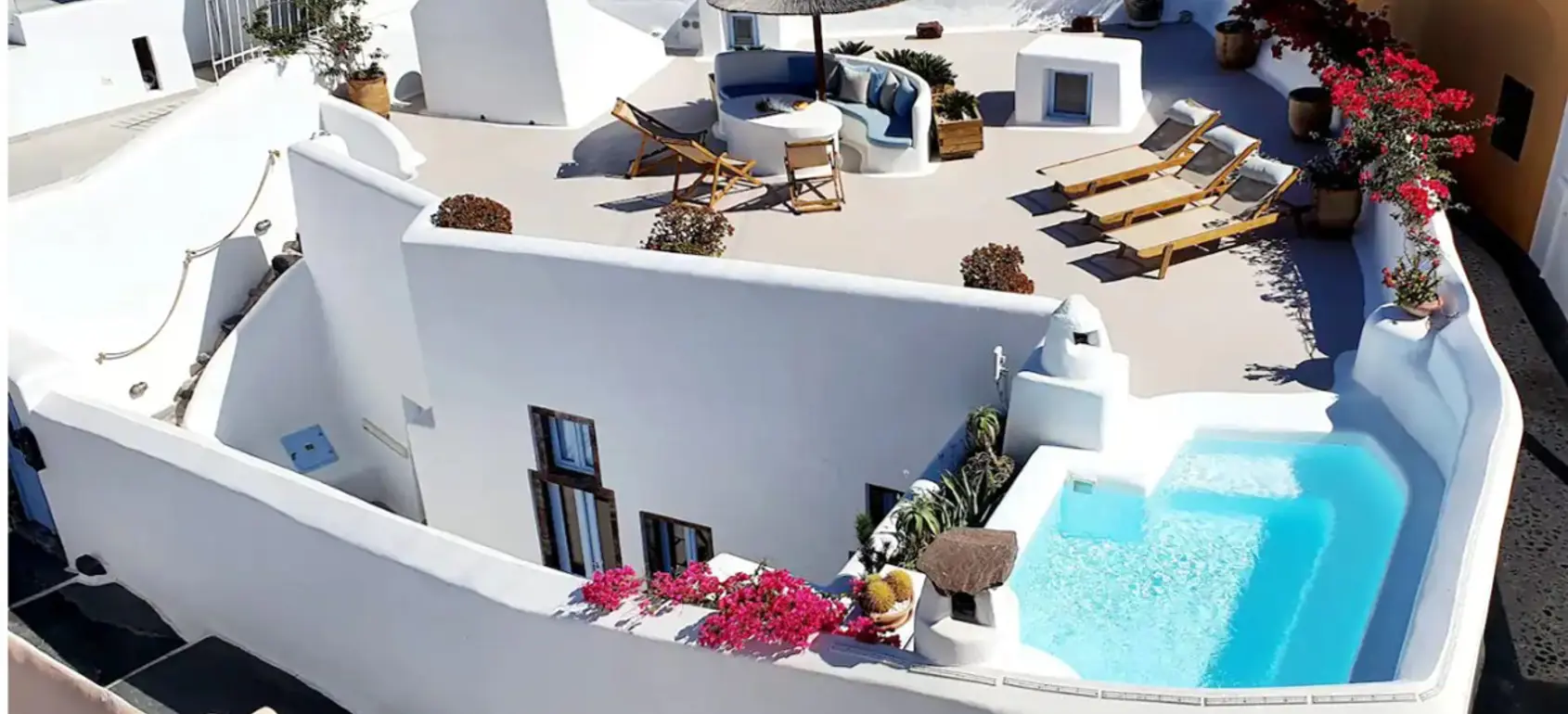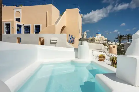 A lovingly restored traditional villa right in the heart of the old town of Fira. Just a few minutes’ walk from the famous Caldera and the main square, the villa offers luxurious accommodation providing easy access to the many restaurants and famous nightlife of the capital. The villa offers generous accommodation with 3 double bedrooms, two of which feature en-suite bathrooms, the 3rd bedroom is located underneath the main house and is accessible from the courtyard, and a luxurious lounge area offer the discerning traveller a unique opportunity to experience a true Santorinian traditional house without compromising on creature comforts. Outside, a large, private yard provides an opportunity to relax or dine al-fresco. The large roof terrace offers mountain and sea views, offering an opportunity to enjoy a spot of sunbathing or a relaxing dip in the plunge pool. The property has a valid EOT touristic licence.