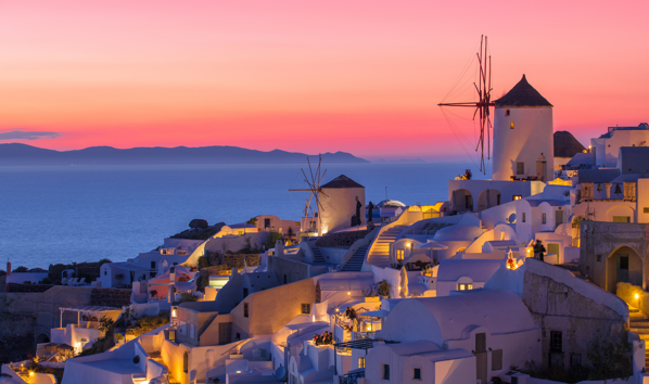 Panoramic views properties of the azure Aegean Sea and the world-famous Santorini sunset