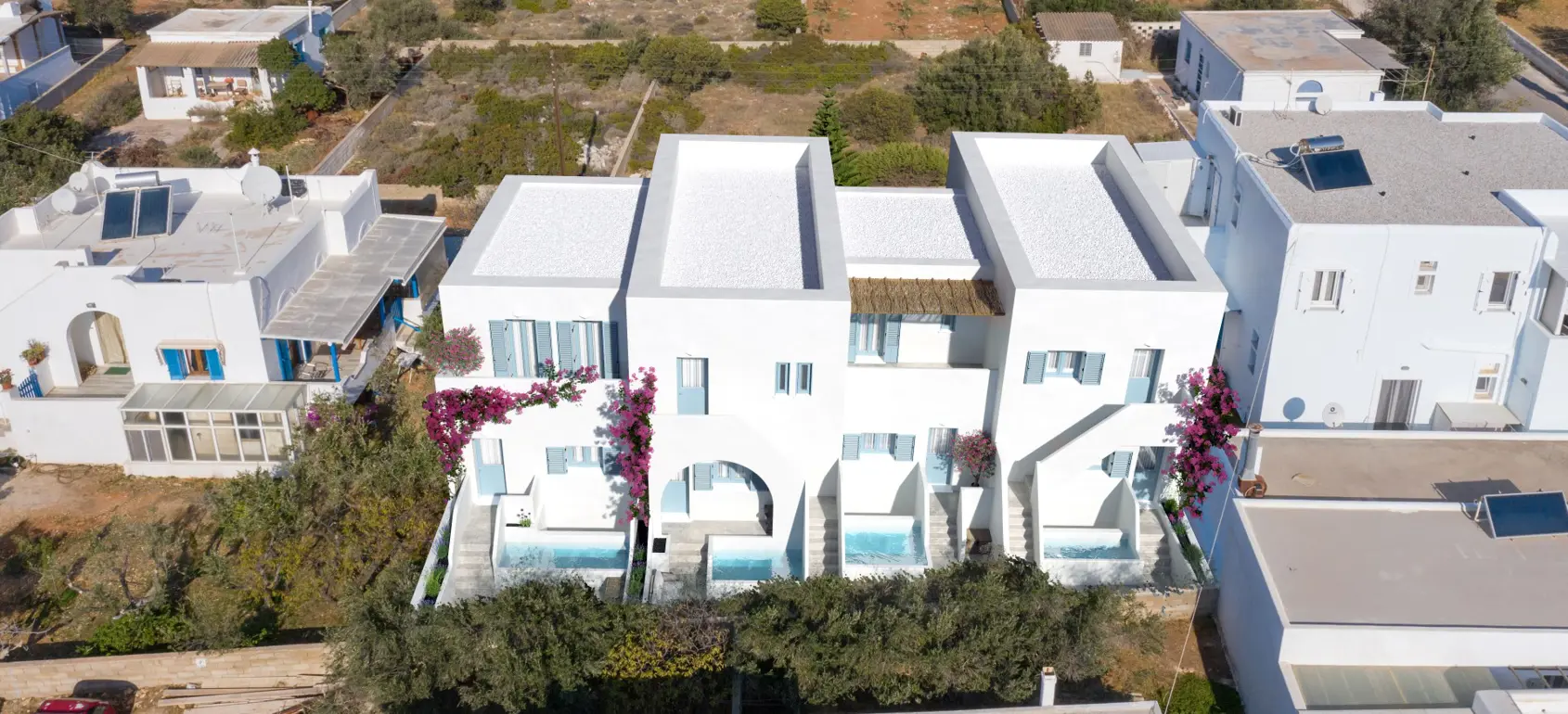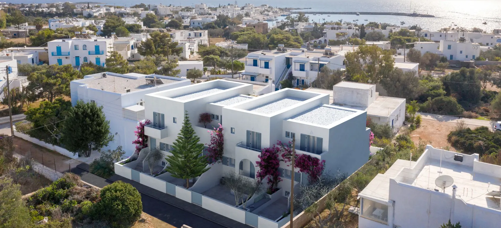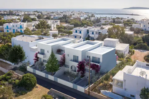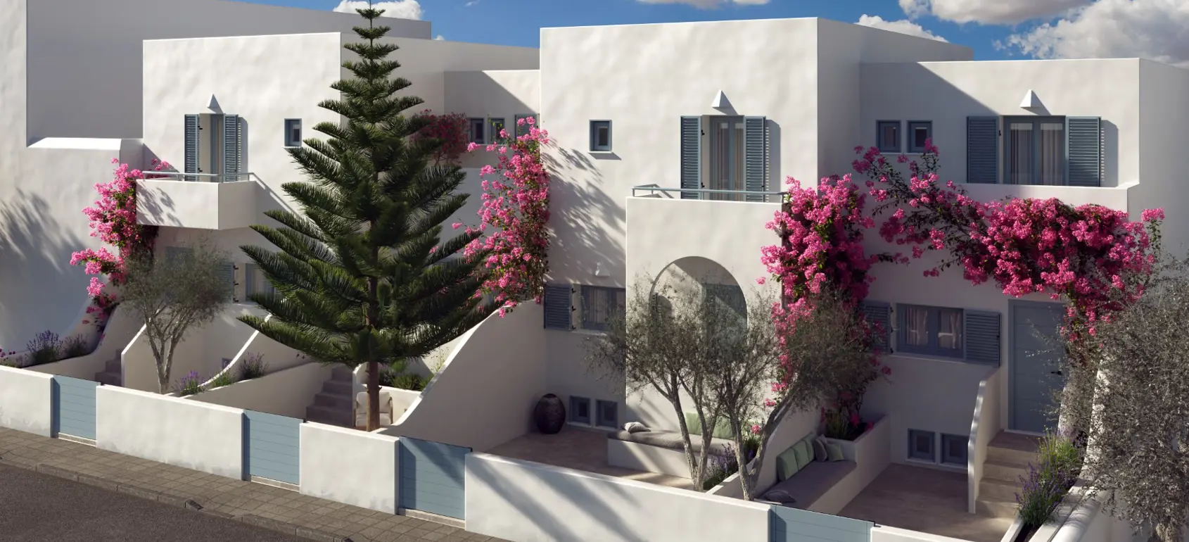 The four villas complex celebrates the main feature of the Cycladic beaches- their sun-kissed sand, soft and warm, creating outstanding color, with sunlight filling each residence with its magnificent splendor. Traditional whitewashed walls, iconic Greek marble, contemporary twists, floor-to-ceiling glass, sleek design accents, and statement fittings. Each villa boasts 4 master bedrooms, a modern kitchen, balconies, a Jacuzzi and a landscaped courtyard. Sizes range from 135sqm to 180sqm.