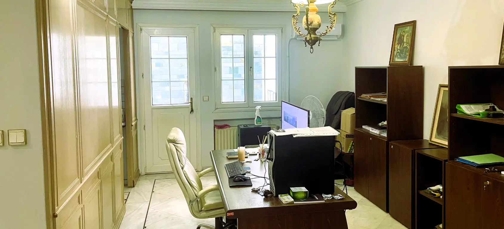 The semi-basement has independent access from the front garden with its own door and communicate with the rest of the house with an interior door. It has an area of 100 sqm and has a bathroom, a bedroom with closets, a living room, an office, a large open plan kitchen fully fitted and its own separate laundry room. At the living room there is a large fireplace lined with Pentelic marble and a wall lined with carved wood panels and a big mirror. It has 2 normal windows + 2 large windows with views to the front garden and the pool. It can also be used as an independent large apartment. The floors throughout the building are of Dionysos marble with decorative bronze elements. The floors in the bedrooms are walnut. All the windows and patio doors are double glazing and all the external surrounding walls have internal sound and double 10 cm thermal insulation.
