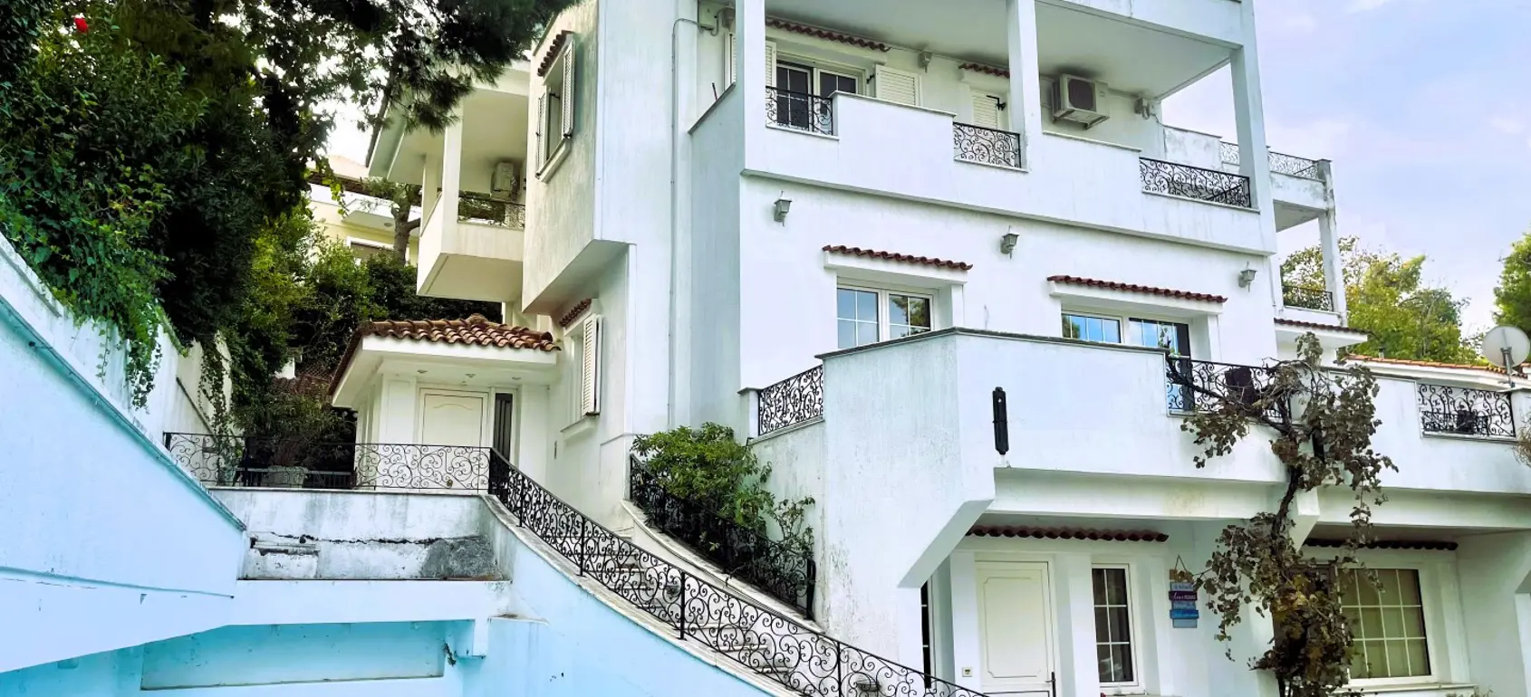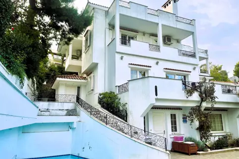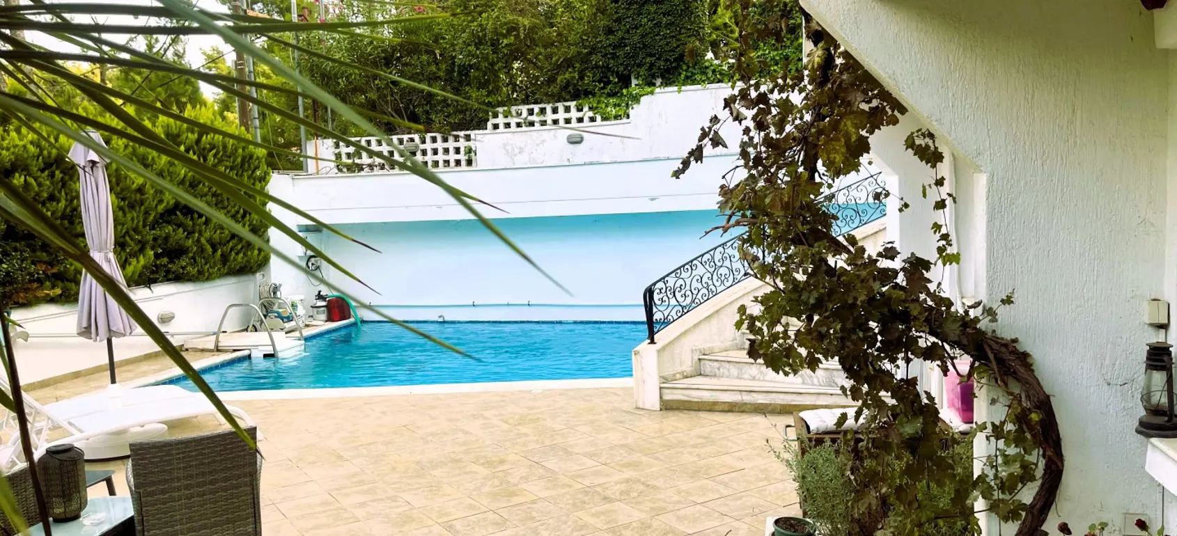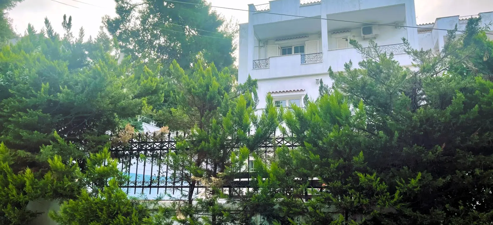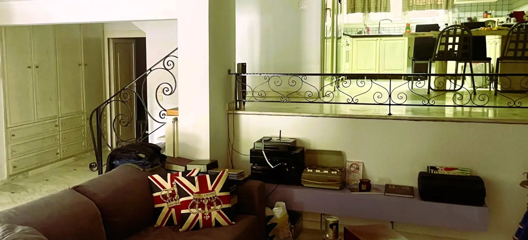 Entering to the house from the main entrance there is a large reception area. From there, there is access to the semi-basement and to the main area. The main area is divided into a living room, a dining room and the kitchen. The living room has a large fireplace lined with Pentelic marble, large double window overlooking the small opposite forest and double patio doors leading to a very large 40 sqm porch overlooking the front garden and the pool. The dining room has a double window and a door with access to the rear garden. One of the dining room walls is lined with carved wood panels and a mirrored door which leads to a large kitchen. The kitchen is fully fitted, it has a large closed storage space. Between the main area and the 1st floor, there is a triple wardrobe and a 16 sqm closed storage space with a big window for natural lighting.