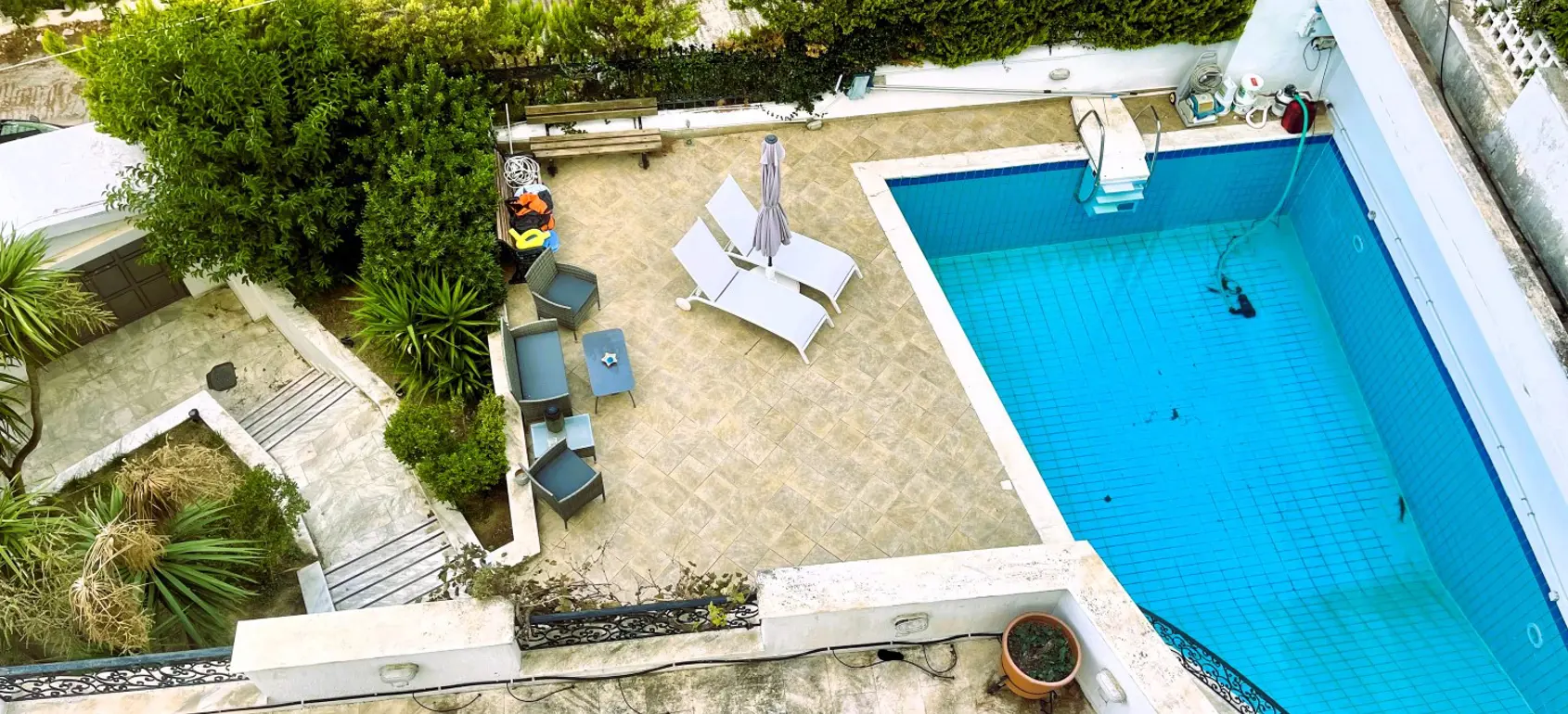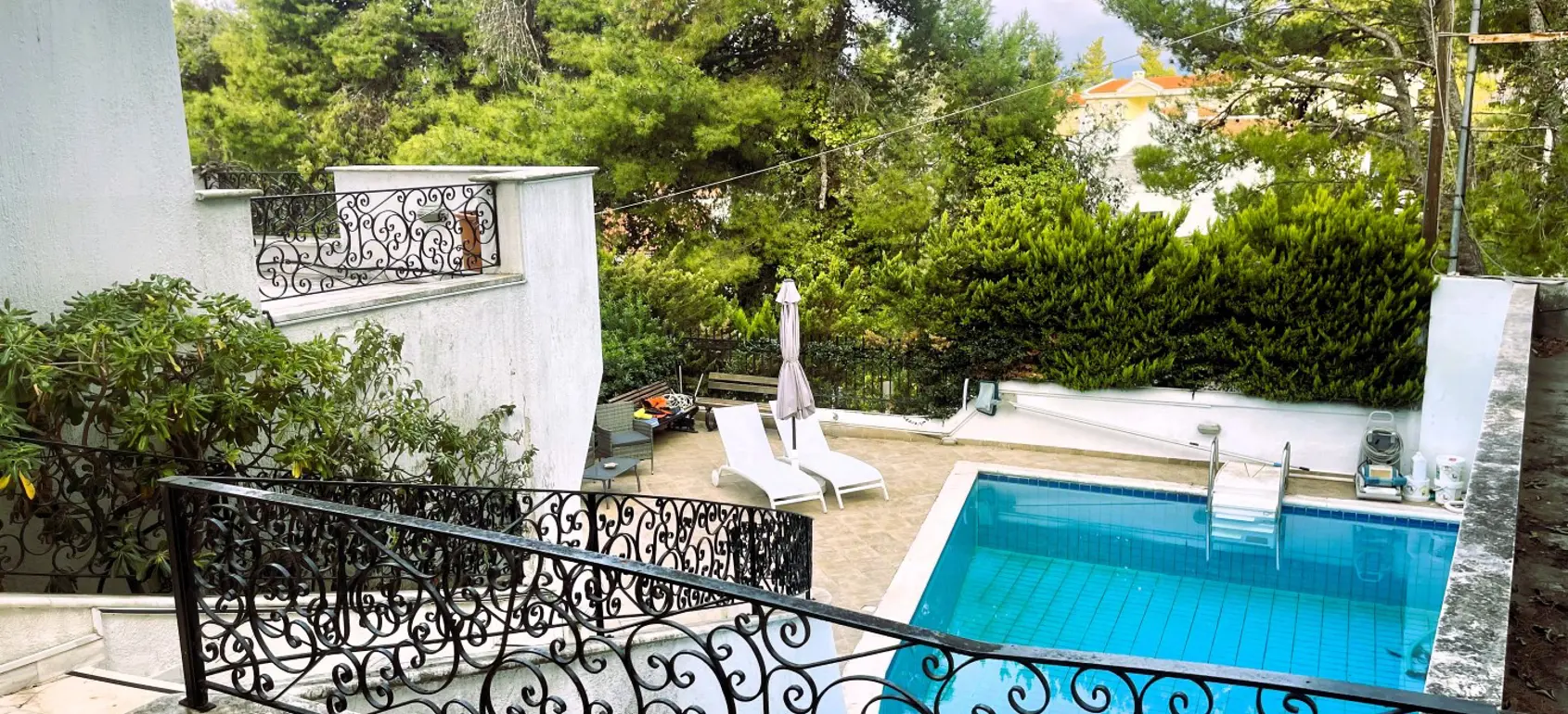 The heating is achieved either with autonomous oil heating where each radiator body has thermostatic heads and each floor has automatic thermostats, or with the use of the air conditioning inverters that are present throughout the house. The external surrounding area is covered with Dionysos marble, while the back garden is covered with natural Karystos stone. The pool is 6.10 x 11 meters, 3 meters deep.