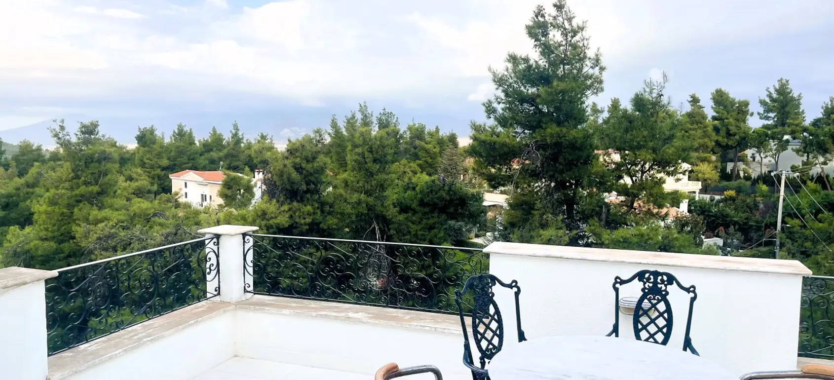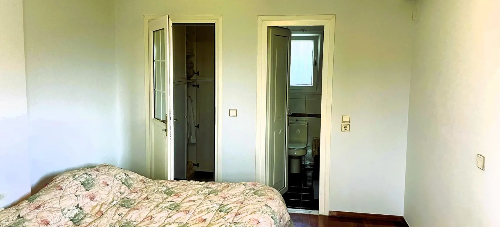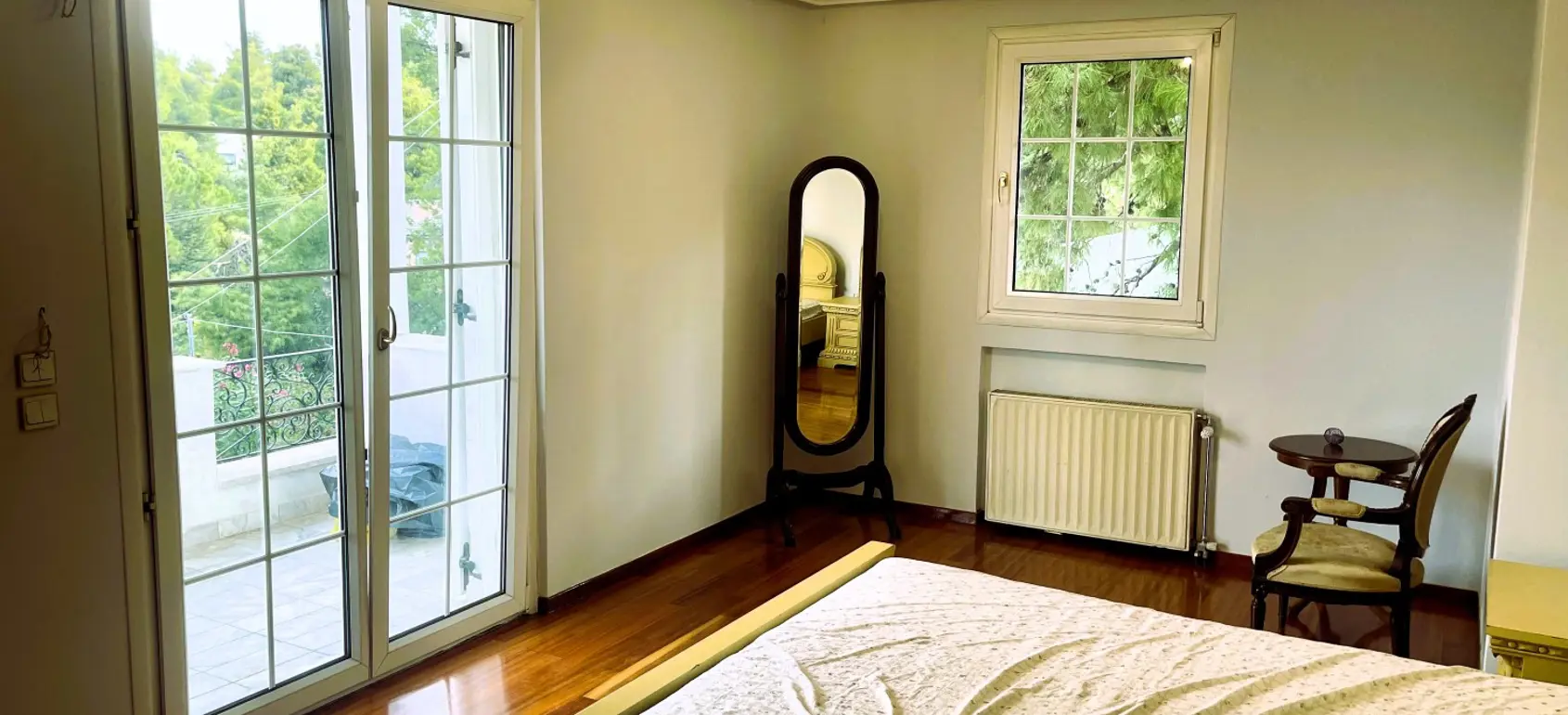 The first floor consists of a master bedroom with its own bathroom, walk-in closet, and a large porch overlooking the front garden and the pool, and two large bedrooms with a large bathroom. The two bedrooms are having their own closets and porches with view to the rear garden. Outside of the bedrooms there is a big wardrobe. The second floor includes a through master bedroom with its own bathroom and walk-in closet, two windows and a door leading to a 45 sqm open terrace with an unobstructed view of Mount Parnitha and Athens area.