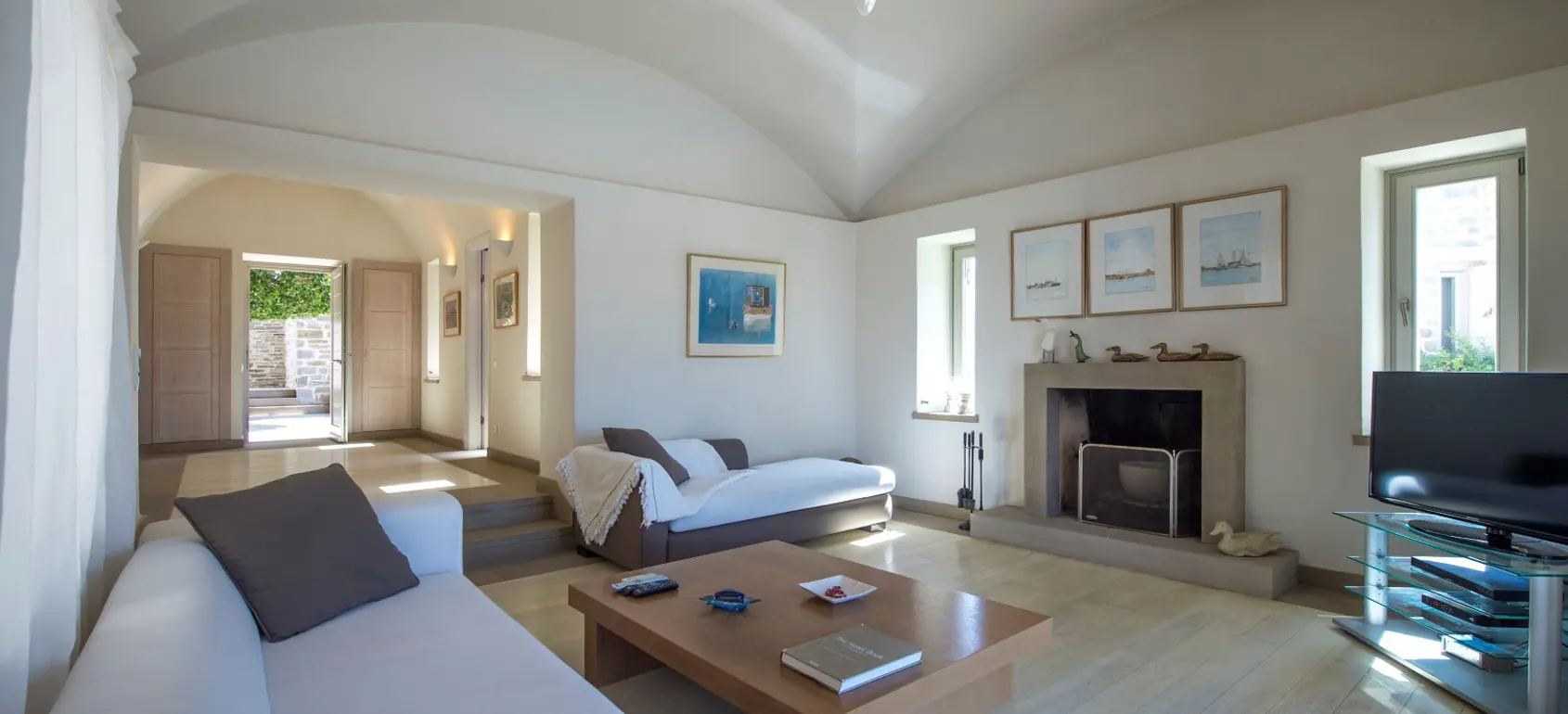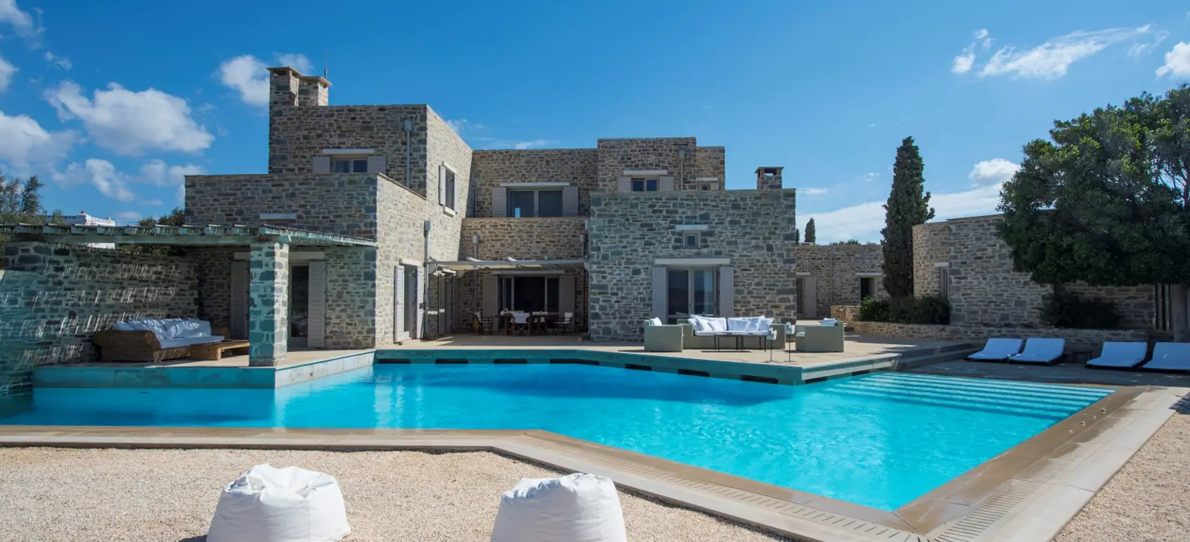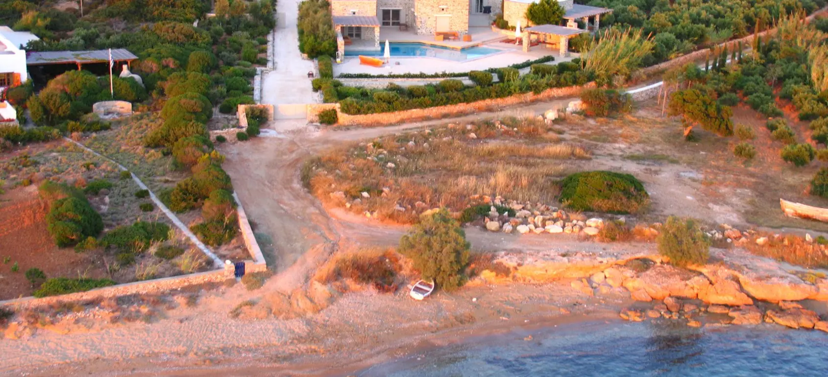 Seafront villa in an 11,000sqm estate. It has 6 bedrooms that can accommodate 12 to 14 guests. The main building consists of a spacious living room, a dining area and a fully equipped kitchen. On the first floor there is a double bedroom with an en-suite bathroom.