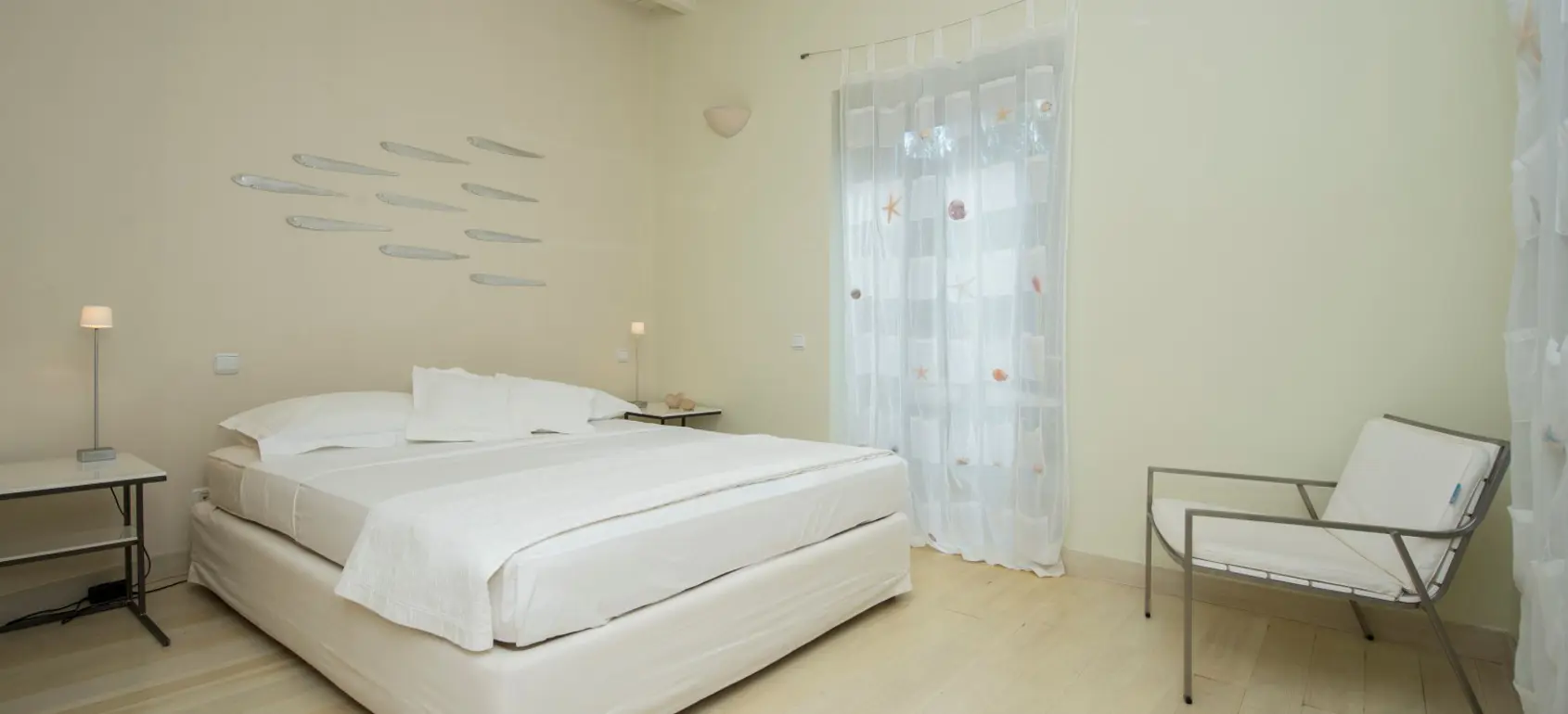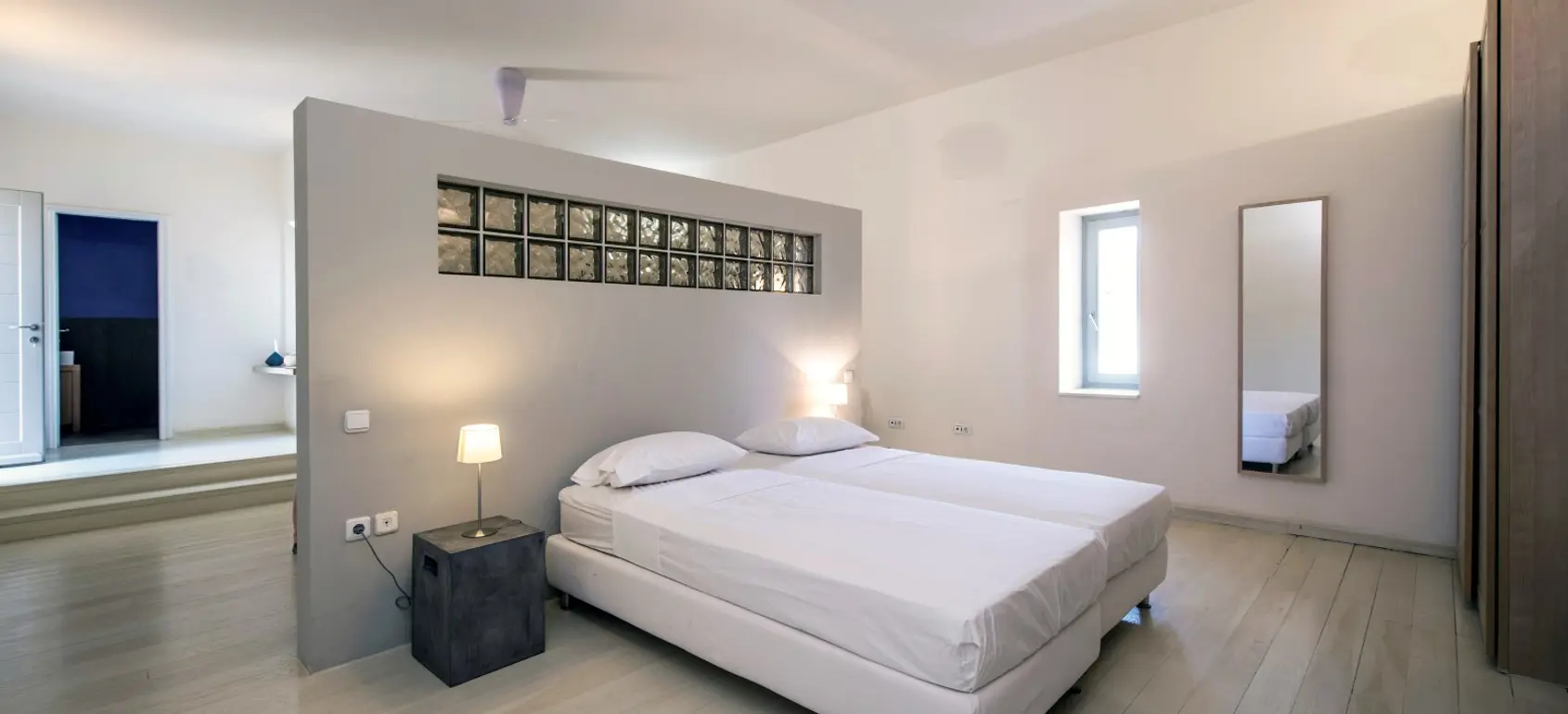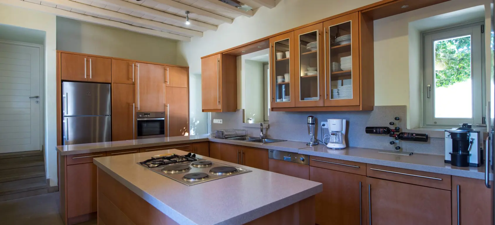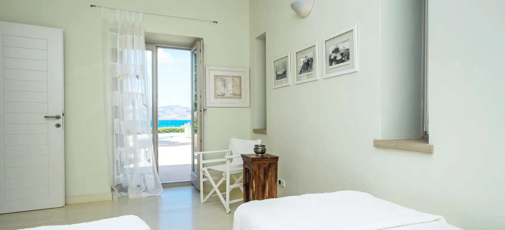 Seafront villa in an 11,000sqm estate. It has 6 bedrooms that can accommodate 12 to 14 guests. The main building consists of a spacious living room, a dining area and a fully equipped kitchen. On the first floor there is a double bedroom with an en-suite bathroom.