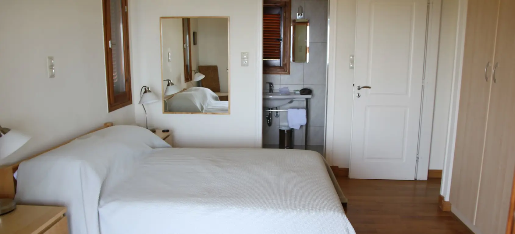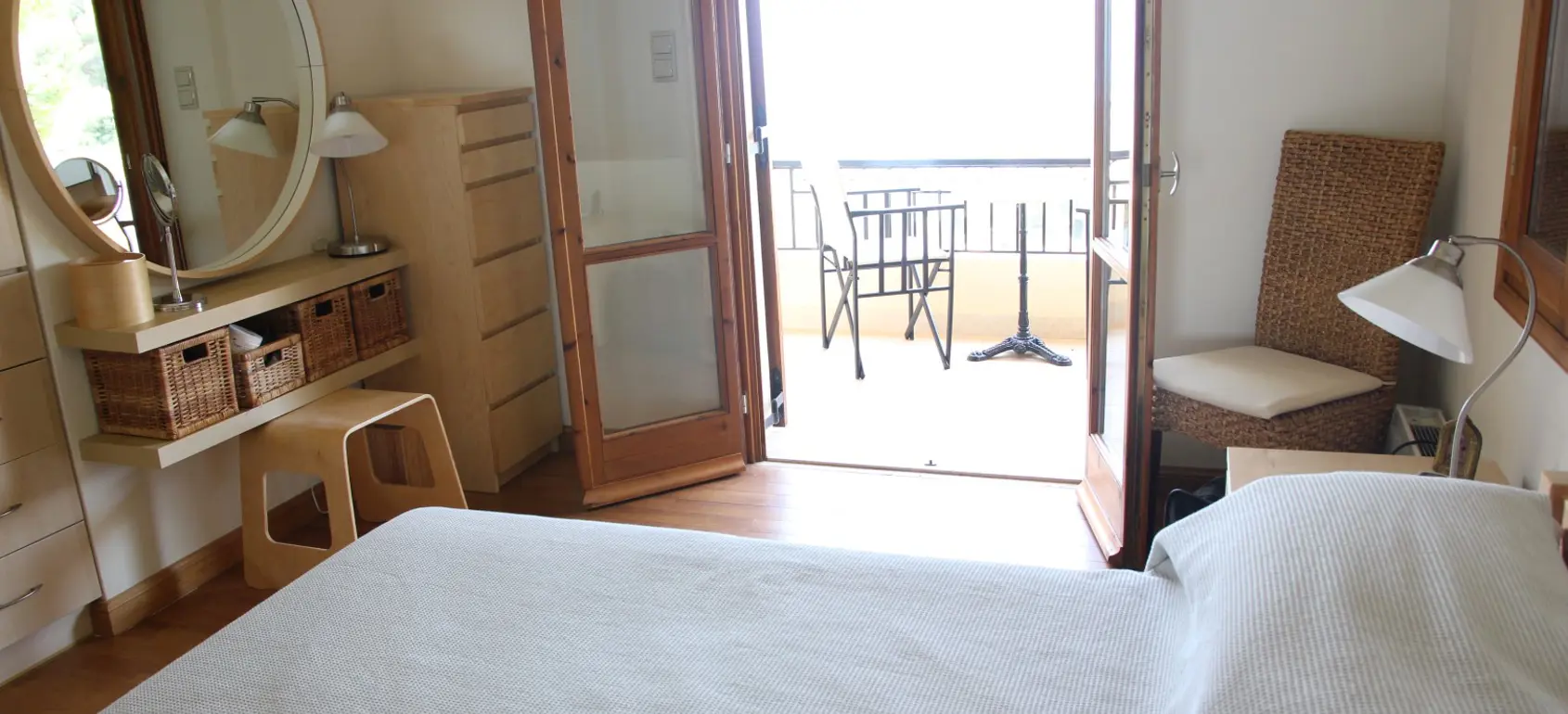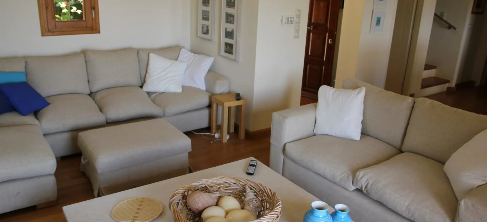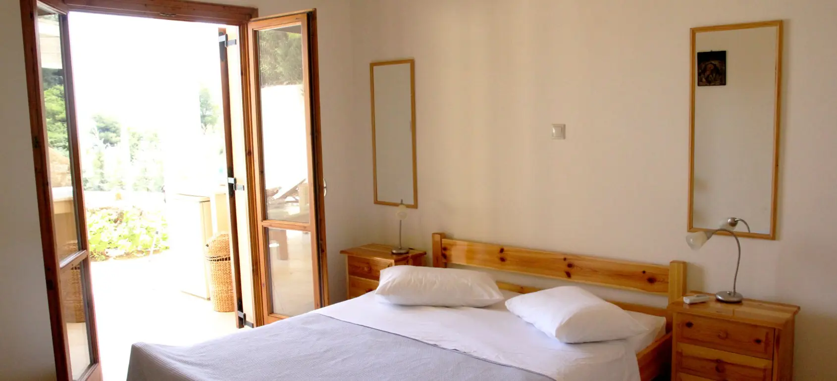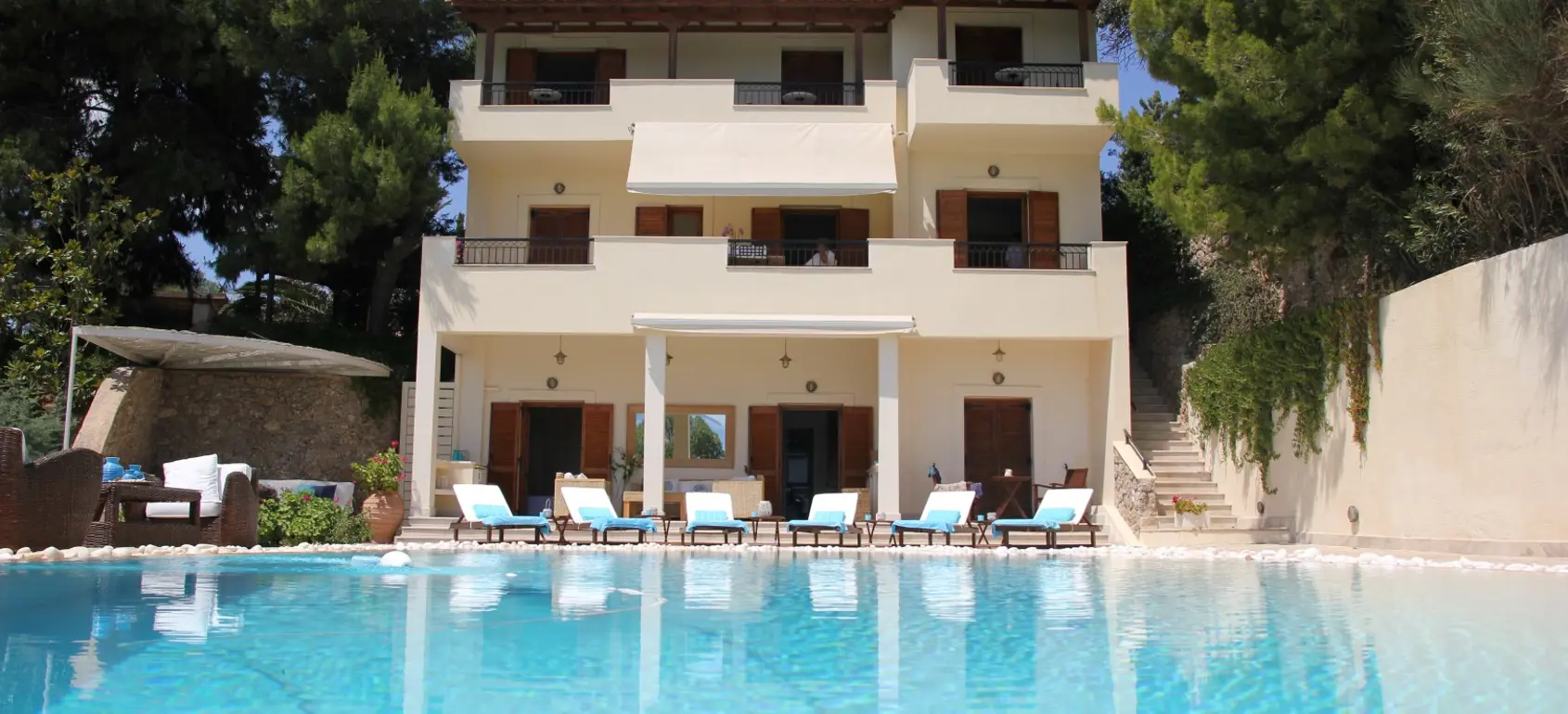 The villa, which is fully air-conditioned and is spread over three levels. The ground floor consists of two en-suite bedrooms, each with a double bed, which lead to a shared living area. The balcony doors open onto private verandas and to the pool area. On the first floor there are two en-suite bedrooms with double beds and one bedroom with two single beds. Each room has its own terrace with sea views. After parking, you will reach a garden through one of the many dining areas, which are covered by a gazebo. This area is always shady, cool and sheltered and offers stunning views of Hydra. The main entrance leads to a hallway connecting a spacious living and dining area and a separate fully equipped modern kitchen. All rooms lead out onto a terrace with another dining and seating area, always with sea views.