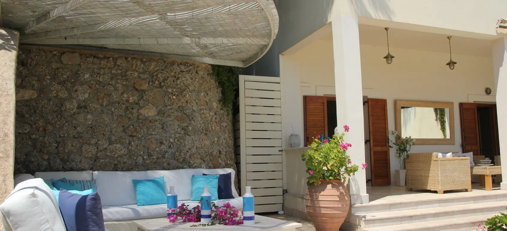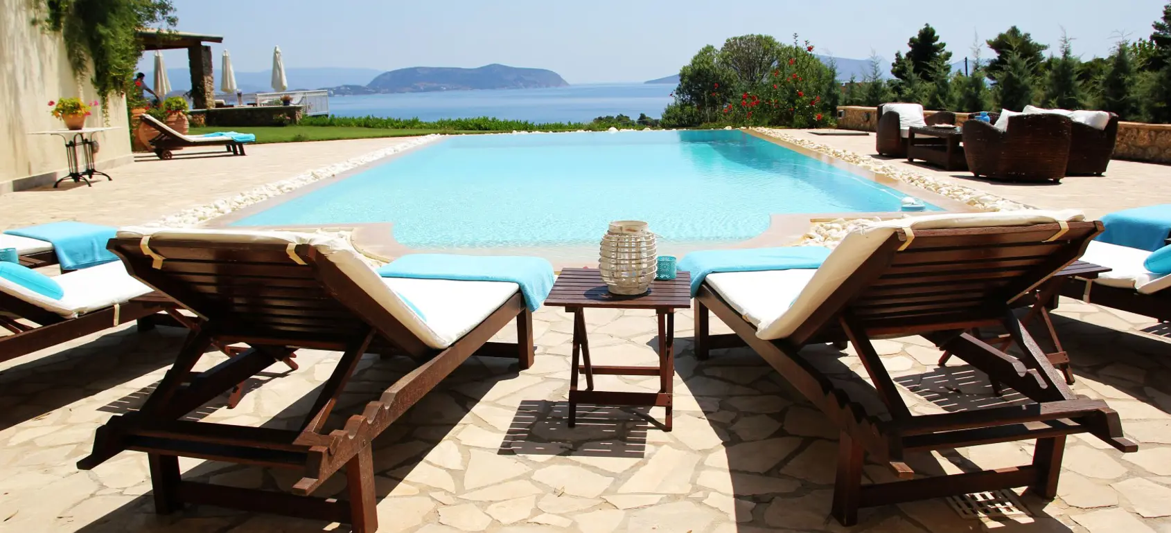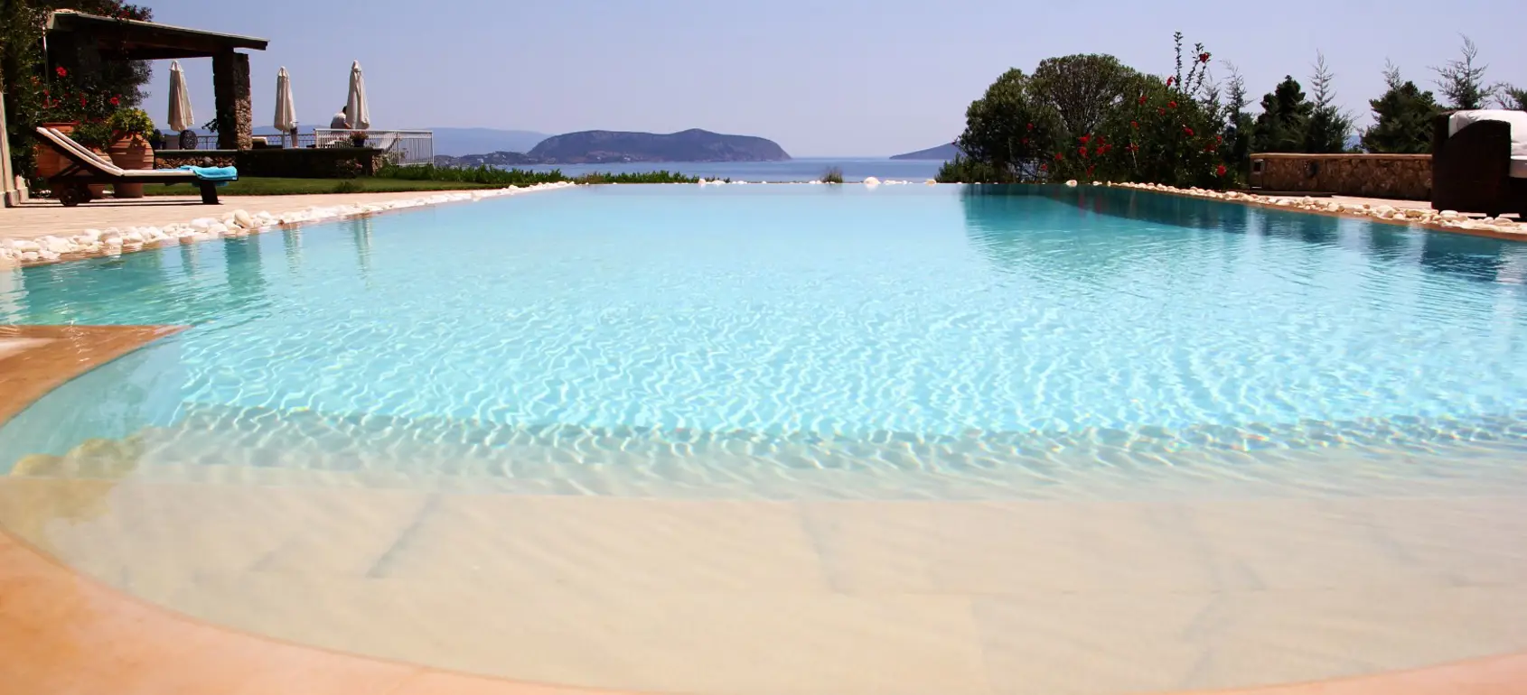 The property extends over 1,800 sqm with flowers and pine trees. It is located opposite a secluded beach, a five-minute walk away, and is visible from all rooms of the house. The front and back gardens offer plenty of options for sunbathing or enjoying moments of relaxation. The spacious pool area with a 65 sqm infinity pool offers unique areas for sunbathing. Near the pool is a luxurious bathroom with wc and outdoor shower. This area leads to a garden and to the shaded barbecue area with a huge dining table for eighteen people and a seating area on a raised terrace. An ideal place to relax in the evening, enjoying the unique views that this property offers.
