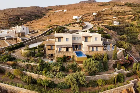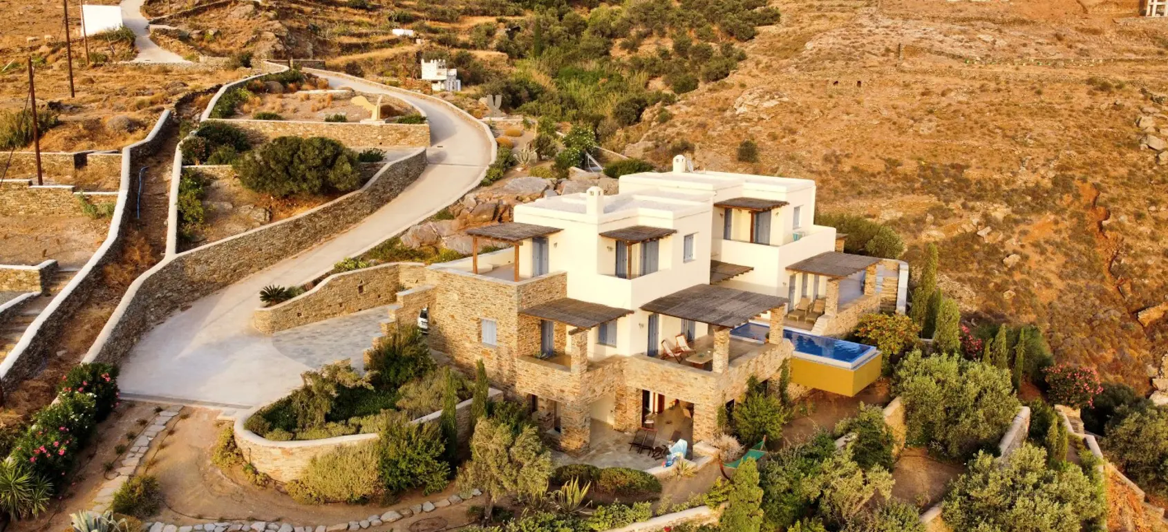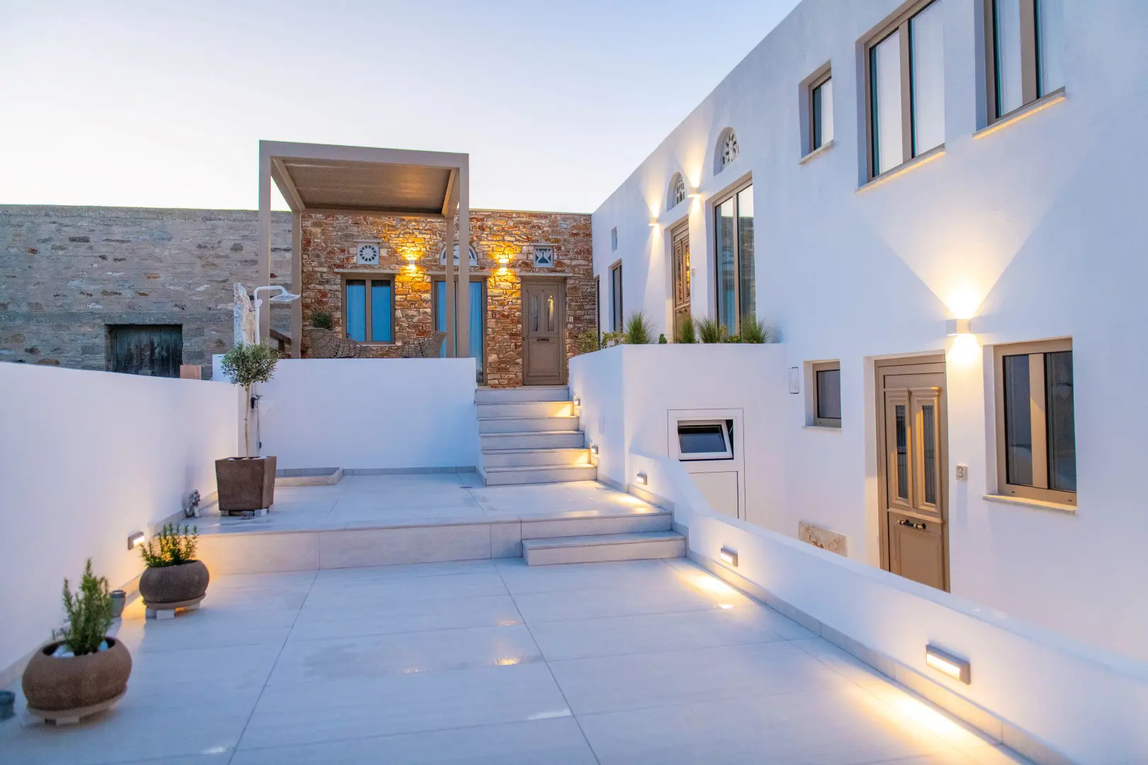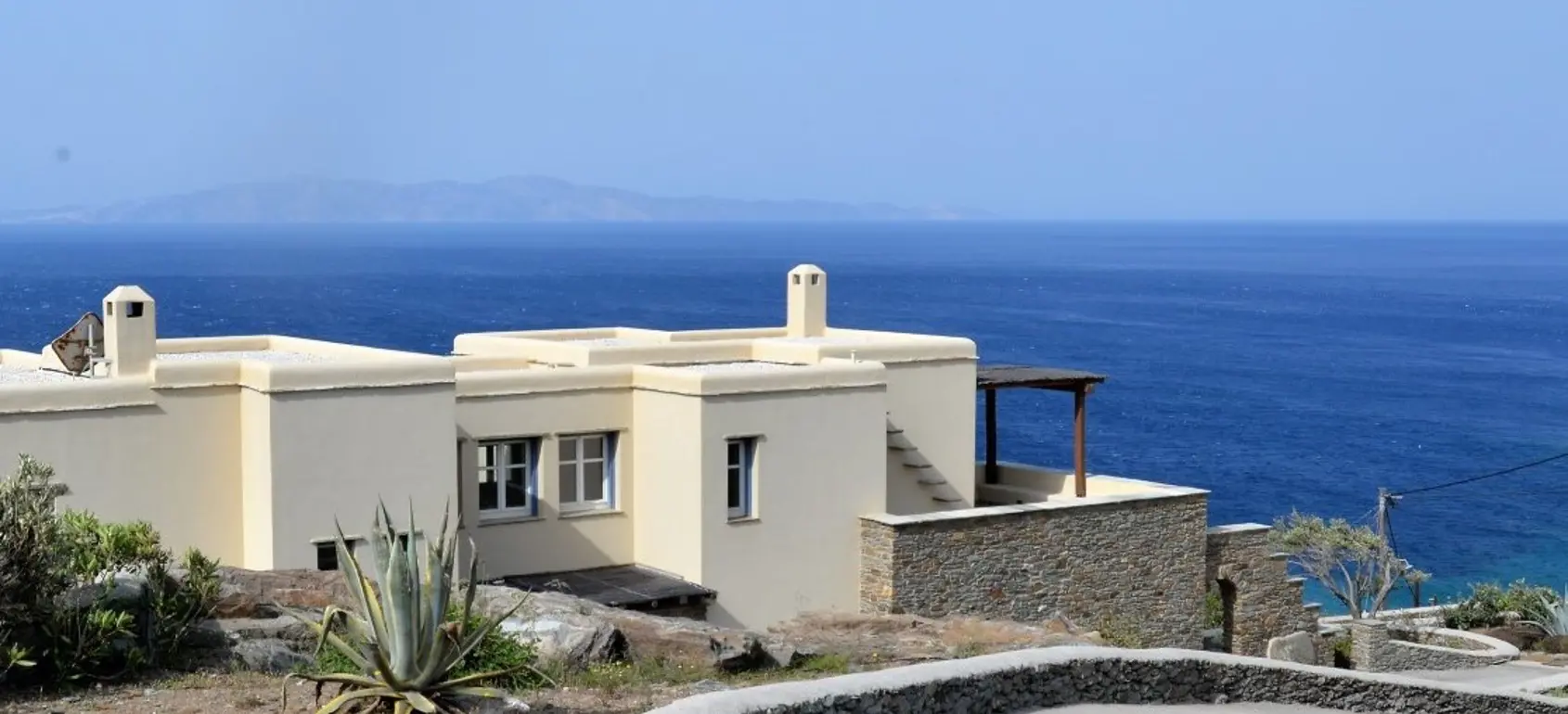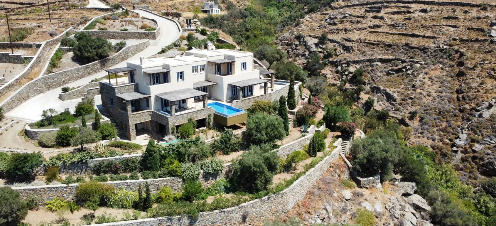 Located in Agios Romanos area, this stunning property has been landscaped with large terraces to ensure an uninterrupted view that will never be obstructed. The nearest beach is just 150 meters away via a traditional stone-paved path that passes right outside the garden gate, with an elevation difference of 65 meters.