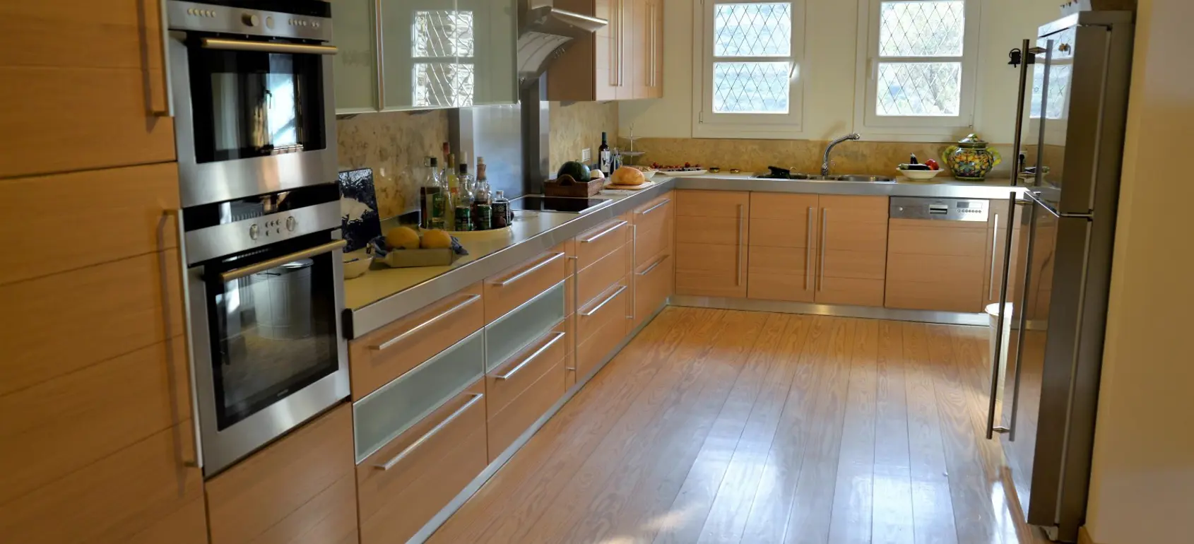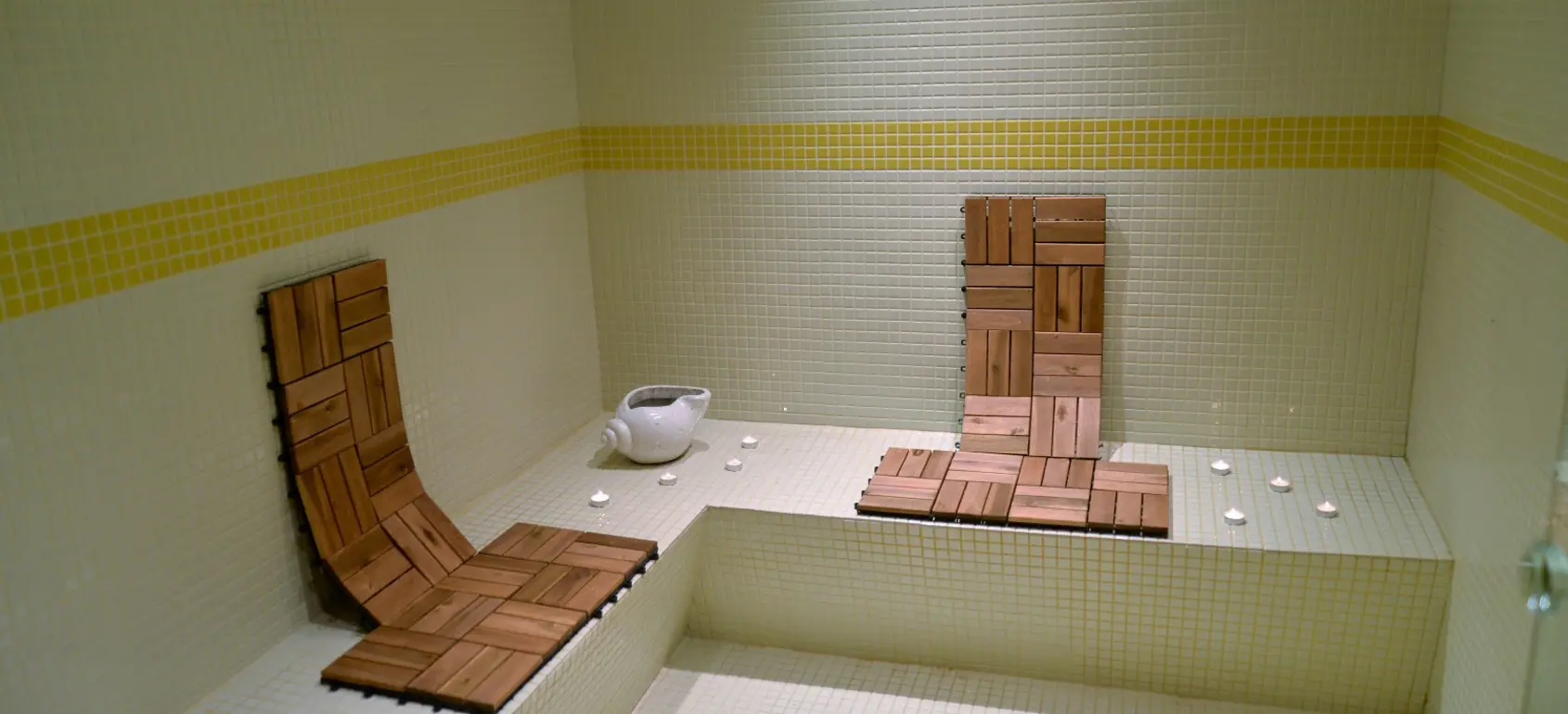 A self-contained apartment of 80 sqm, comprising two bedrooms, an open-plan living room and kitchen, a corridor, and a bathroom. It has direct access to covered terraces at the garden level, with both a private external entrance and an internal connection to the main house. Primary-use areas including a bedroom with an en-suite bathroom and a hammam room. Utility spaces comprising a boiler room, fuel storage, boiler area, general storage, and a dedicated laundry-drying room. A 15 sqm pool equipment room and water reservoir.