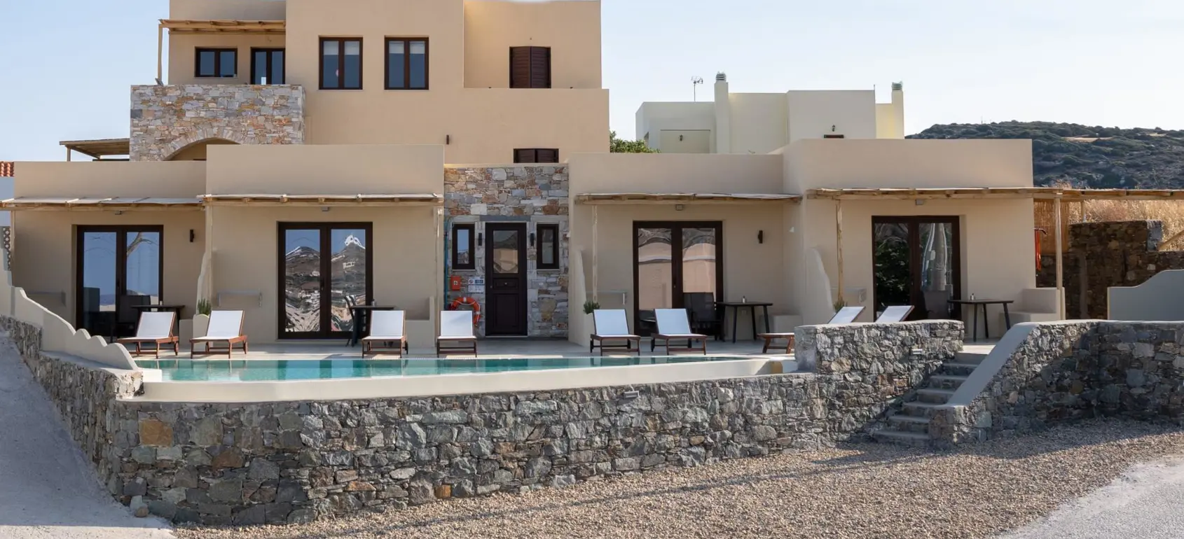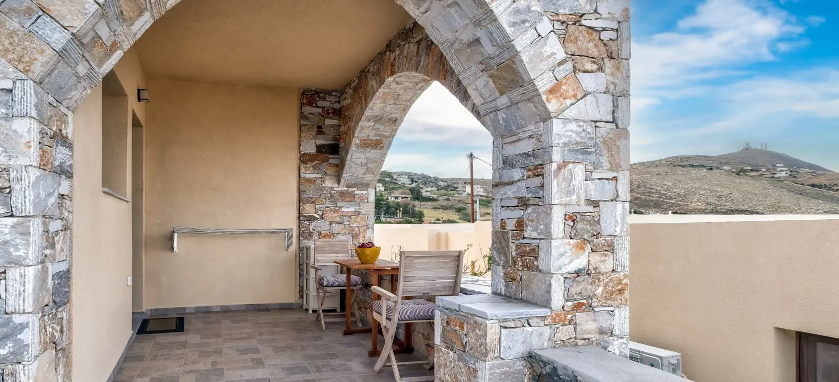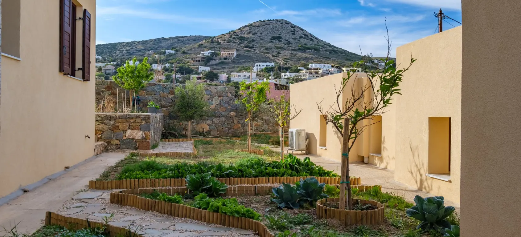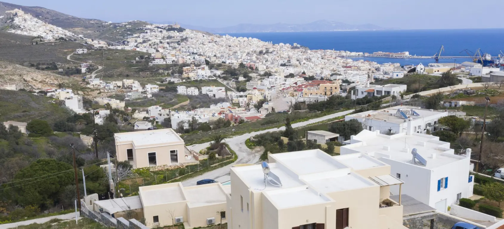 Located within a superb lush green area, rare for the Cycladic landscape, this complex is only a few minutes away from the island’s capital, Ermoupolis. An excellent construction with impressive stone architectural elements, this 300 sqm property set on a 1,005 sqm plot, offers four ground-floor studios, and two apartments of 95 sqm. and 75 sqm. Each of them features open concept living/dining rooms and kitchens that offer amazing views of the sea during the day and night-time Ermoupolis’ city lights. The ground floor apartment has two bedrooms and one bathroom, and the upper floor apartment has three bedrooms and two bathrooms. Both the apartments as well as the studios are functional and aesthetically pleasing displaying exceptional craftsmanship, granite floors, fitting wardrobes, and top of the line appliances. Large verandas with pergolas overlook the stunning natural surroundings, and the perfectly manicured gardens with fruit trees and vegetables. Outdoor amenities include a pool in front of a spacious patio, a fenced children playground, an exterior gym, a grill for outdoor cooking enthusiasts and able parking space. This is a highly equipped property with environmentally friendly and sophisticated design, providing all the contemporary comforts with proper energy management and efficiency. A great find for extended families looking for easy access and public transport, or natural beauty aficionados who would love to take the 10 minutes walking path to the city. This exquisite property is offered furnished, and includes a utility room with washer, dryer, ironing board, 2 vending machines and linen storage. It is ideal for owner-occupation, tourist development or short/long term rental. Simply, a secure and profitable investment with the advantages of life into nature within the city limits.