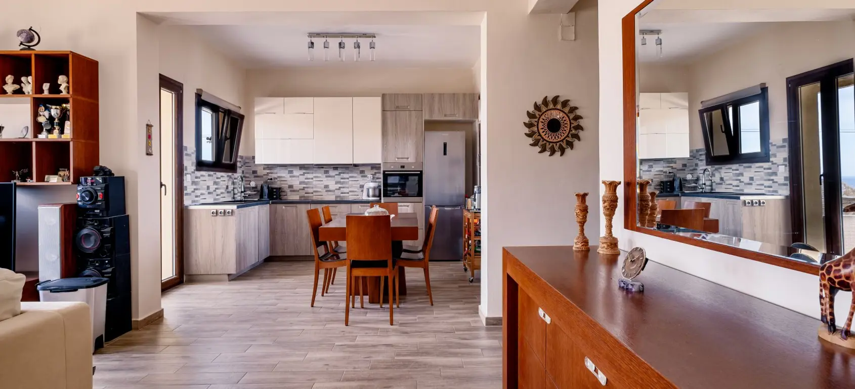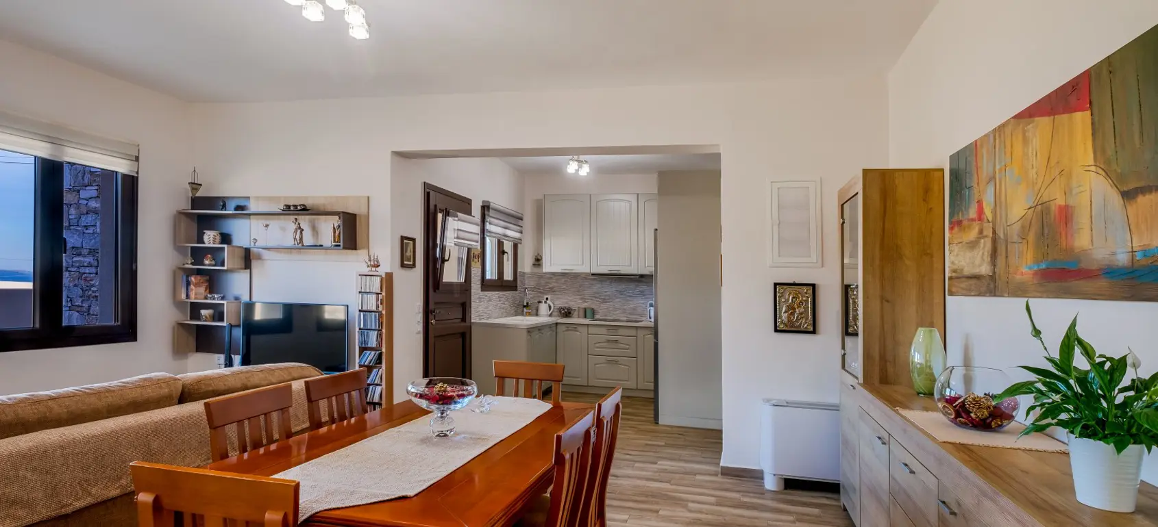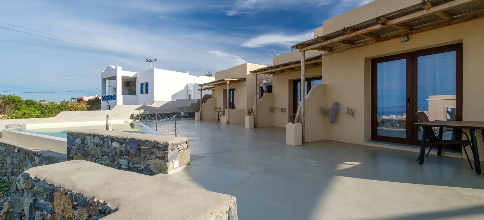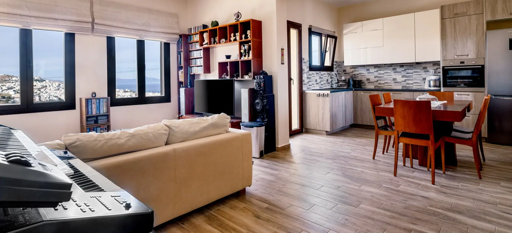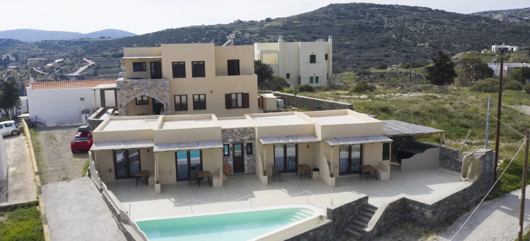 Located within a superb lush green area, rare for the Cycladic landscape, this complex is only a few minutes away from the island’s capital, Ermoupolis. An excellent construction with impressive stone architectural elements, this 300 sqm property set on a 1,005 sqm plot, offers four ground-floor studios, and two apartments of 95 sqm. and 75 sqm. Each of them features open concept living/dining rooms and kitchens that offer amazing views of the sea during the day and night-time Ermoupolis’ city lights. The ground floor apartment has two bedrooms and one bathroom, and the upper floor apartment has three bedrooms and two bathrooms. Both the apartments as well as the studios are functional and aesthetically pleasing displaying exceptional craftsmanship, granite floors, fitting wardrobes, and top of the line appliances. Large verandas with pergolas overlook the stunning natural surroundings, and the perfectly manicured gardens with fruit trees and vegetables. Outdoor amenities include a pool in front of a spacious patio, a fenced children playground, an exterior gym, a grill for outdoor cooking enthusiasts and able parking space. This is a highly equipped property with environmentally friendly and sophisticated design, providing all the contemporary comforts with proper energy management and efficiency. A great find for extended families looking for easy access and public transport, or natural beauty aficionados who would love to take the 10 minutes walking path to the city. This exquisite property is offered furnished, and includes a utility room with washer, dryer, ironing board, 2 vending machines and linen storage. It is ideal for owner-occupation, tourist development or short/long term rental. Simply, a secure and profitable investment with the advantages of life into nature within the city limits.