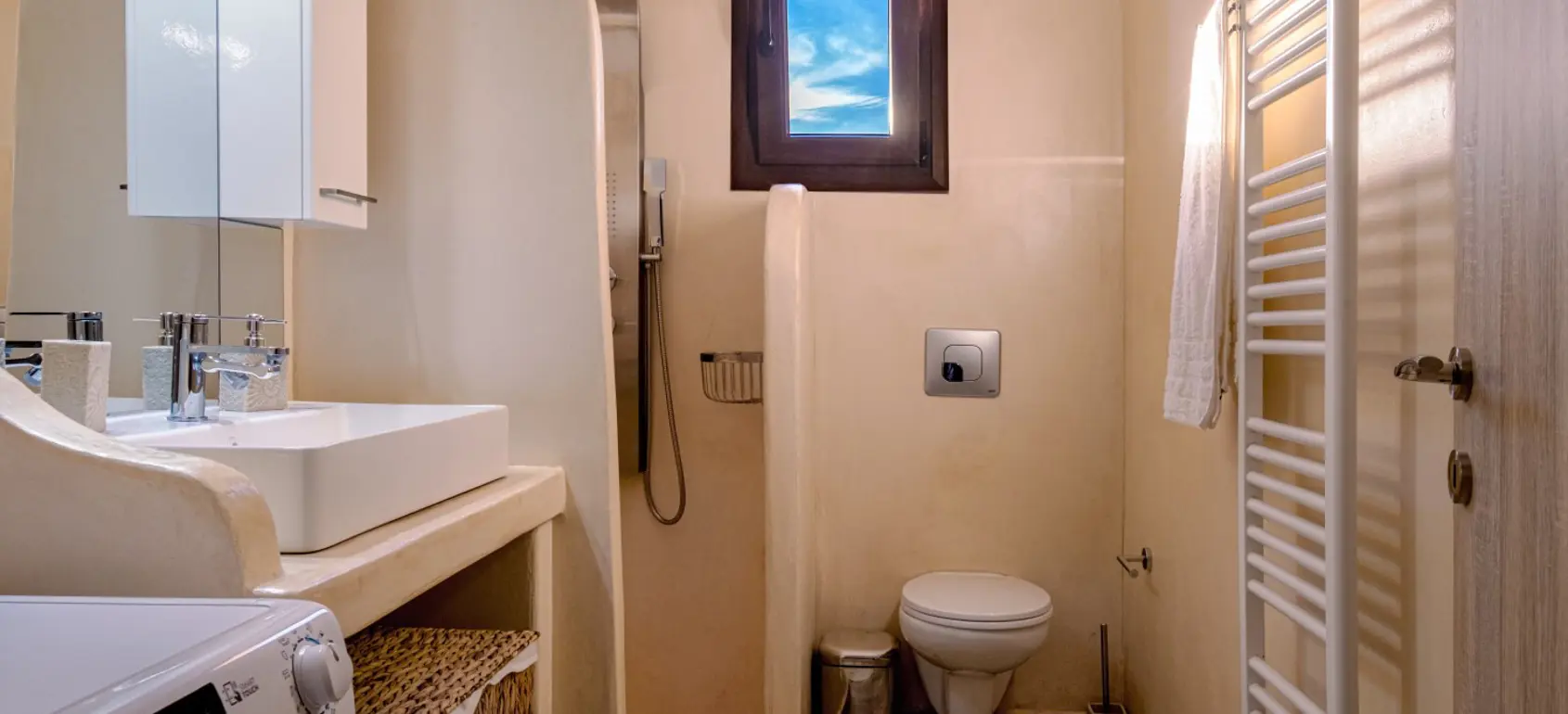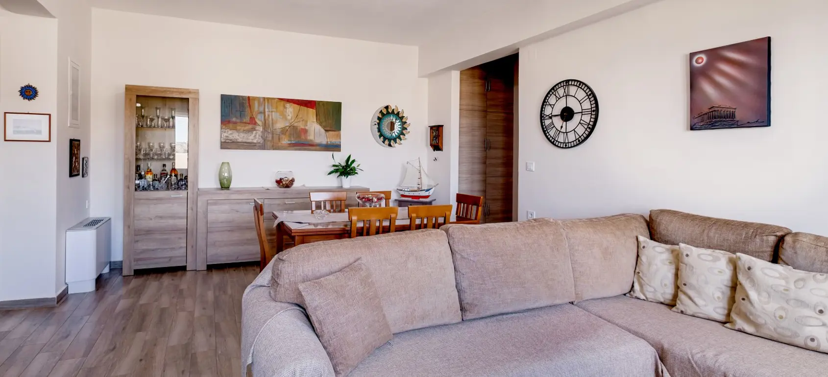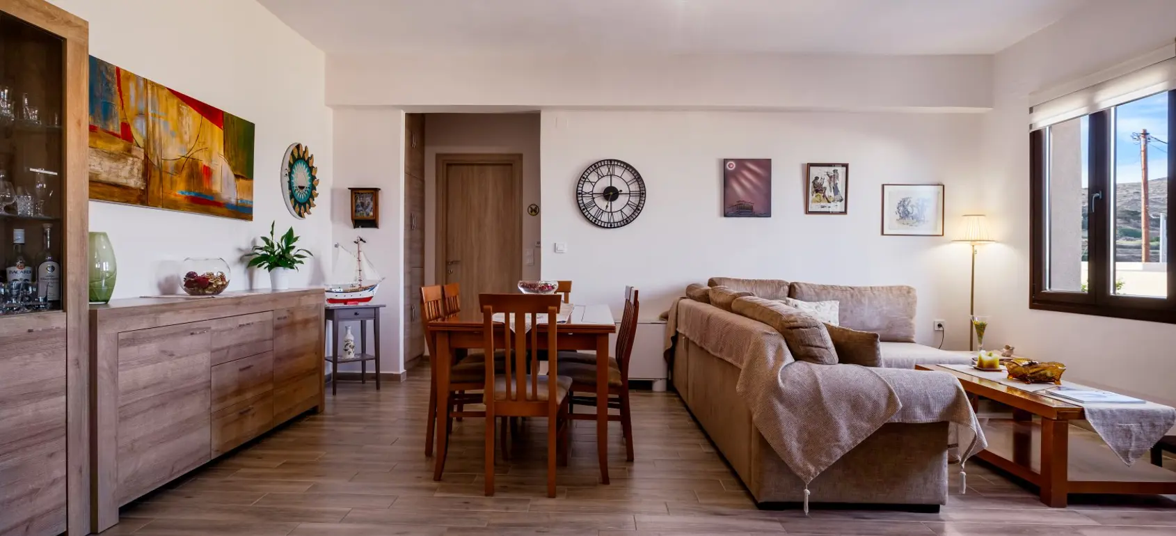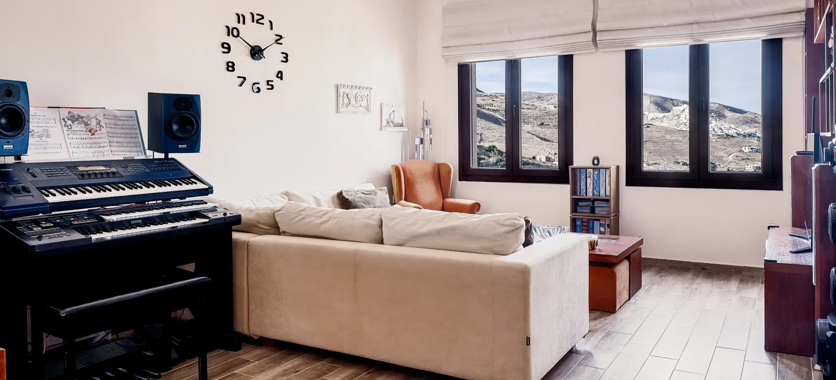 Located within a superb lush green area, rare for the Cycladic landscape, this complex is only a few minutes away from the island’s capital, Ermoupolis. An excellent construction with impressive stone architectural elements, this 300 sqm property set on a 1,005 sqm plot, offers four ground-floor studios, and two apartments of 95 sqm. and 75 sqm. Each of them features open concept living/dining rooms and kitchens that offer amazing views of the sea during the day and night-time Ermoupolis’ city lights. The ground floor apartment has two bedrooms and one bathroom, and the upper floor apartment has three bedrooms and two bathrooms. Both the apartments as well as the studios are functional and aesthetically pleasing displaying exceptional craftsmanship, granite floors, fitting wardrobes, and top of the line appliances. Large verandas with pergolas overlook the stunning natural surroundings, and the perfectly manicured gardens with fruit trees and vegetables. Outdoor amenities include a pool in front of a spacious patio, a fenced children playground, an exterior gym, a grill for outdoor cooking enthusiasts and able parking space. This is a highly equipped property with environmentally friendly and sophisticated design, providing all the contemporary comforts with proper energy management and efficiency. A great find for extended families looking for easy access and public transport, or natural beauty aficionados who would love to take the 10 minutes walking path to the city. This exquisite property is offered furnished, and includes a utility room with washer, dryer, ironing board, 2 vending machines and linen storage. It is ideal for owner-occupation, tourist development or short/long term rental. Simply, a secure and profitable investment with the advantages of life into nature within the city limits.