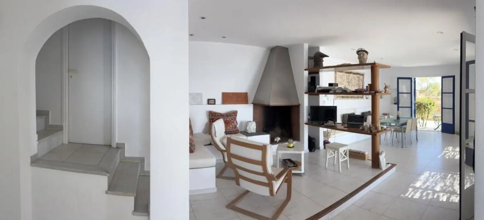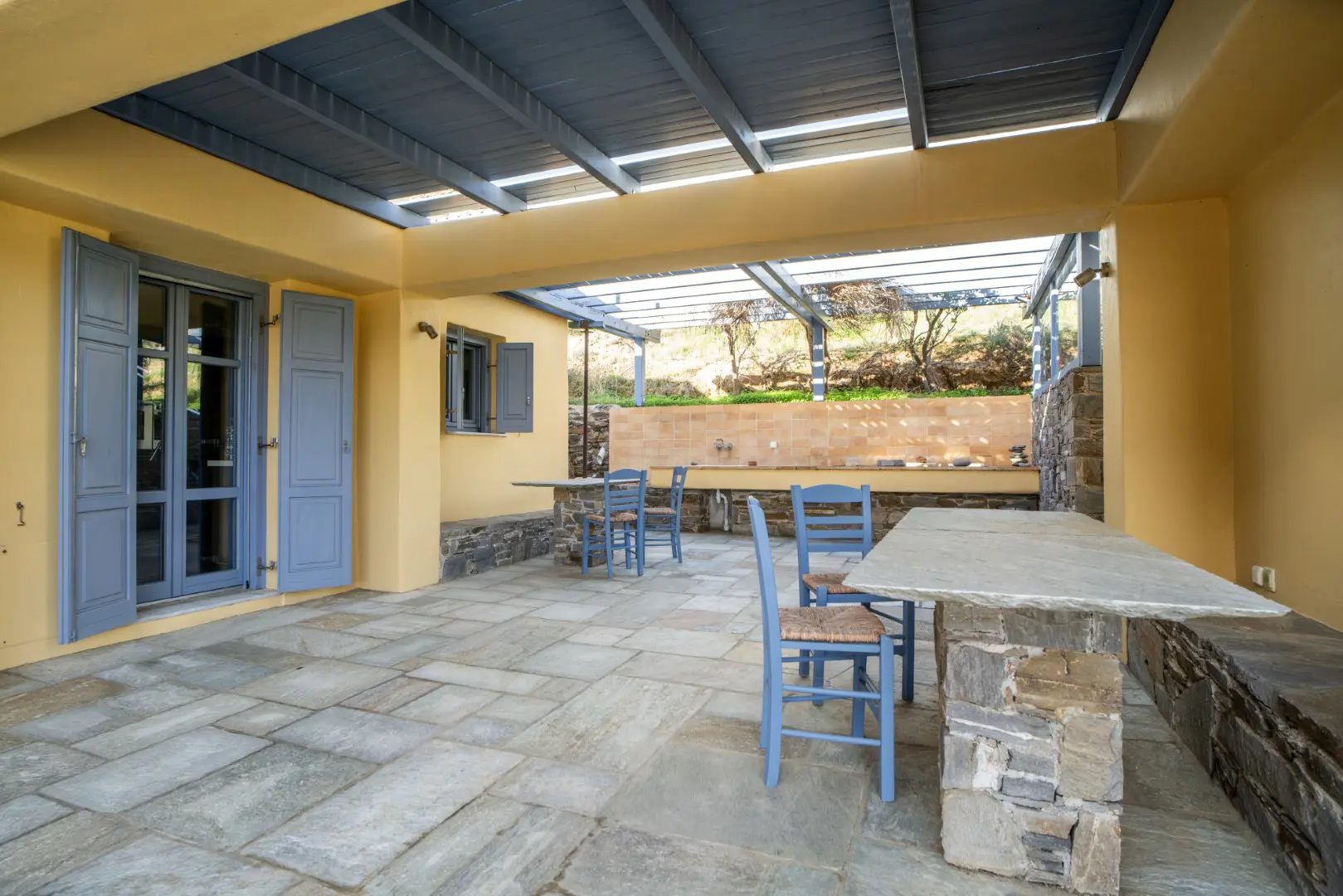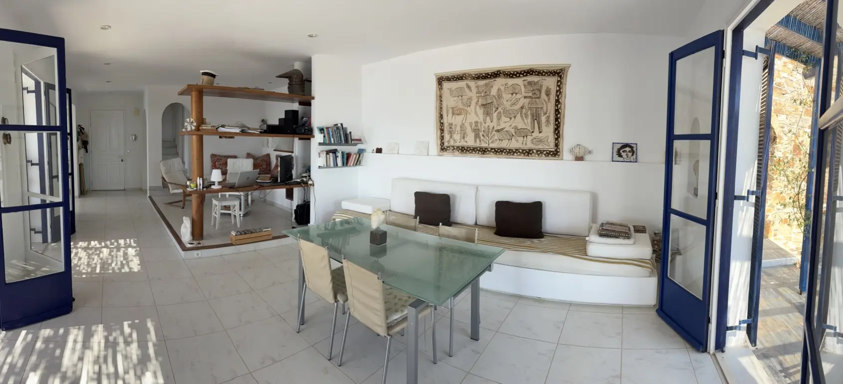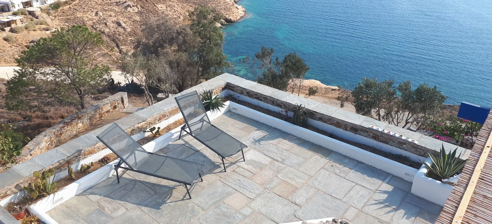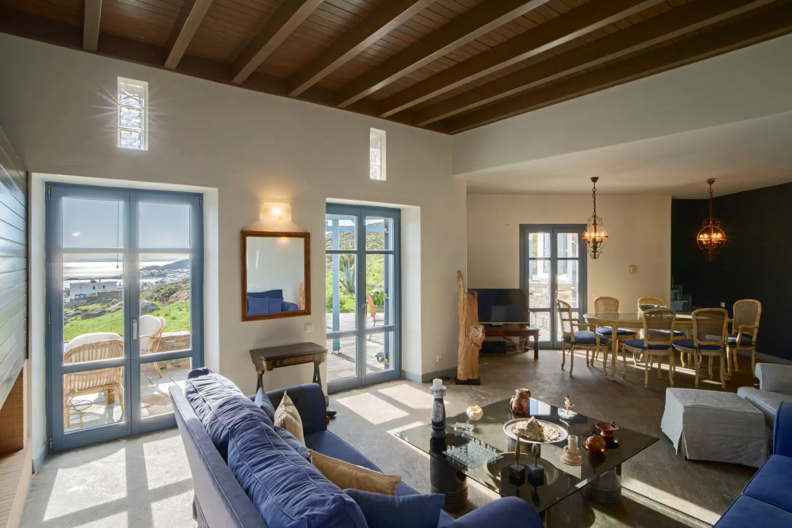 Beyond the charm of this architect-designed house, its location is highly practical: the small, nearly deserted beach just below the property makes the sea feel like this villa's private pool, the large beach of Livadi is only a 5-minute walk away, and the village is 3 minutes away by car.