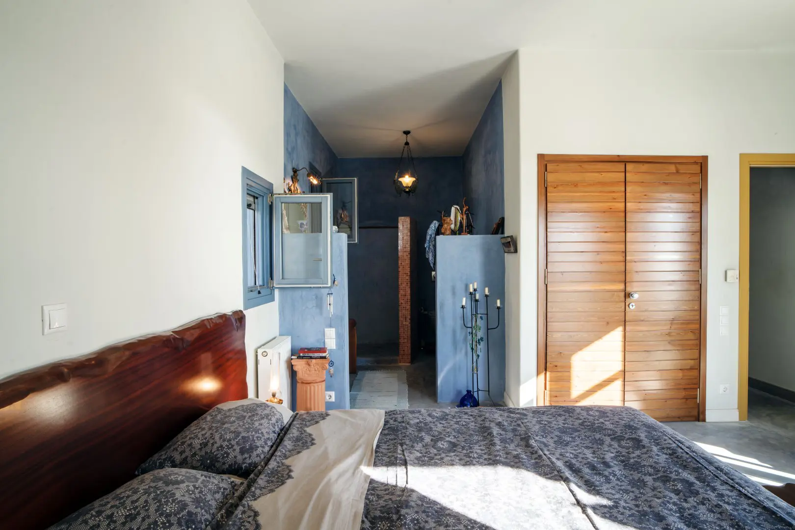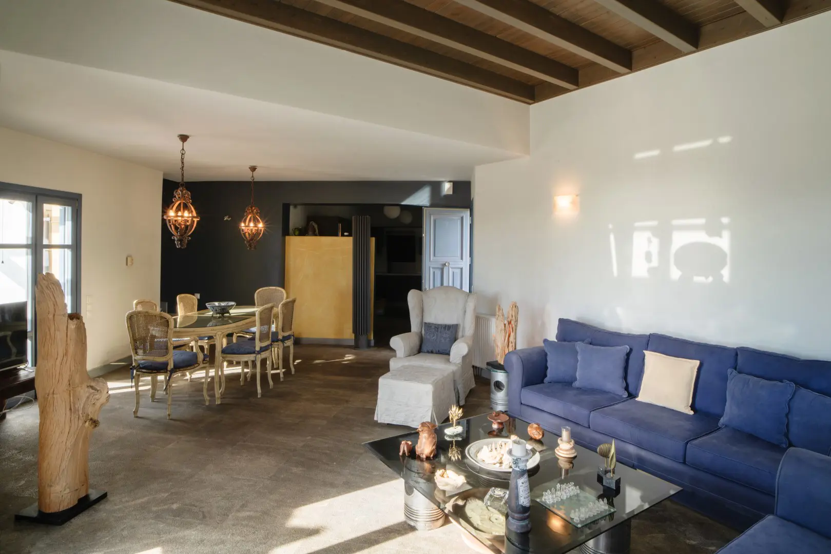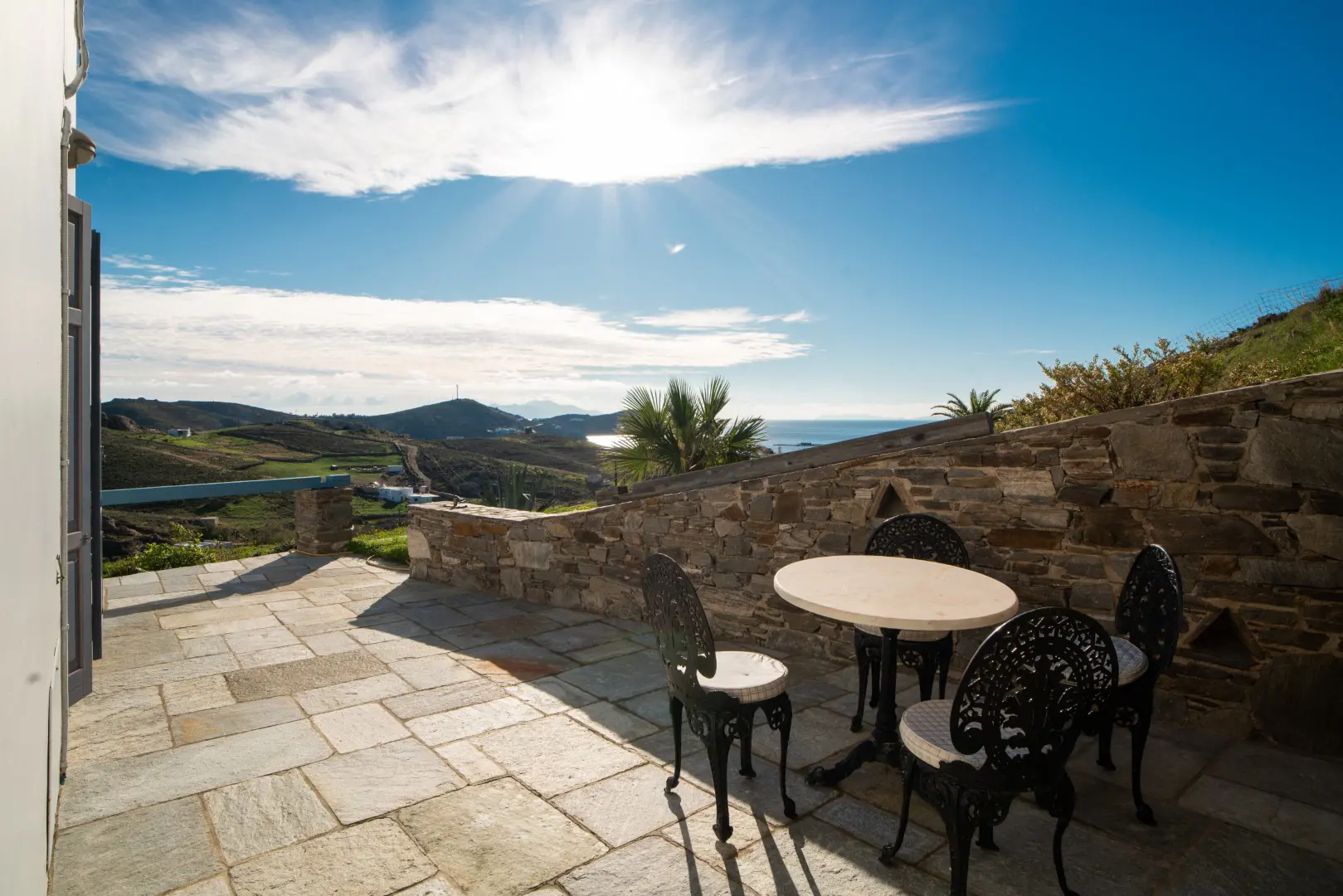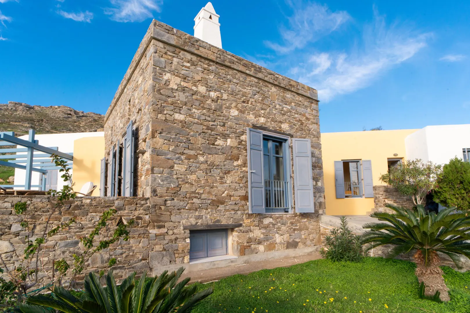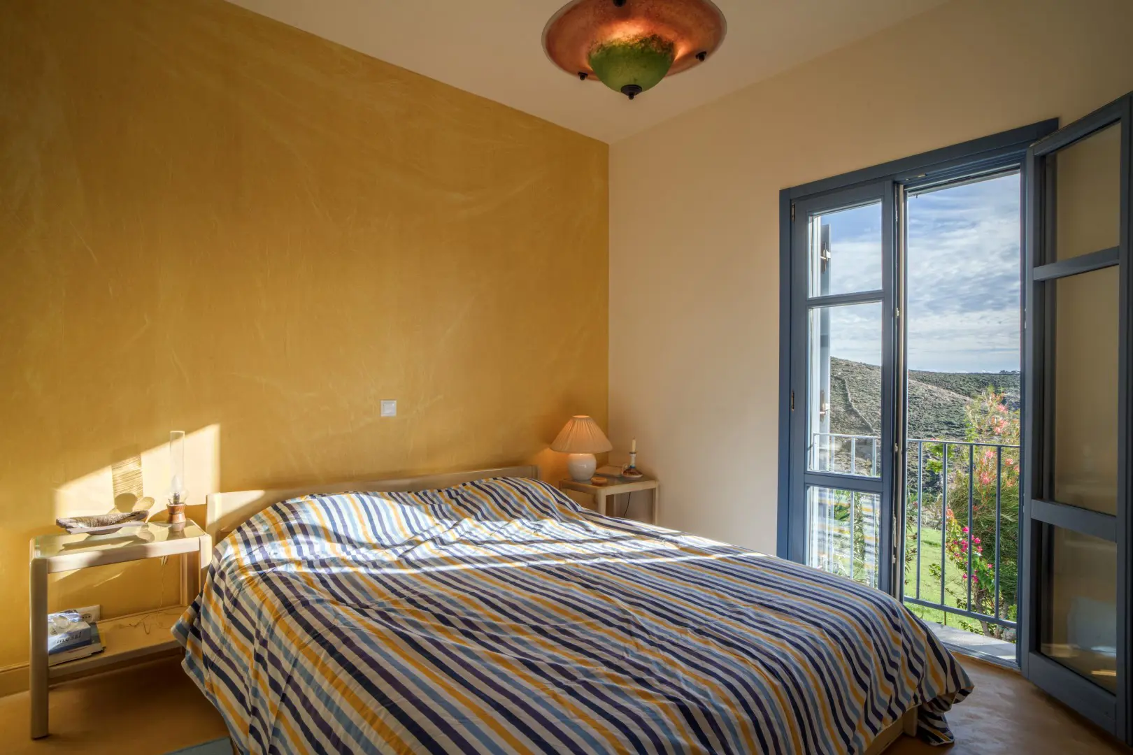 Beyond the charm of this architect-designed house, its location is highly practical: the small, nearly deserted beach just below the property makes the sea feel like this villa's private pool, the large beach of Livadi is only a 5-minute walk away, and the village is 3 minutes away by car.