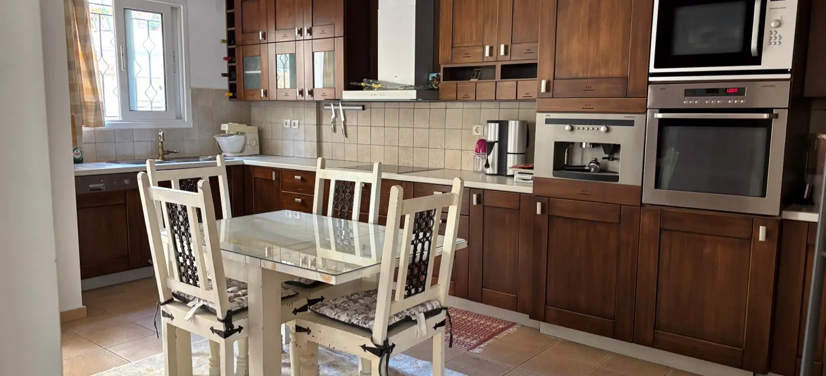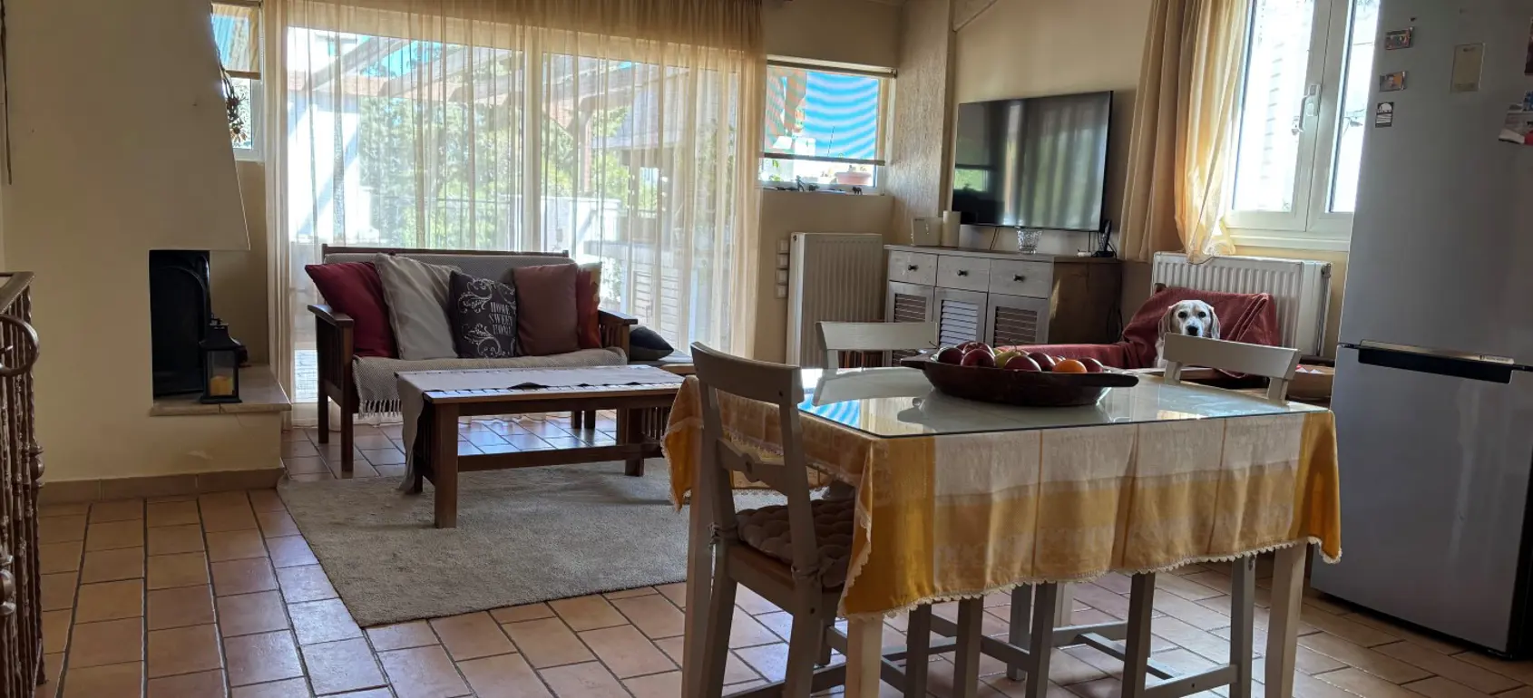 On the raised ground floor there is a living spacious area with a fireplace, serving as the central gathering space. Separate spacious kitchen with a small storage area and a wc.
