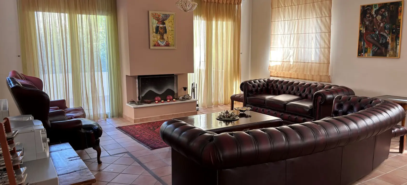 Semi-Basement 131sqm (64 sqm, legalized as main areas) with a living room equipped with a fireplace, providing a cozy ambiance, a kitchen and a wc. There is also a storage area a staff room as well as the boiler room.