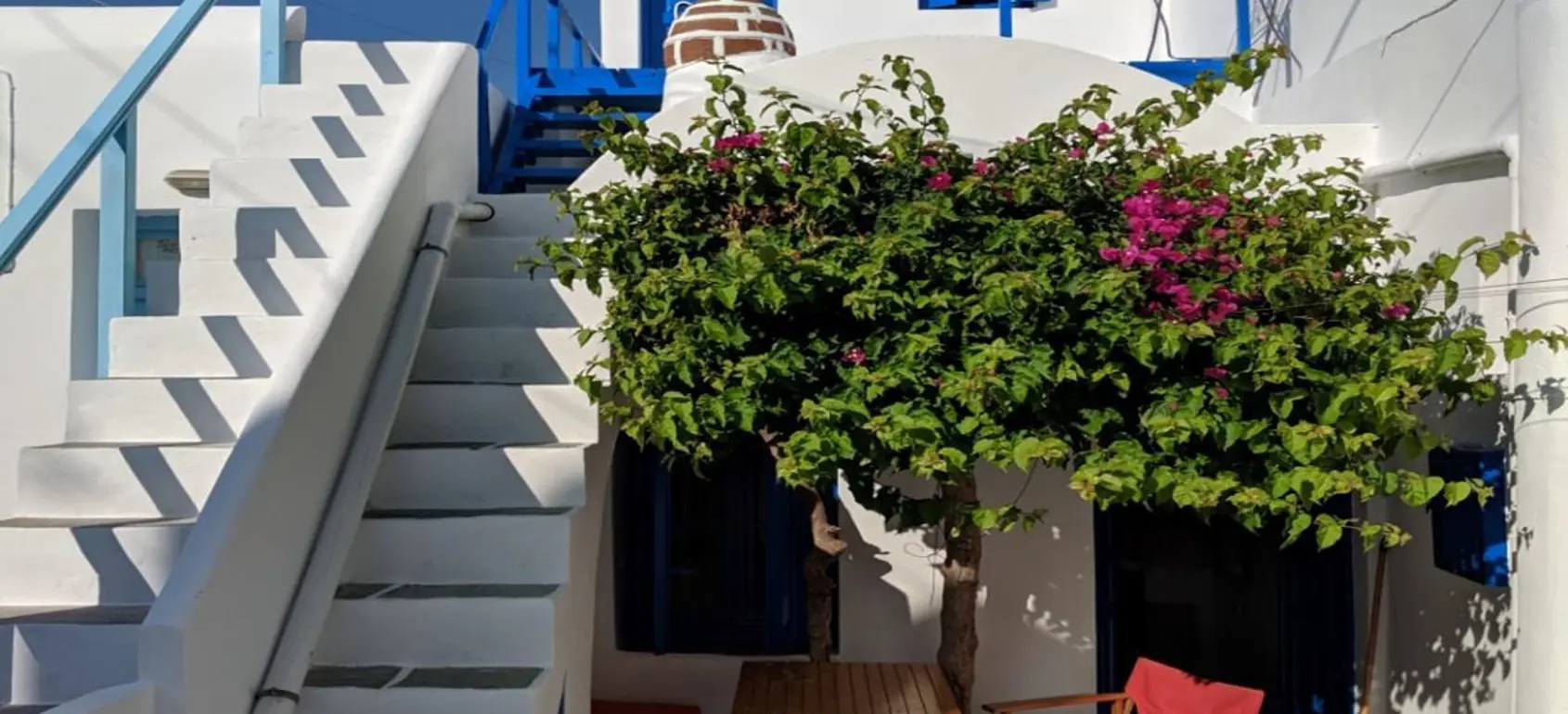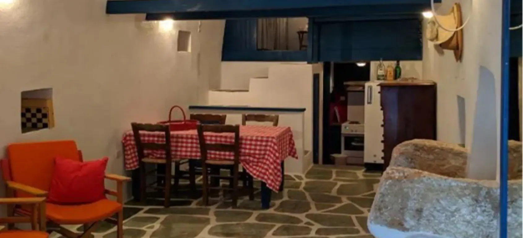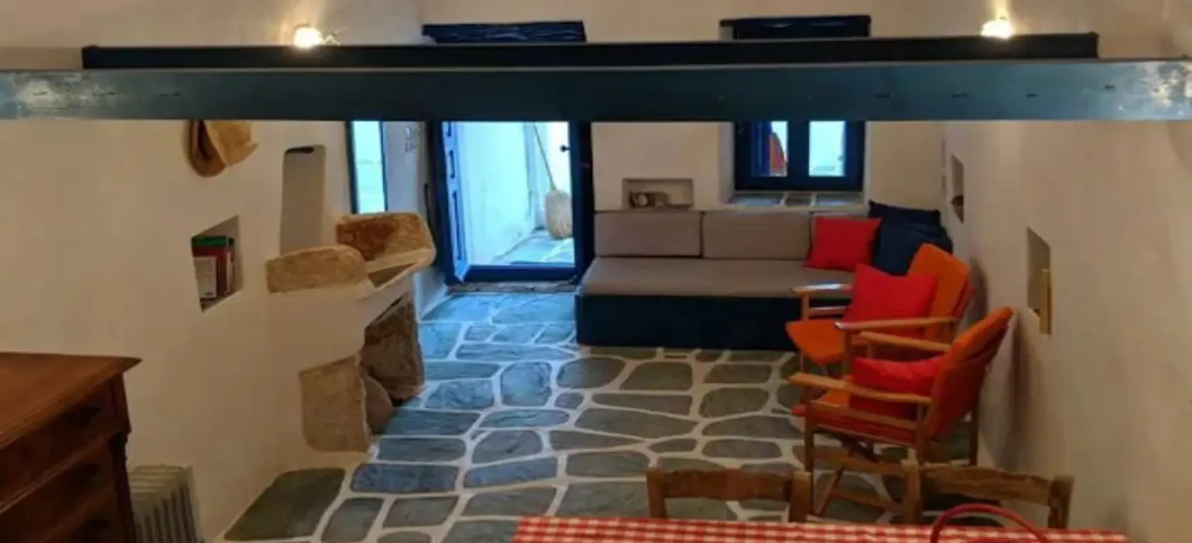 The house has all the necessary equipment for a nice and cozy stay in the Chora of Folegandros. The house has a really nice temperature all year round due to the very thick and old walls, and also has air-conditioning for heating and cooling, as well as a solar heater for the hot water. The stone floor gives this real Greek feeling and the bougainvillea outside gives shade and beauty to the house patio. The upper floor apartment lacks kitchen but has its own bathroom and has a splendid view over the magnificent church on the mountain top. It is quite simple with two sofa beds, a small table, some chairs, and a fridge, and it has its own entrance from the terrace, so it can be used for Airbnb, even if you are staying in the main part of the house.