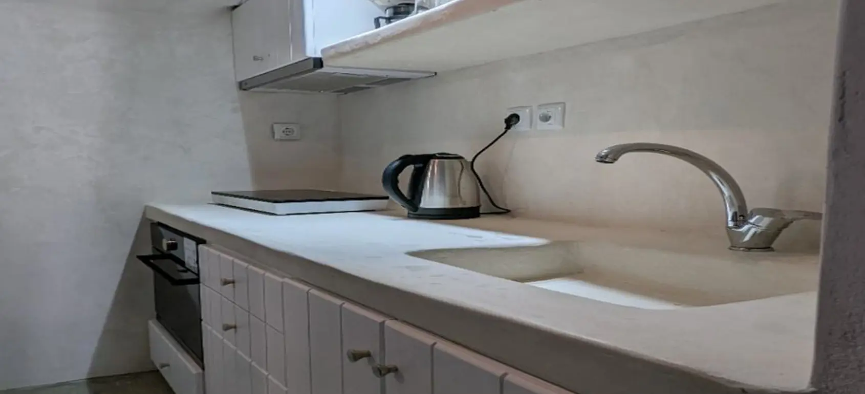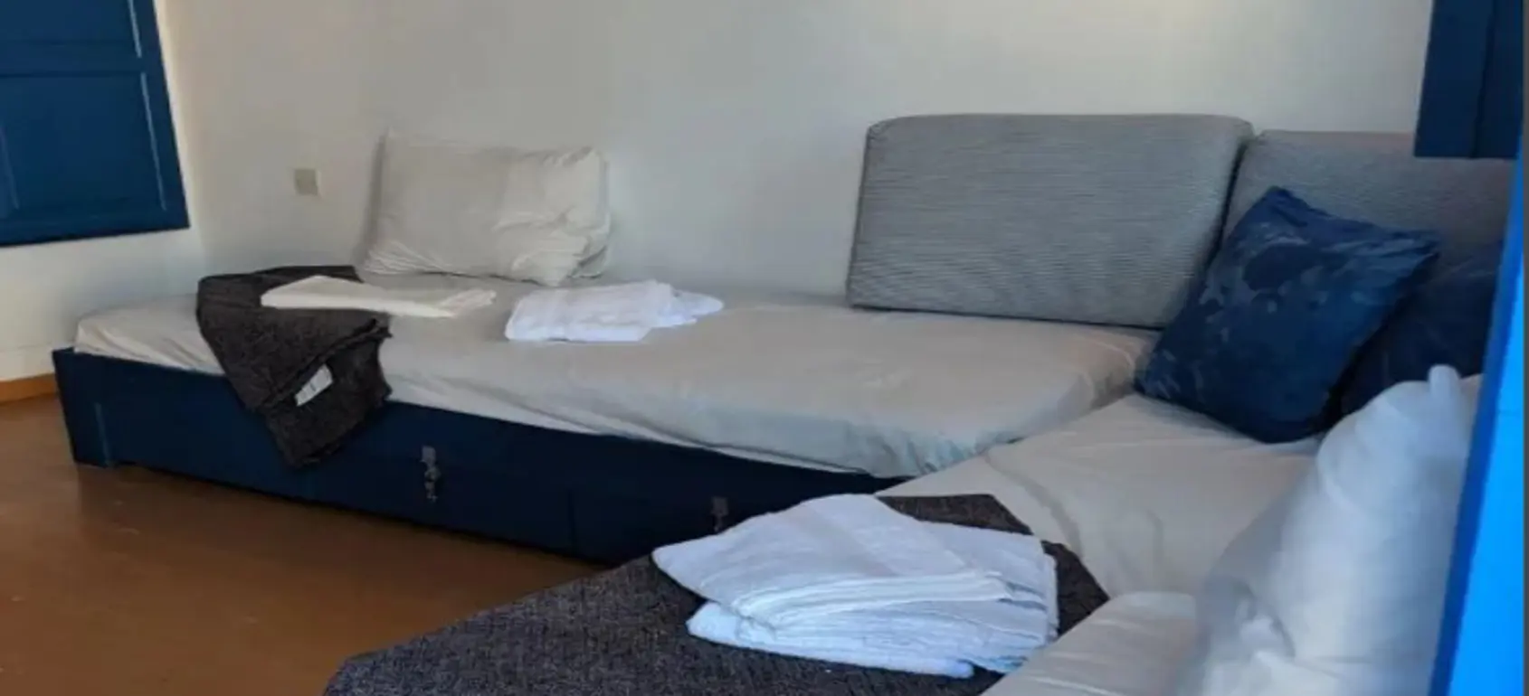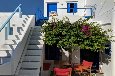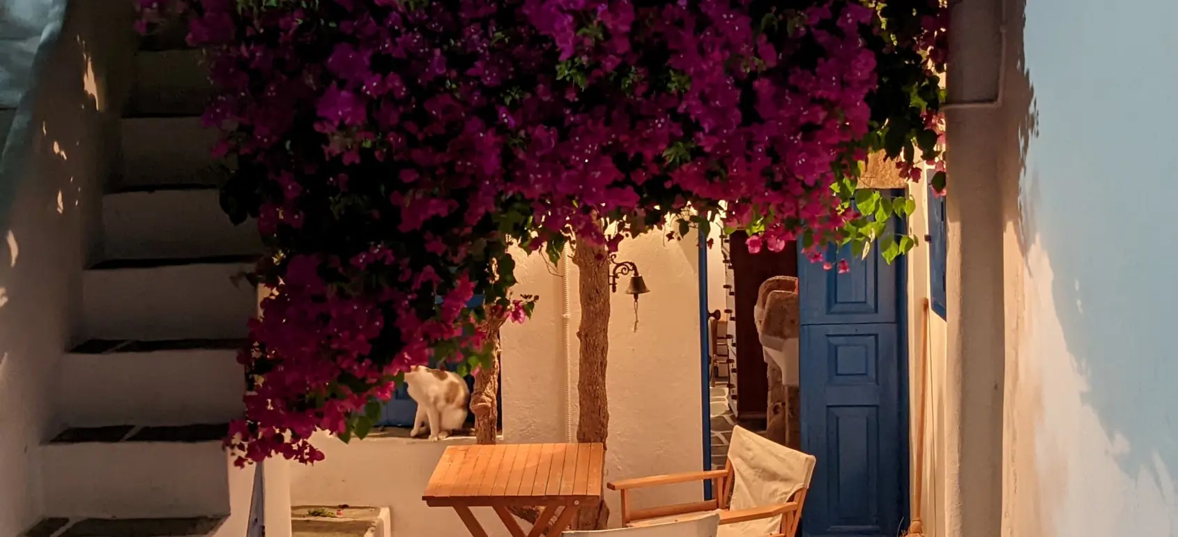 The house has all the necessary equipment for a nice and cozy stay in the Chora of Folegandros. The house has a really nice temperature all year round due to the very thick and old walls, and also has air-conditioning for heating and cooling, as well as a solar heater for the hot water. The stone floor gives this real Greek feeling and the bougainvillea outside gives shade and beauty to the house patio. The upper floor apartment lacks kitchen but has its own bathroom and has a splendid view over the magnificent church on the mountain top. It is quite simple with two sofa beds, a small table, some chairs, and a fridge, and it has its own entrance from the terrace, so it can be used for Airbnb, even if you are staying in the main part of the house.