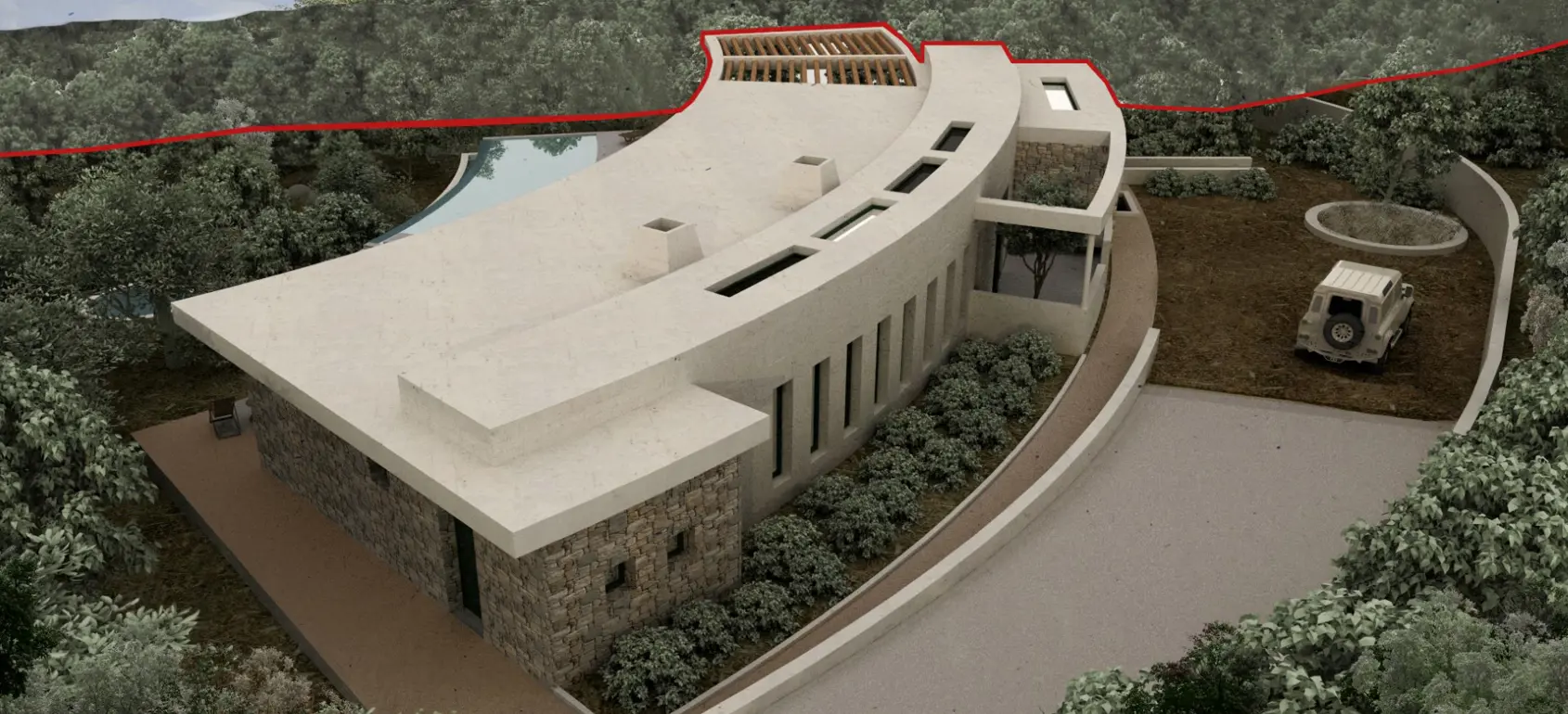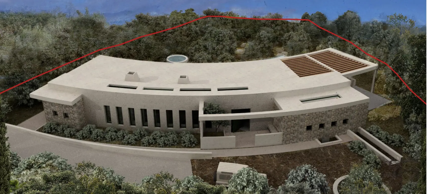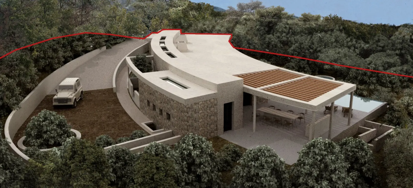 Great located plot with full planning permission. A Flowing Sanctuary: Curved Architecture Embracing the Ionian Horizon, seamlessly blending indoor and outdoor living. This beautifully designed villa offers two bedrooms, including a master suite with an en-suite bathroom, a spacious kitchen, a stylish living room, and seamless indoor-outdoor living with a large patio and covered courtyard. Enjoy breathtaking views of the olive grove and Ionian Sea, complemented by a refreshing private pool. A charming independent guesthouse provides extra privacy, featuring a cozy living area, a fully equipped kitchenette, and a private terrace - perfect for guests or quiet retreats. Practical features include ample storage, a private laundry room, and a dedicated water tank to ensure a reliable supply year-round.