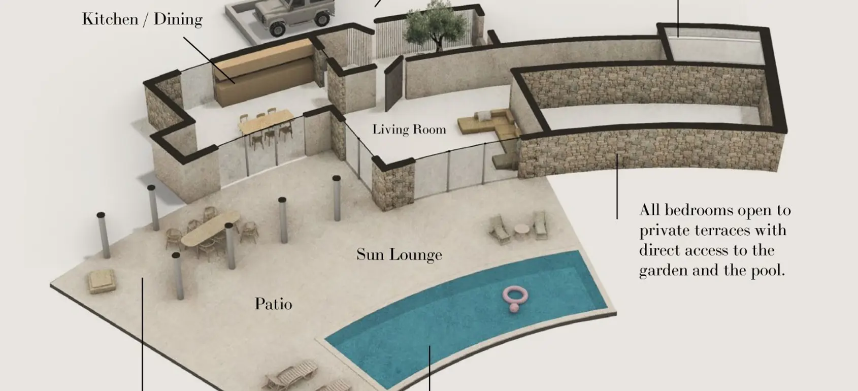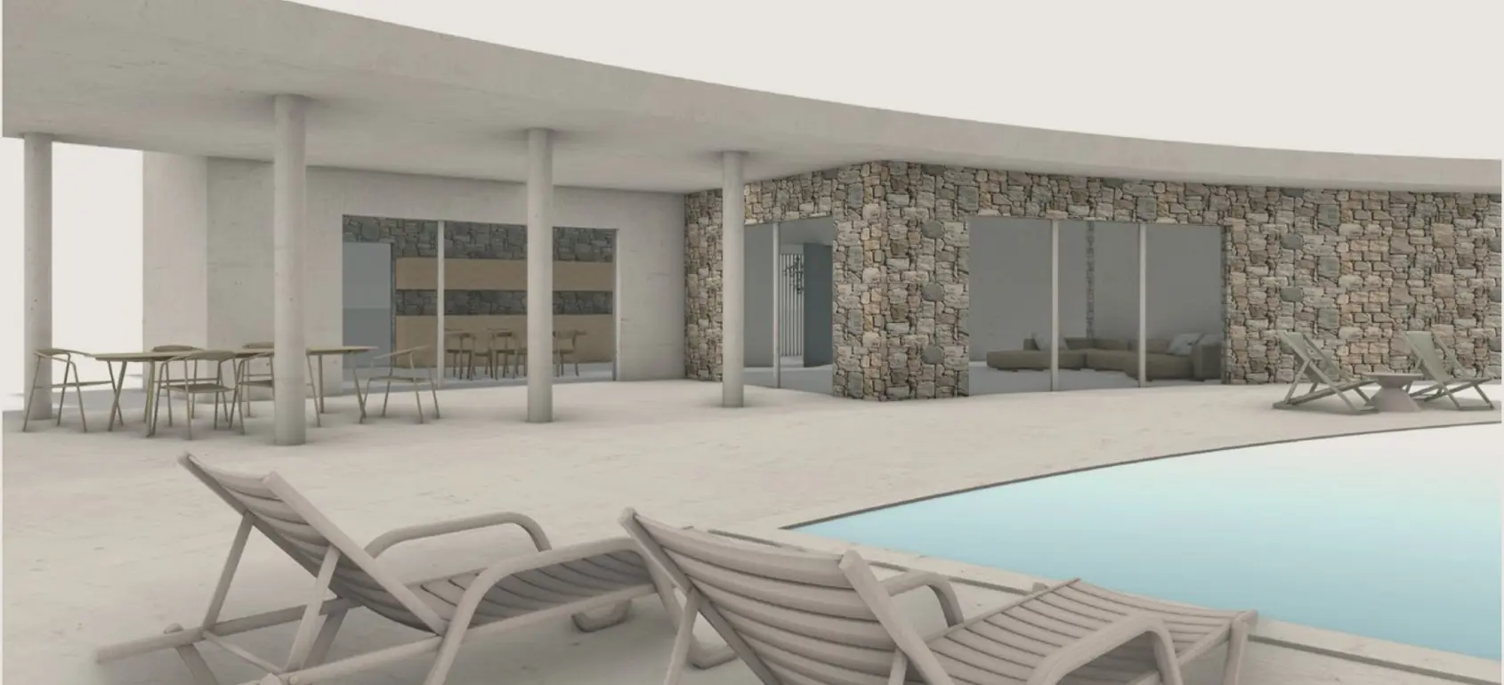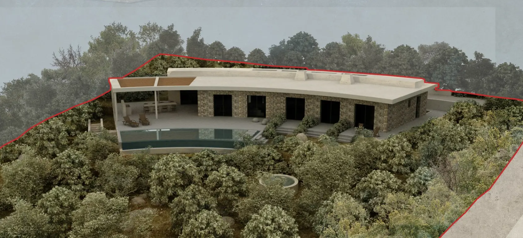 Great located plot with full planning permission. A Flowing Sanctuary: Curved Architecture Embracing the Ionian Horizon, seamlessly blending indoor and outdoor living. This beautifully designed villa offers two bedrooms, including a master suite with an en-suite bathroom, a spacious kitchen, a stylish living room, and seamless indoor-outdoor living with a large patio and covered courtyard. Enjoy breathtaking views of the olive grove and Ionian Sea, complemented by a refreshing private pool. A charming independent guesthouse provides extra privacy, featuring a cozy living area, a fully equipped kitchenette, and a private terrace - perfect for guests or quiet retreats. Practical features include ample storage, a private laundry room, and a dedicated water tank to ensure a reliable supply year-round.