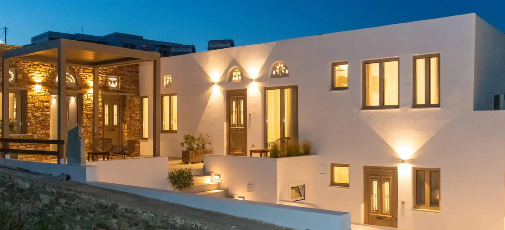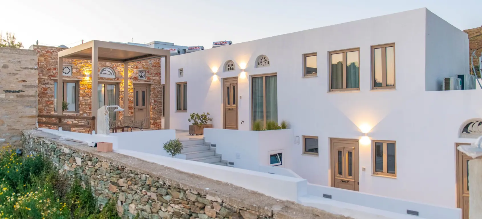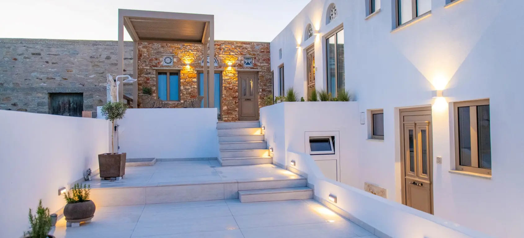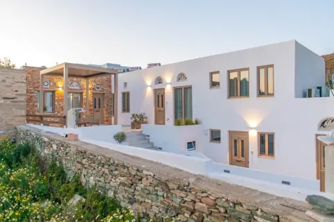 Tinos is a Greek Cycladic Island with long tradition in art, natural beauty, culture, fine cuisine and agricultural production of Mediterranean products that remains authentic. Clinging to mountainsides, the island’s whitewashed villages and hundreds of churches and chapels represent a fine example of Cycladic architecture. At every turn one discovers narrow cobble stoned passages, blooming gardens, fountains and chapels. Many of the villages have been given the status of traditional settlements. Beaches are filled by the unique silver-green sand of the island and wetted by crystal clear waters. Art and festivals are blended into the day-to-day life of the island throughout the year. The property is located in the heart of beautiful Tinos, in the picturesque and peaceful village of Spitalia. The location combines the serenity of the village with easy access to some of the island’s most enchanting beaches, such as the nearby Stavros and Kionia, Kolymbithra with its crystal-clear waters and beach bars, Agios Fokas, Pachia Ammos, and Livadia.