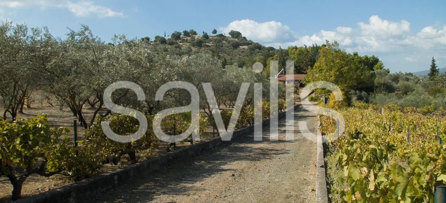 The farm contains 128 olive trees of various varieties (mainly Megaritiko, Manakia, etc.) in full fruiting, all suitable for the climate of the area with the aim of producing high-quality olive oil, as well as a vineyard in full production with excellent varieties of wine grapes (mainly Nemea (Agioreitiko), Moschofilero, Cabernet, Roditis, Raisin, etc.). The annual production of oil amounts to 1,000 liters and of wine to 2 tons. It also has wild vegetation, ornamental plants and trees. The house of anti-seismic construction by the CANADIAN company was built in 1991 all with insulating materials and has a tiled roof, also insulated. The frames are from 2010 made of aluminum with double glazing and sliding screens. For heating, it has a radiator, consisting of a 36,000 calorie boiler, burner, metal oil tank, boiler and piping network with radiators, all made in Germany. It also has a fireplace of excellent construction. It also has air conditioners, all cooling-heating inverters, made in Japan by MITSUBISHI. For hot water, in addition to the boiler, it also has a solar water panel, which heats through the sun, the radiator and through electricity. The kitchen is all with built-in furniture, all made of solid oak wood. Also near the kitchen, there is an outdoor built oven and stone paved around the house. The house has two bedrooms with built-in wardrobes, two bathrooms lined with Italian tiles, and a kitchen with a living room and dining room. Finally, the house has many auxiliary spaces (storage rooms, garages, all covered with tiled roofs). The 58 sqm garage can accommodate three cars, agricultural machinery and motorcycles. In addition, there are: • 2 sheds of 68 sqm and 15 sqm • 1 additional storage room of 18 sqm • 1 second independent residence of 31 sqm (with tiled roof, kitchen, bathroom with water heater, air conditioning, stove, small storage room, loft and a bedroom) • 2 smaller storage rooms of 12 sqm and 8 sqm • 1 pumping station of 11 sq m