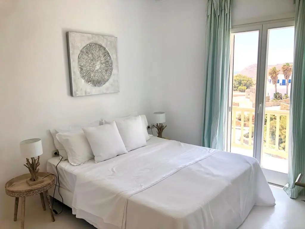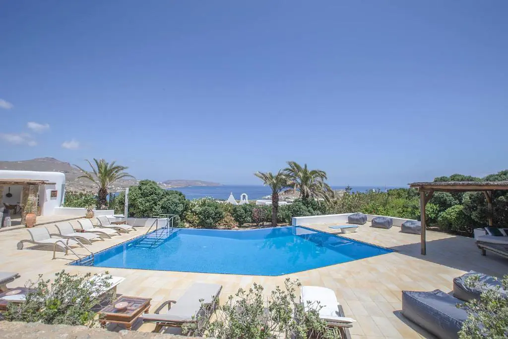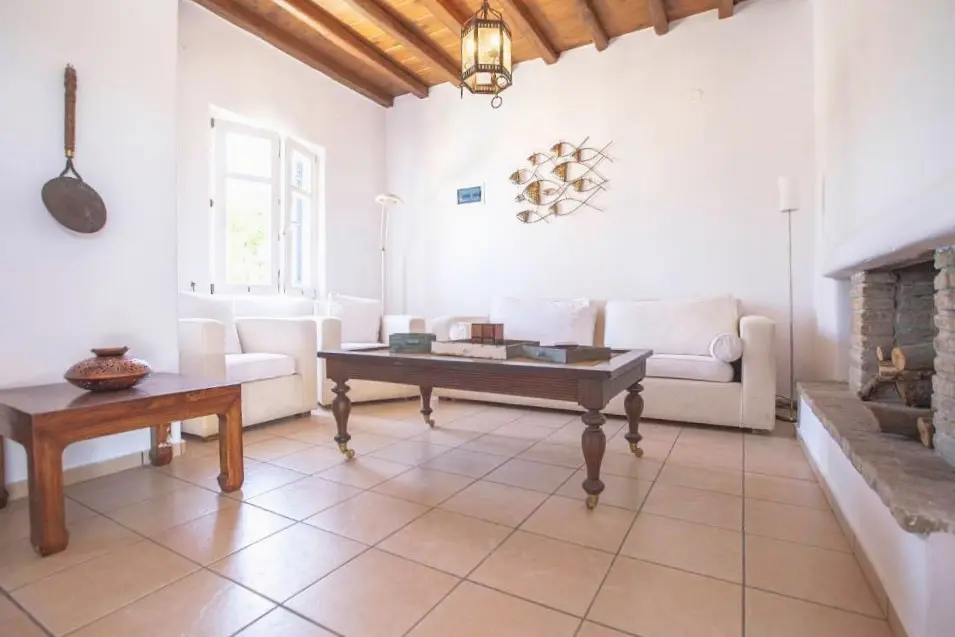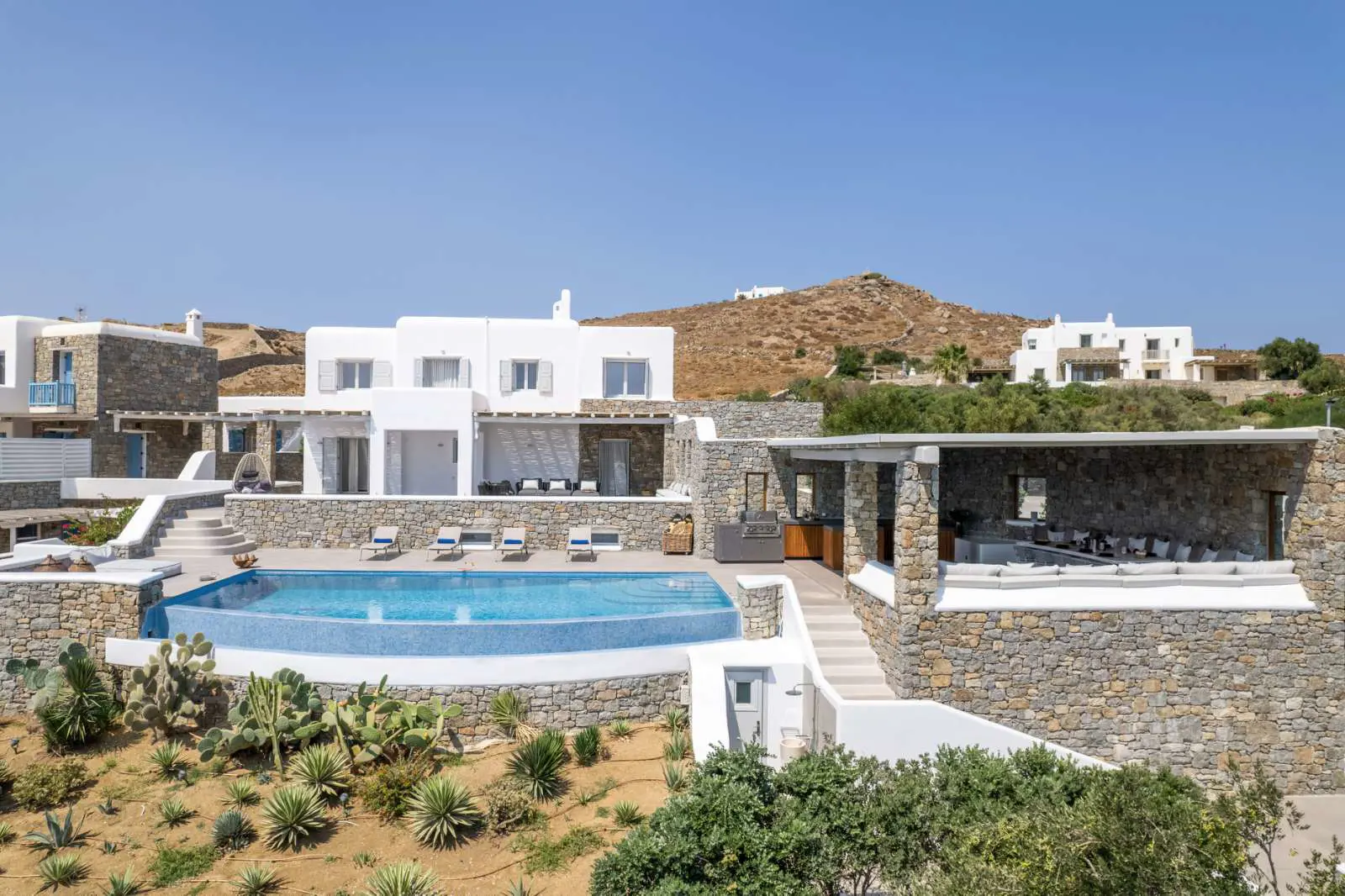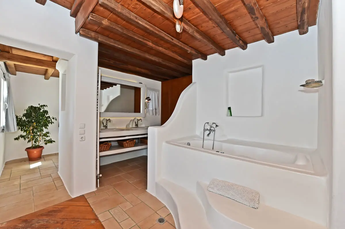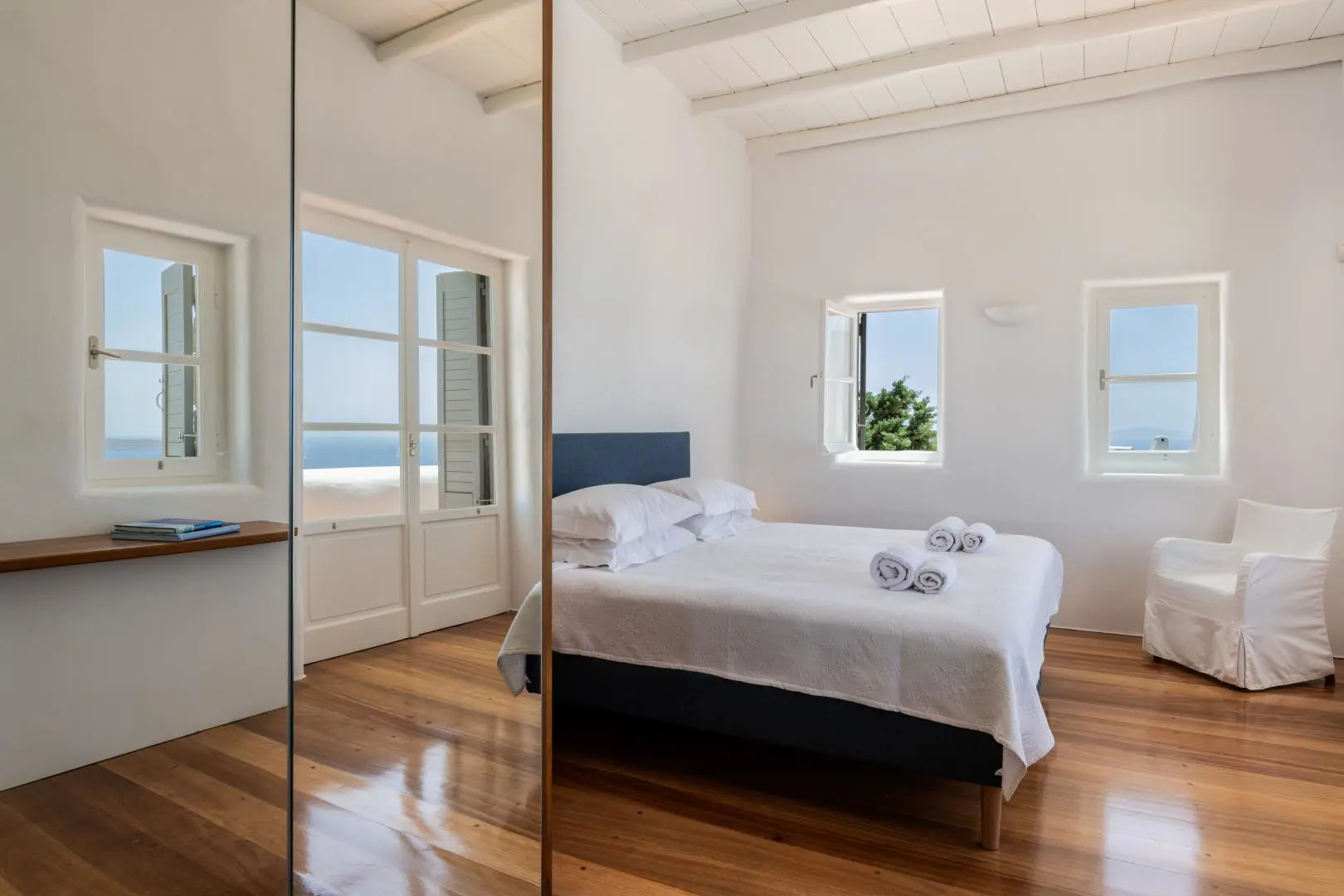 Located in Faros Armenistis area, this well-maintained villa of 500 sqm has 5 bedrooms and 4 bathrooms. The plot of 4,000 sqm, on which the property stands, has been fully landscaped. The plot includes a shaded, stone-built BBQ with dining area for up to 10 people and there is the swimming pool. The garden has an automatic irrigation system and the property is completely fenced. Only a few minutes away from the port and main town, the house provides sweeping views. Due to its strategic positioning, the property remains shielded from the prevailing north wind—an issue commonly experienced on the island. This advantageous placement results in both reduced maintenance expenses and minimal humidity worries. The nearest beach, Houlakia, is only at 3 km distance.