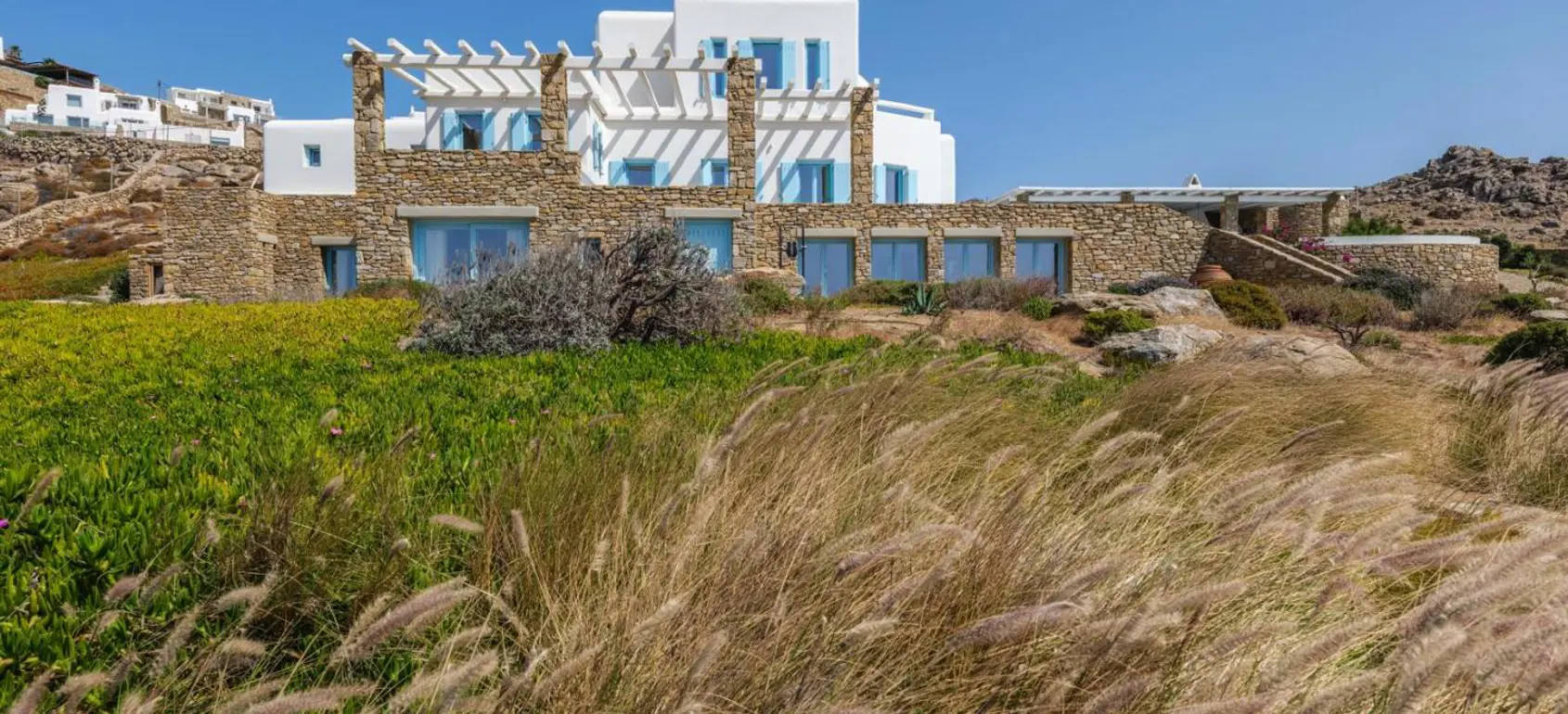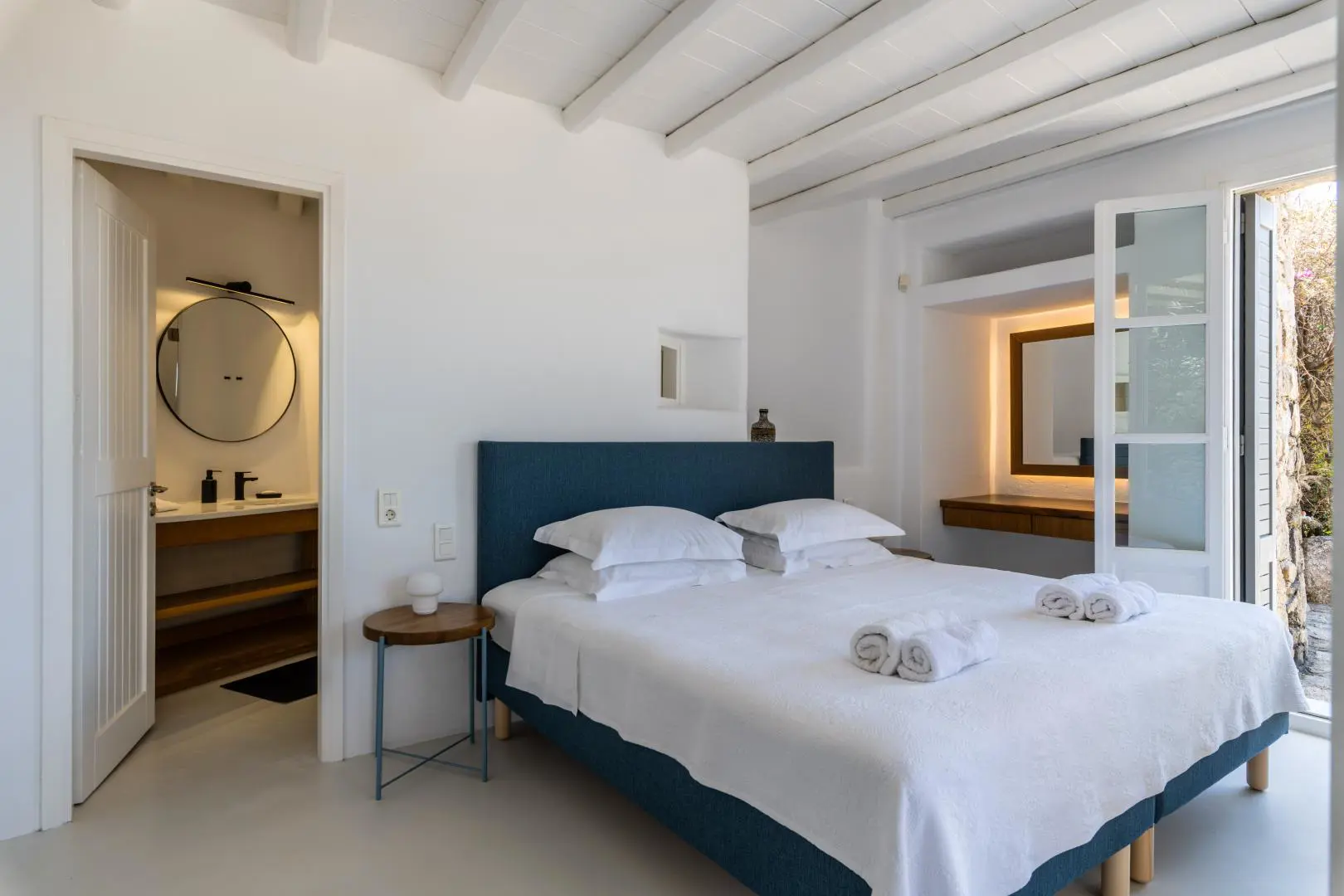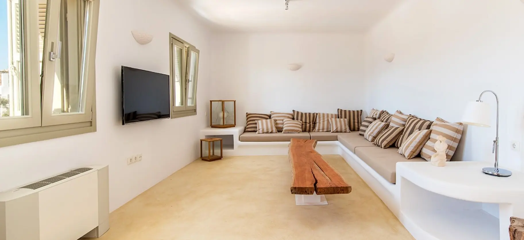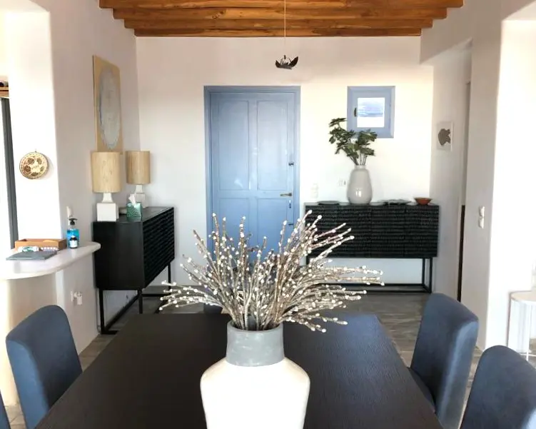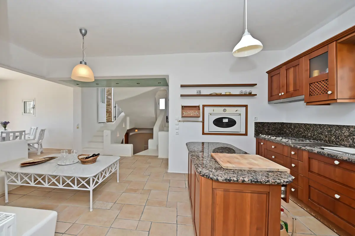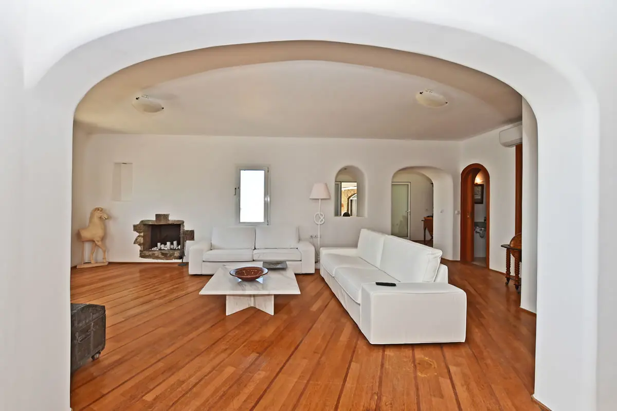 Located in Faros Armenistis area, this well-maintained villa of 500 sqm has 5 bedrooms and 4 bathrooms. The plot of 4,000 sqm, on which the property stands, has been fully landscaped. The plot includes a shaded, stone-built BBQ with dining area for up to 10 people and there is the swimming pool. The garden has an automatic irrigation system and the property is completely fenced. Only a few minutes away from the port and main town, the house provides sweeping views. Due to its strategic positioning, the property remains shielded from the prevailing north wind—an issue commonly experienced on the island. This advantageous placement results in both reduced maintenance expenses and minimal humidity worries. The nearest beach, Houlakia, is only at 3 km distance.