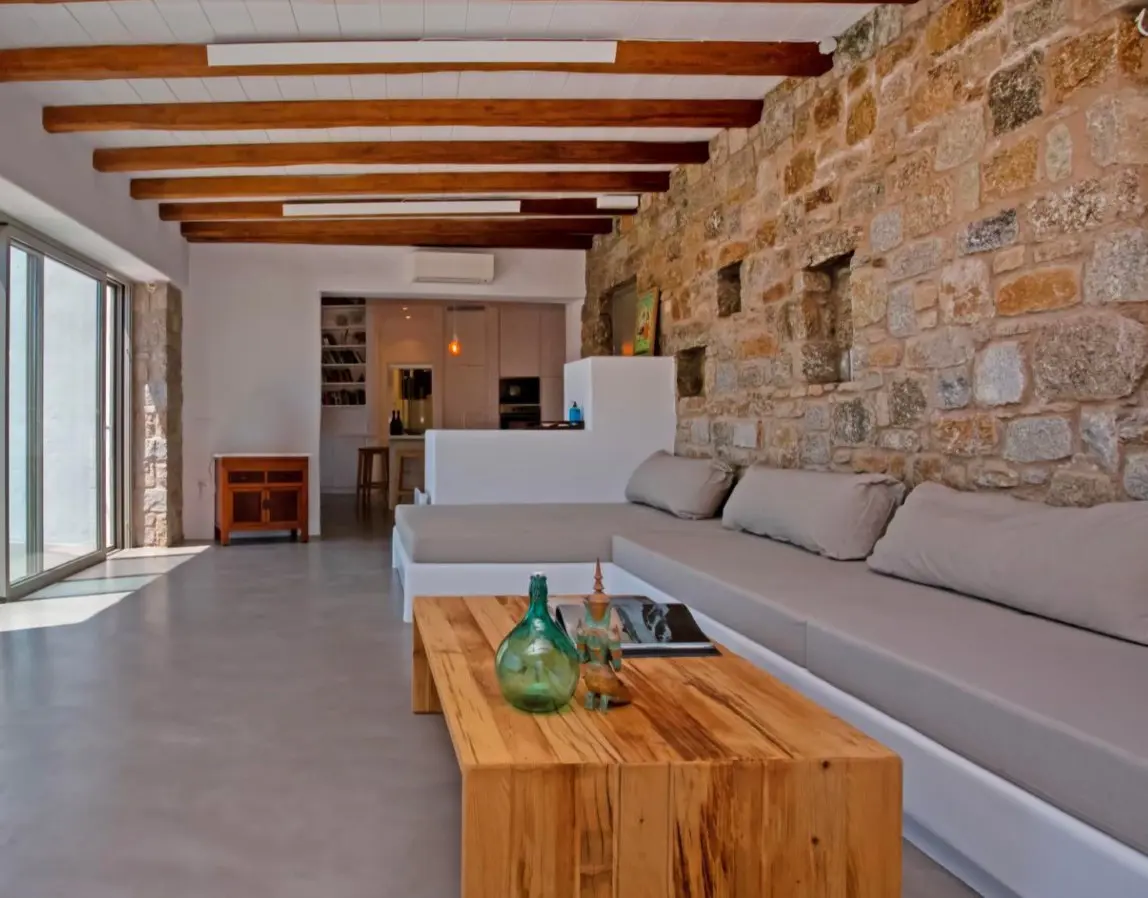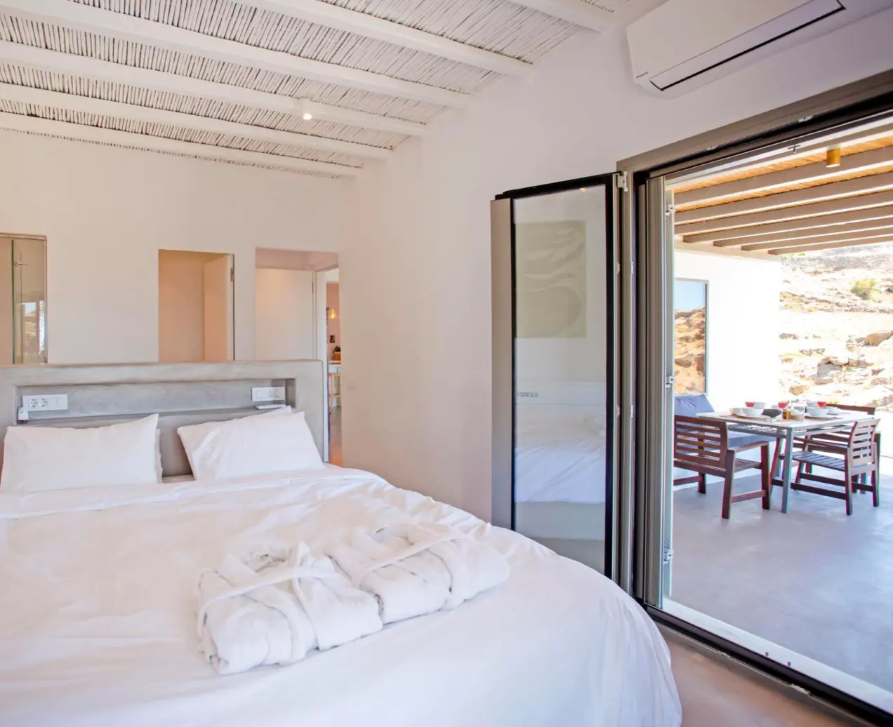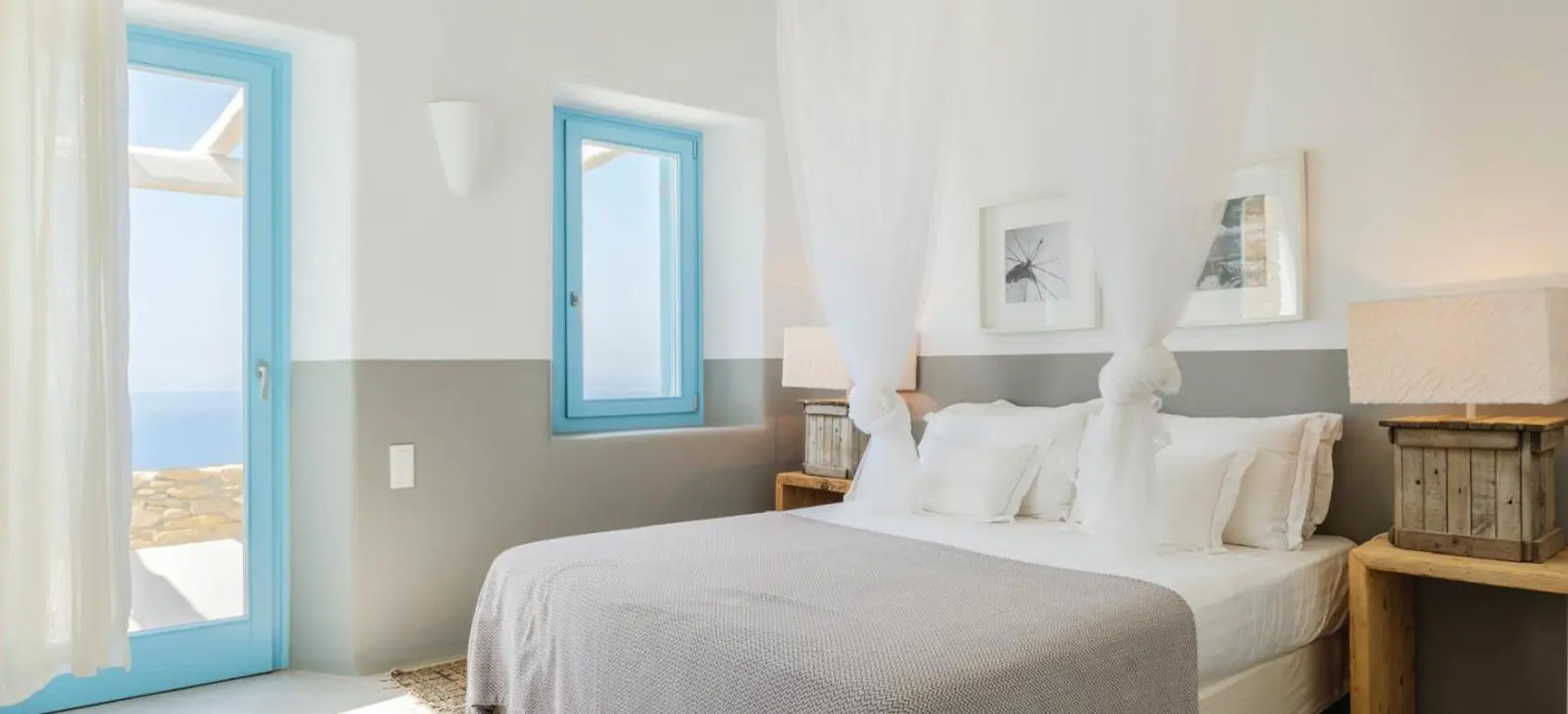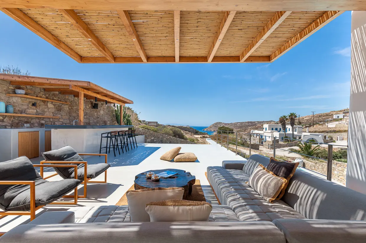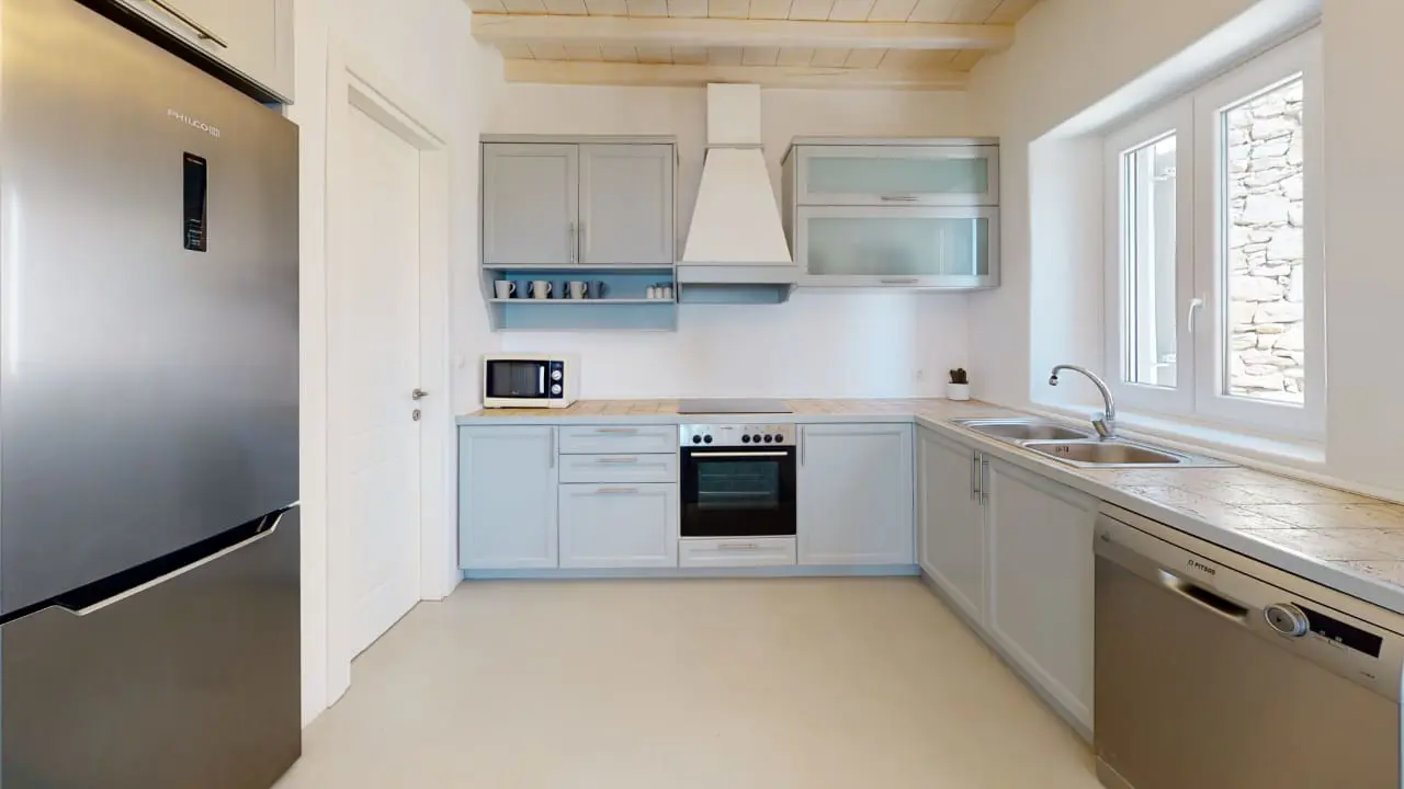 Located in Faros Armenistis area, this well-maintained villa of 500 sqm has 5 bedrooms and 4 bathrooms. The plot of 4,000 sqm, on which the property stands, has been fully landscaped. The plot includes a shaded, stone-built BBQ with dining area for up to 10 people and there is the swimming pool. The garden has an automatic irrigation system and the property is completely fenced. Only a few minutes away from the port and main town, the house provides sweeping views. Due to its strategic positioning, the property remains shielded from the prevailing north wind—an issue commonly experienced on the island. This advantageous placement results in both reduced maintenance expenses and minimal humidity worries. The nearest beach, Houlakia, is only at 3 km distance.